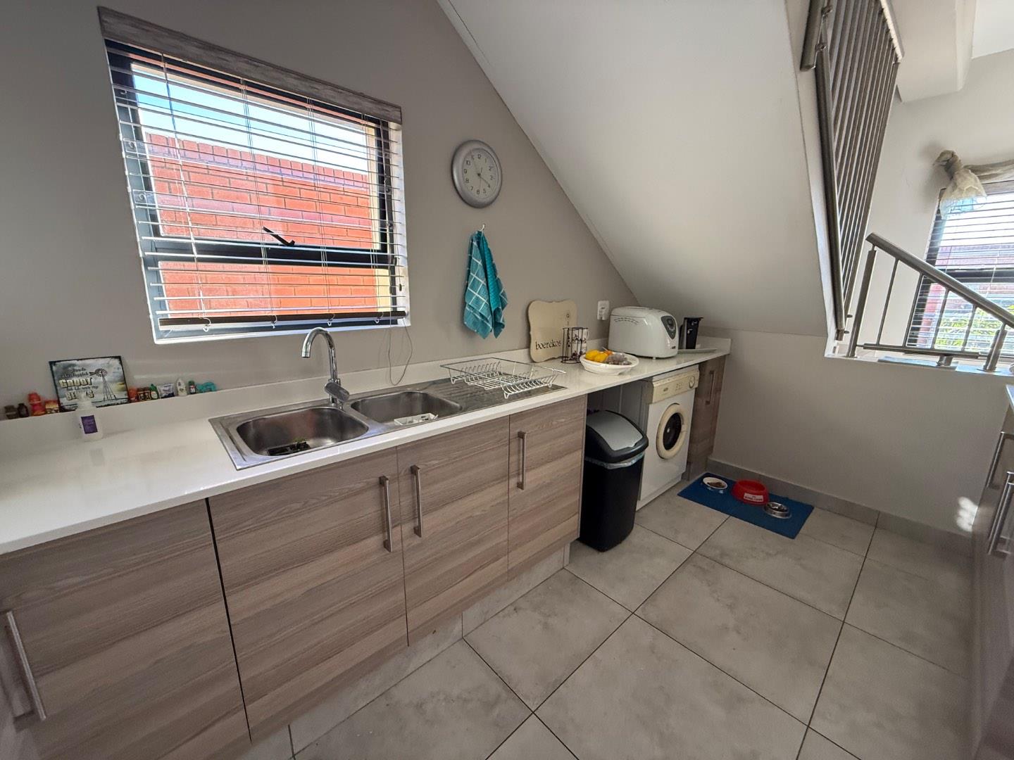 - Fully tiled garage with plumbing for a top-loader washing machine