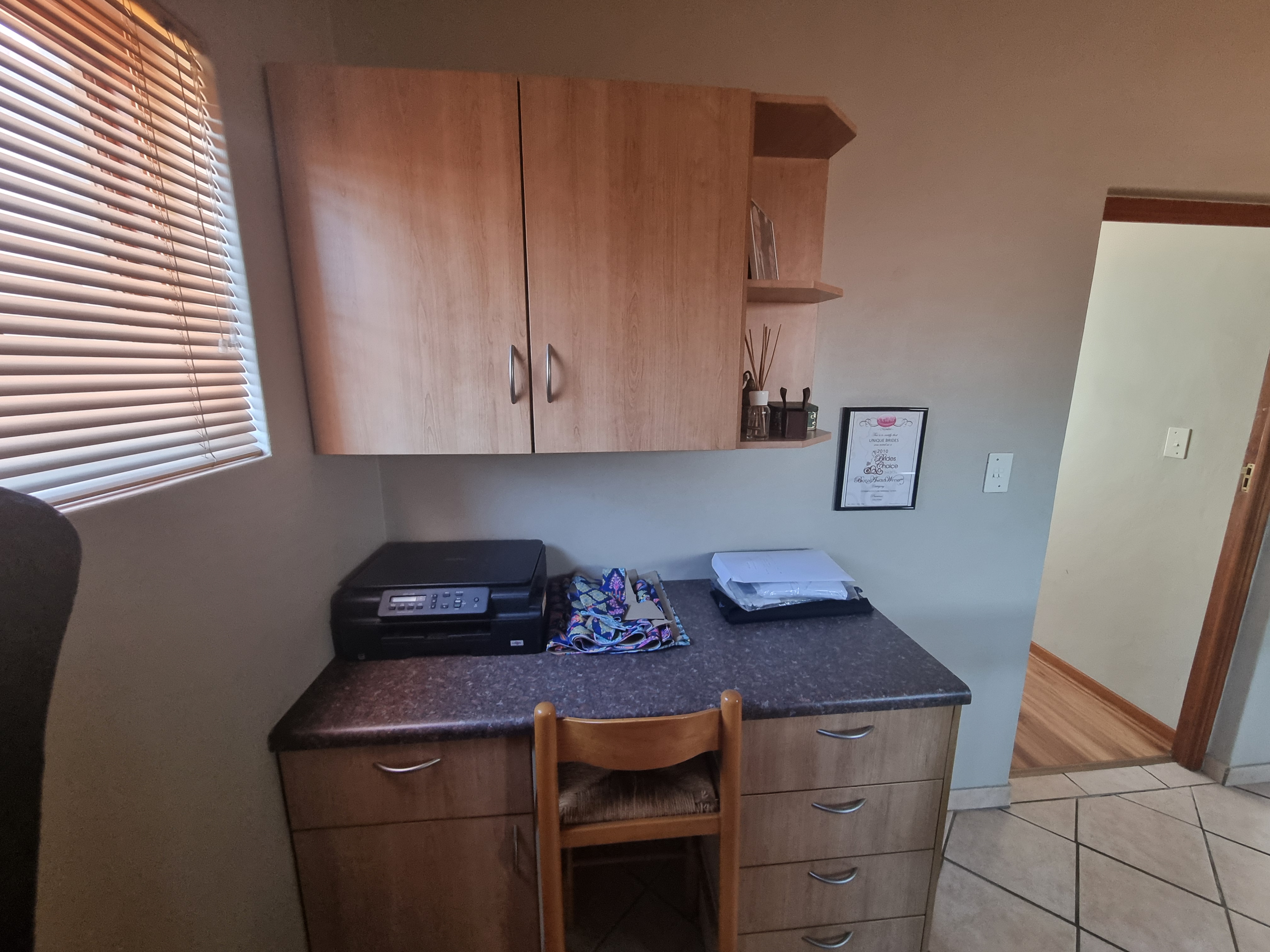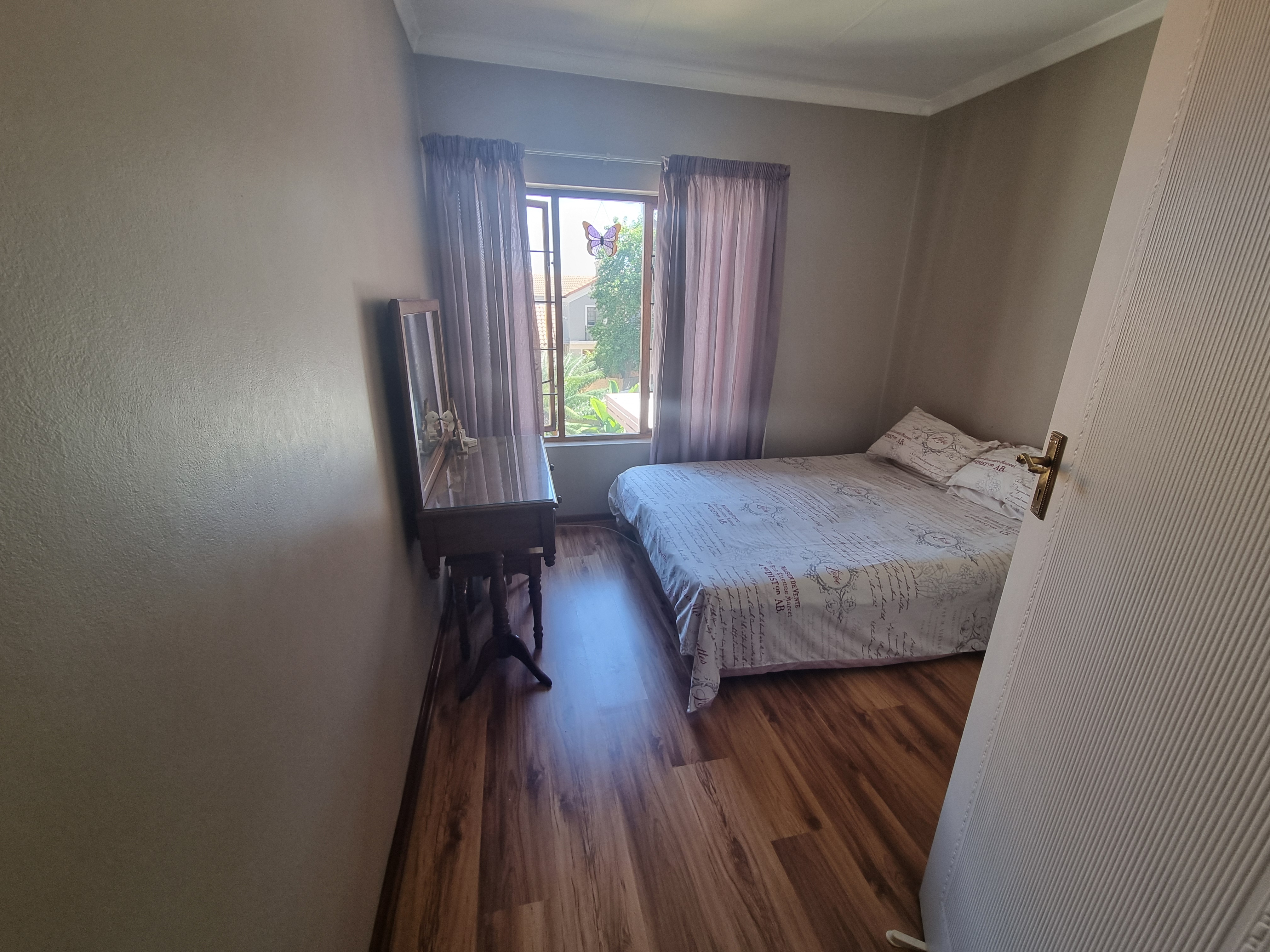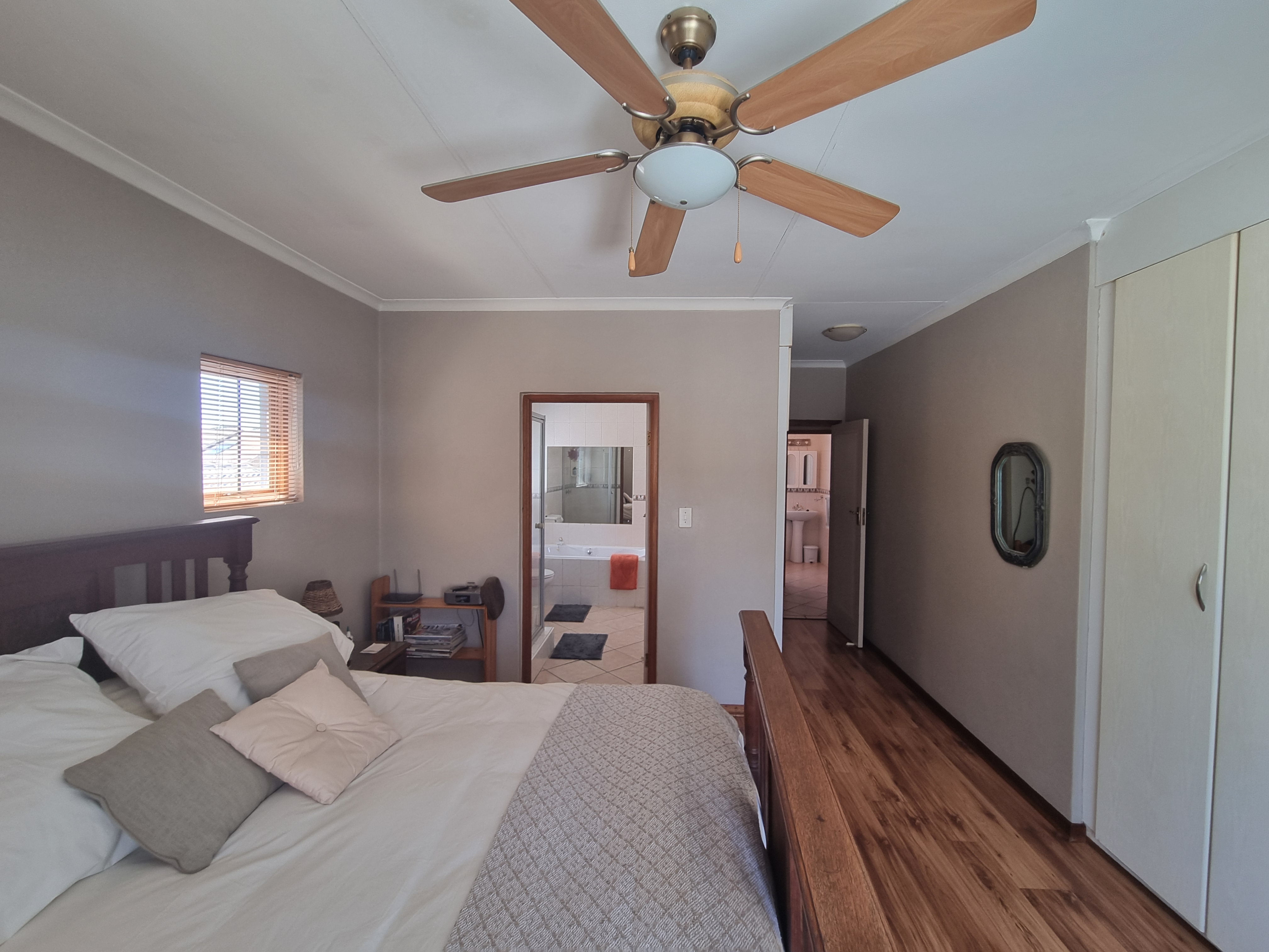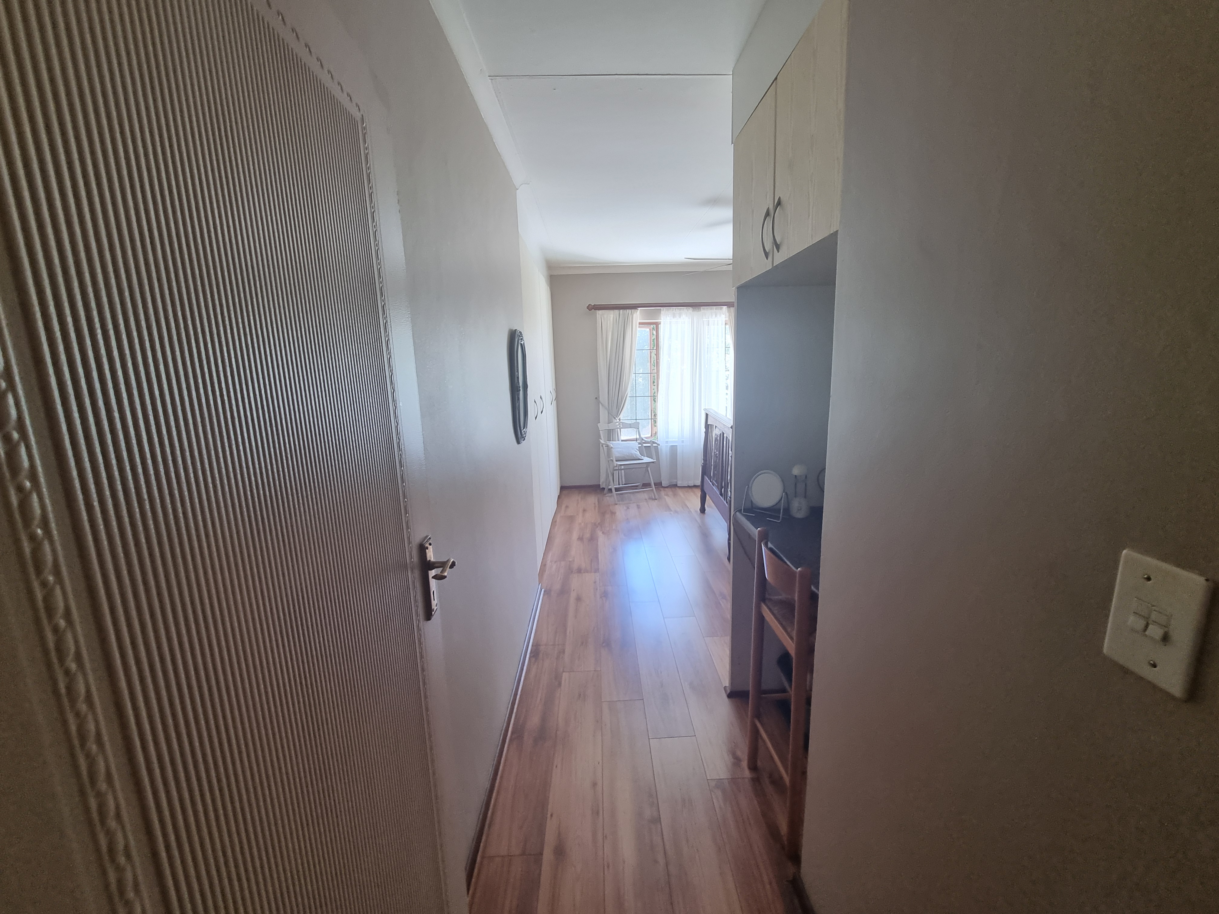 Each room features elegant wooden laminate flooring, enhancing the sense of space and cleanliness, complemented by built-in cupboards and a linen cupboard for extra storage.