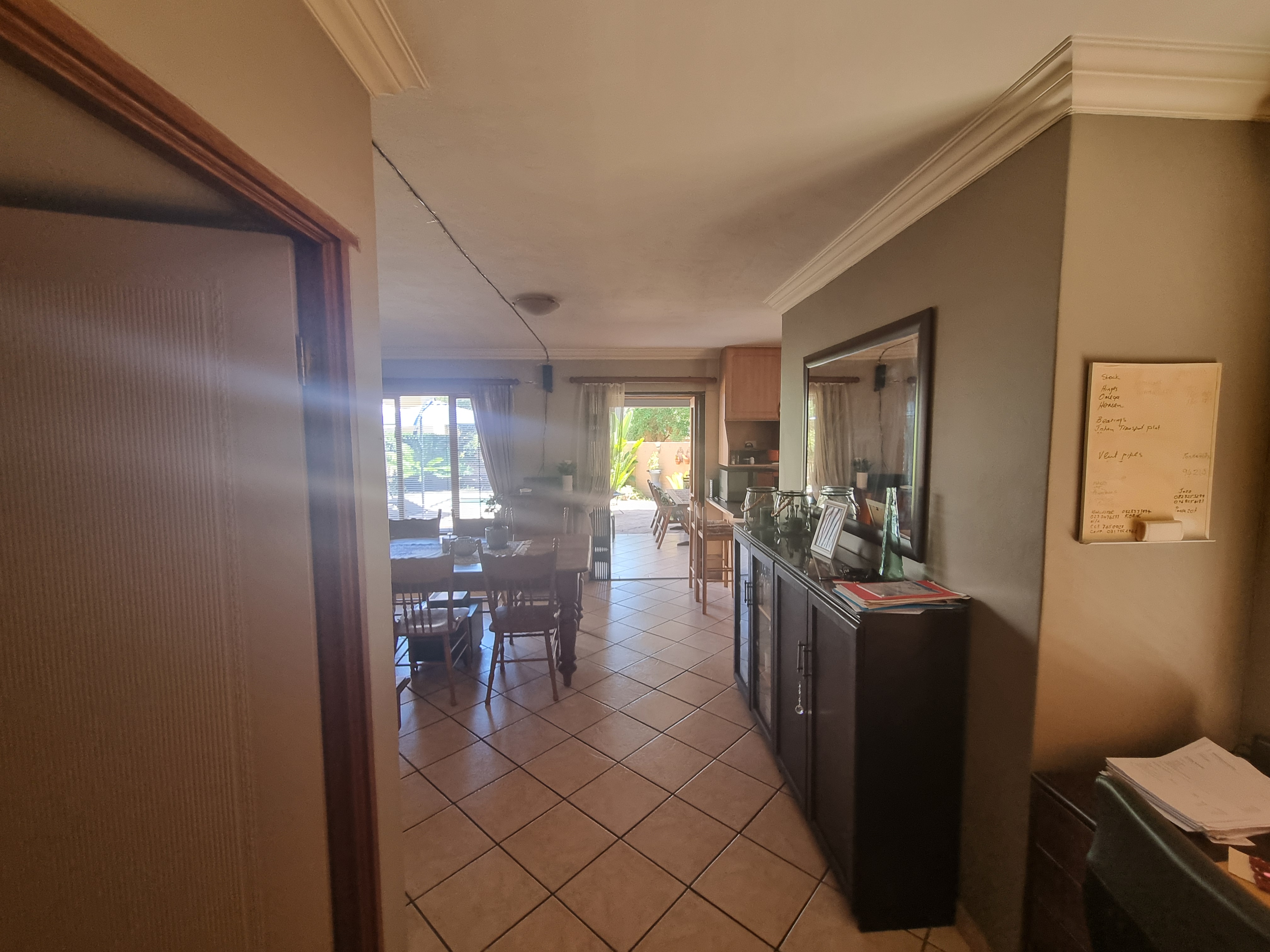 Enjoy the convenience of two sturdy back doors; one opens to a spacious double garage equipped with cupboards and shelves, while the other leads to a secure washing line and a Jojo water tank, perfect for those unexpected water supply interruptions.