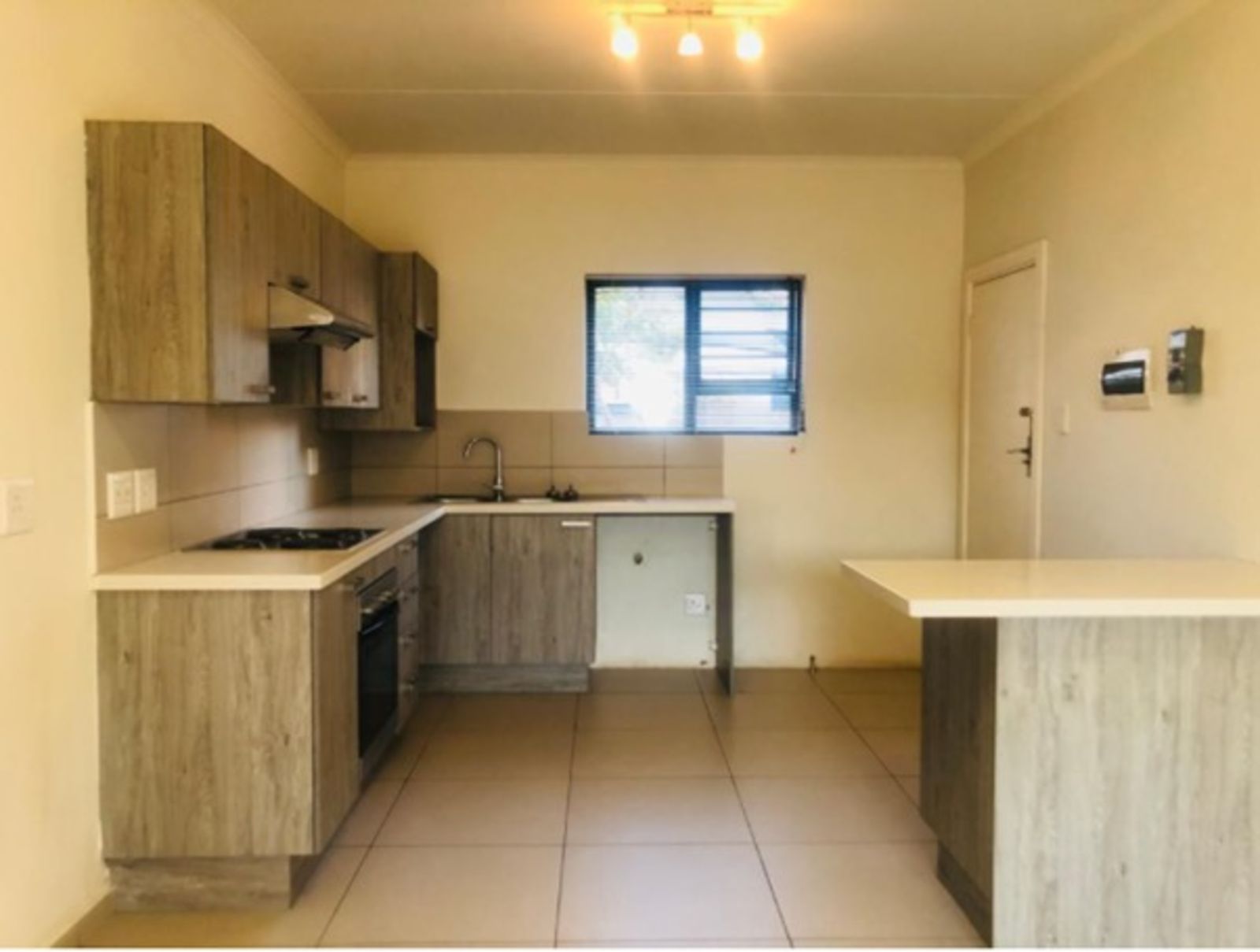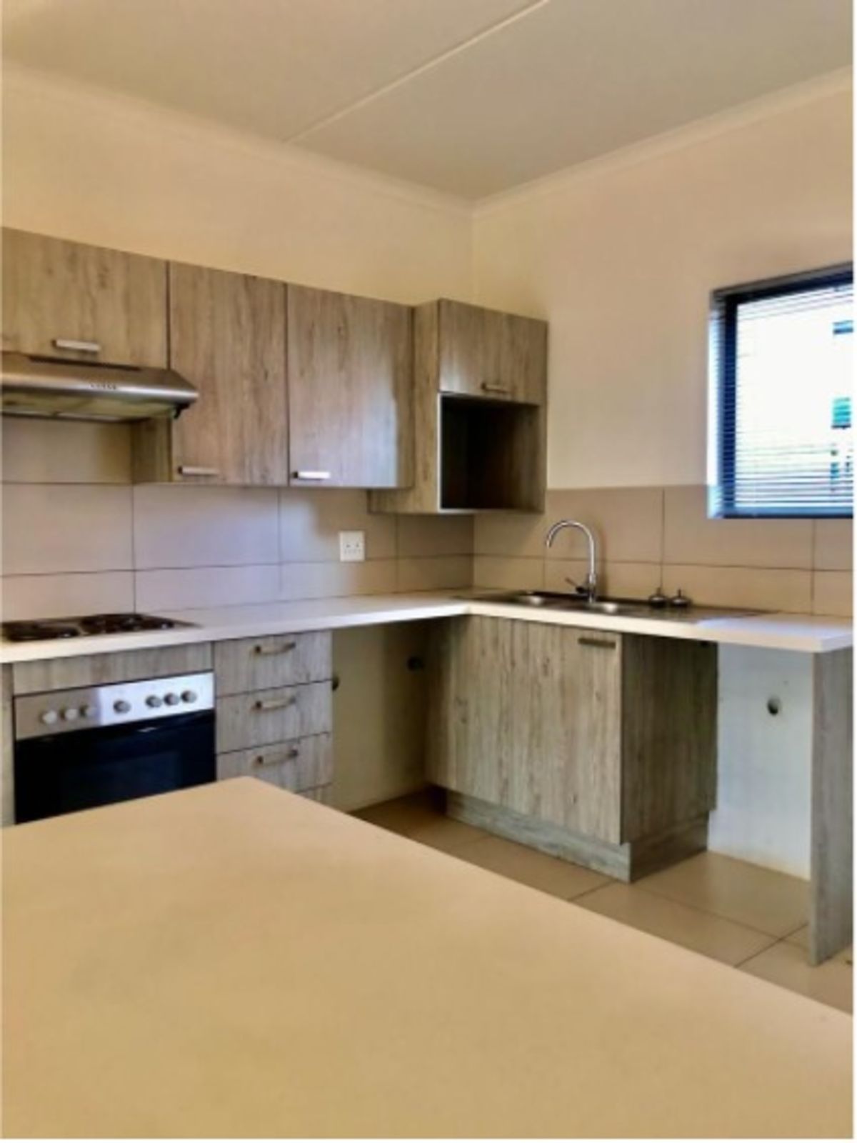 Entering the sunny kitchen you are welcomed by the caesarstone kitchen counter, space for a washing machine/dishwasher , a stove with an oven and extractor hood. The kitchen has a lot of cabinetry. With space for a microwave oven and a lot of electric plugs. The open plan kitchen leads to an open plan lounge which leads to the block patio facing the pirate garden through the glass sliding door. The 2 bedrooms with blinds are tiled and have built in cupboards.The 2 bedrooms share a full bathroom with toilet, a bathtub, basin with vanity and a shower. The unit has a single carport and plenty of parking for visitors.