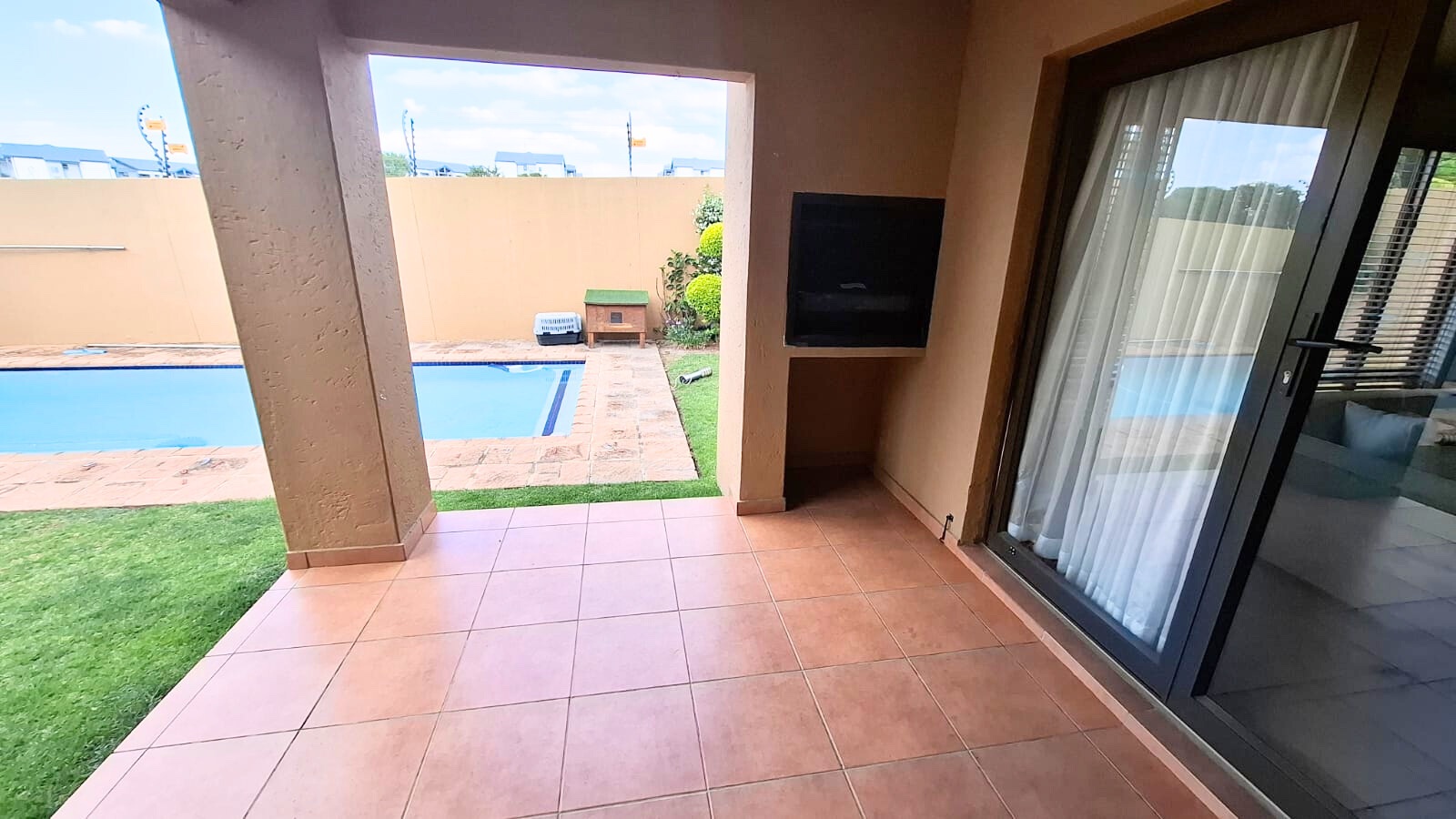 Covered Patio with built-in braai area overlooking the swimming pool