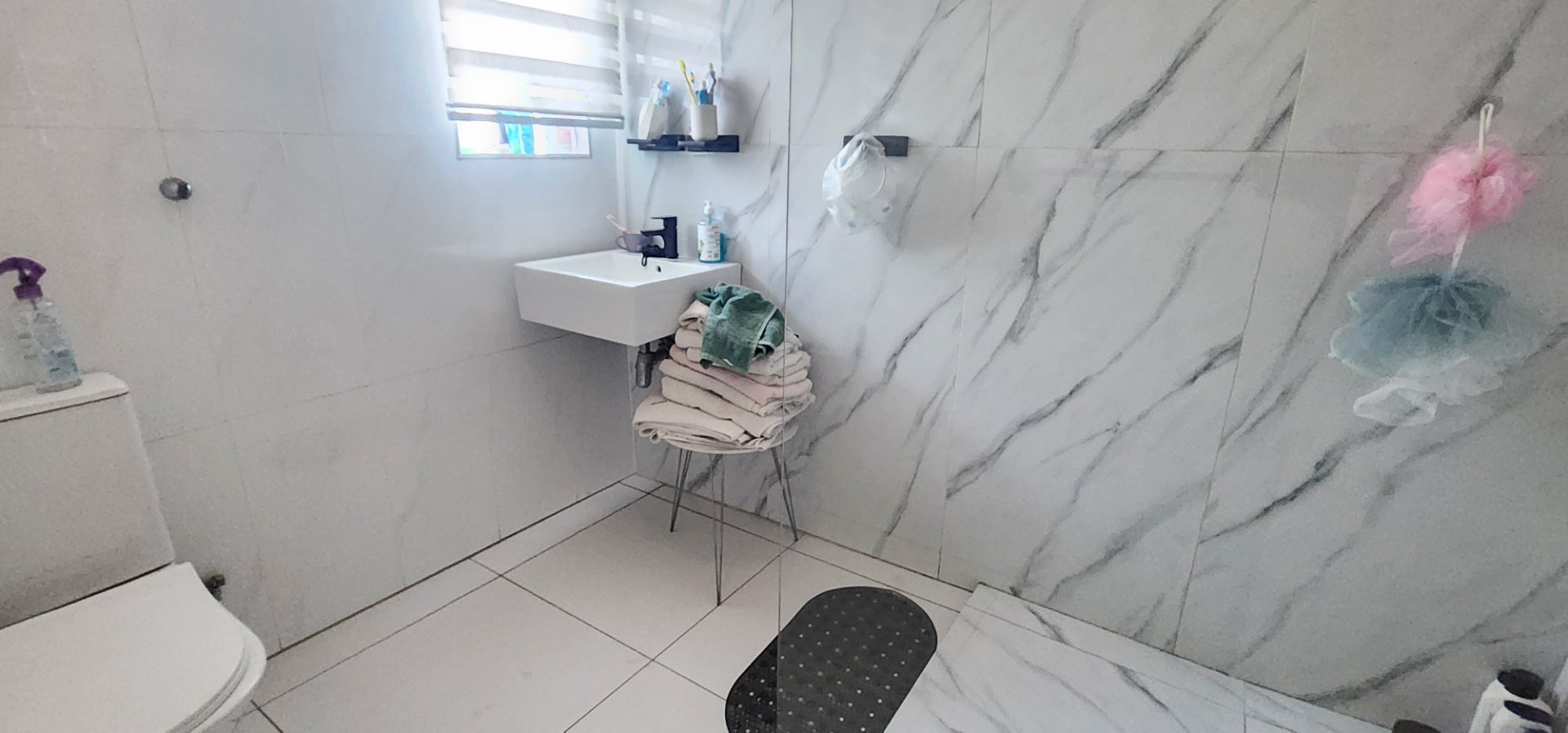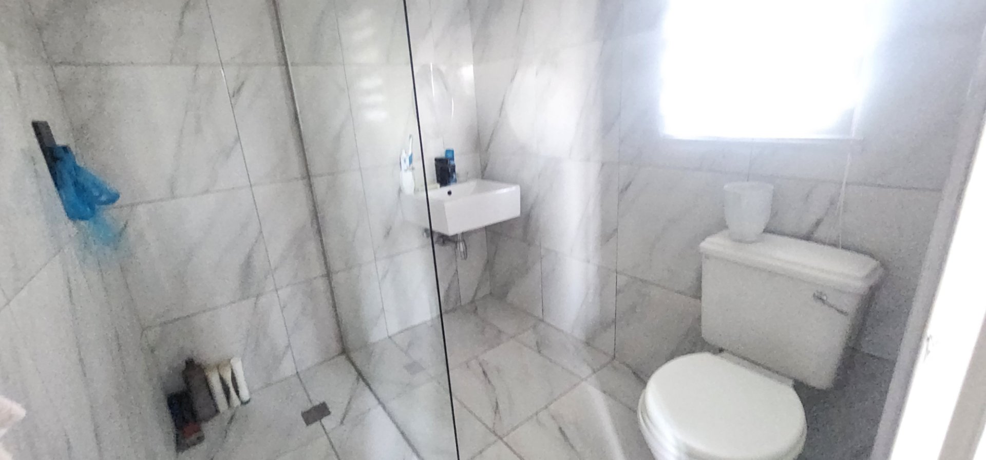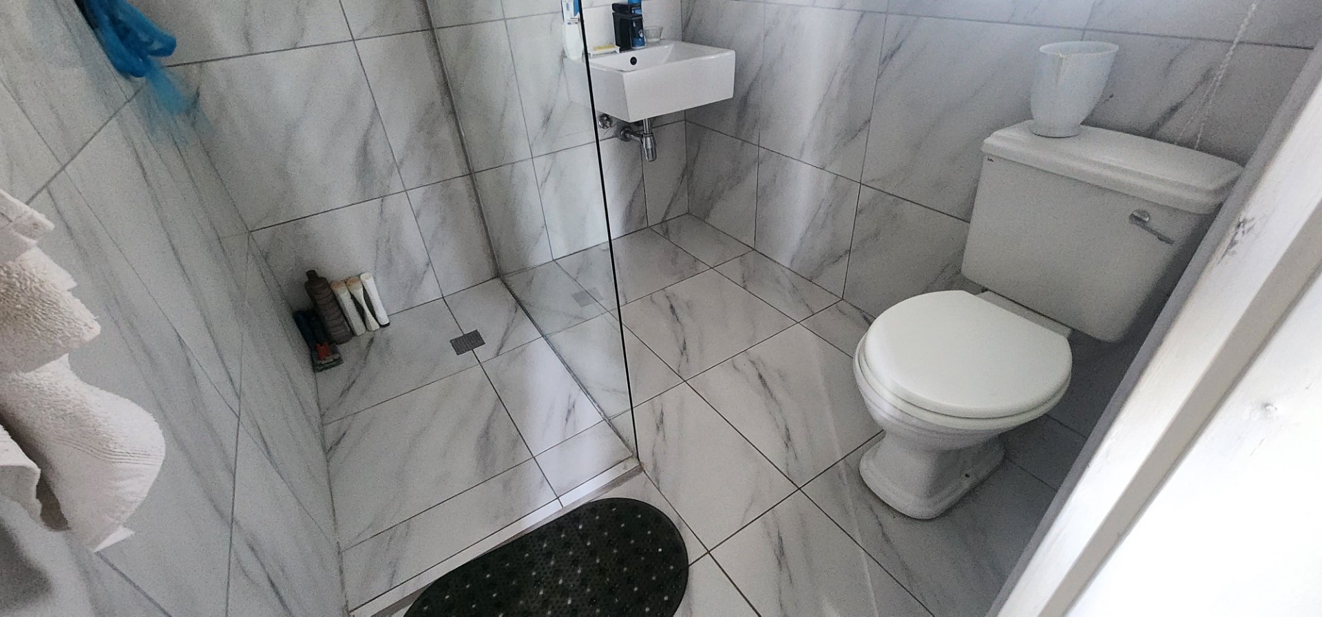 2 Modern bathrooms, fully tiled and equipped with shower, basin, and toilet.