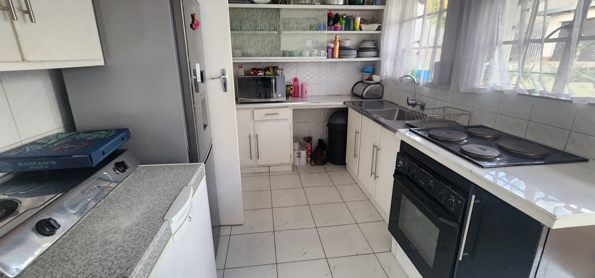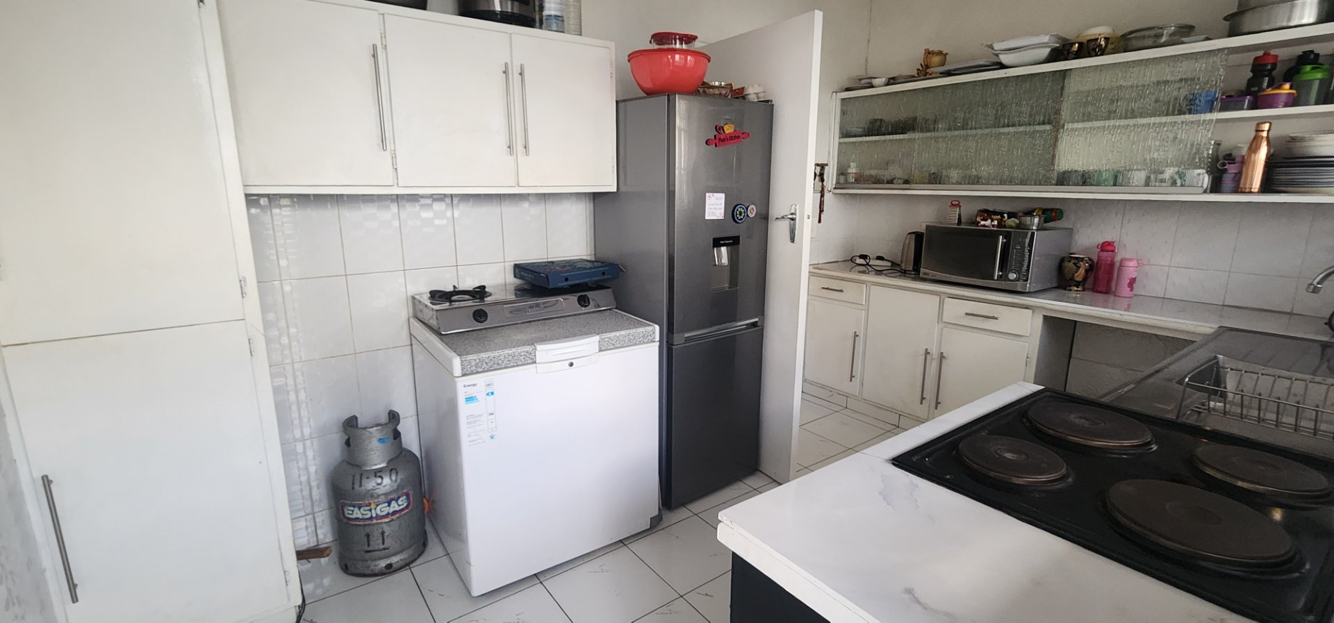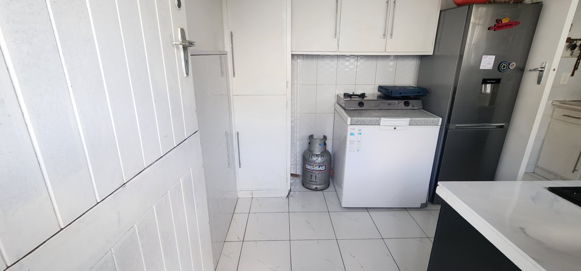 Spacious kitchen, fully tiled and fitted with built-in cupboards, offering plenty of storage and preparation space.