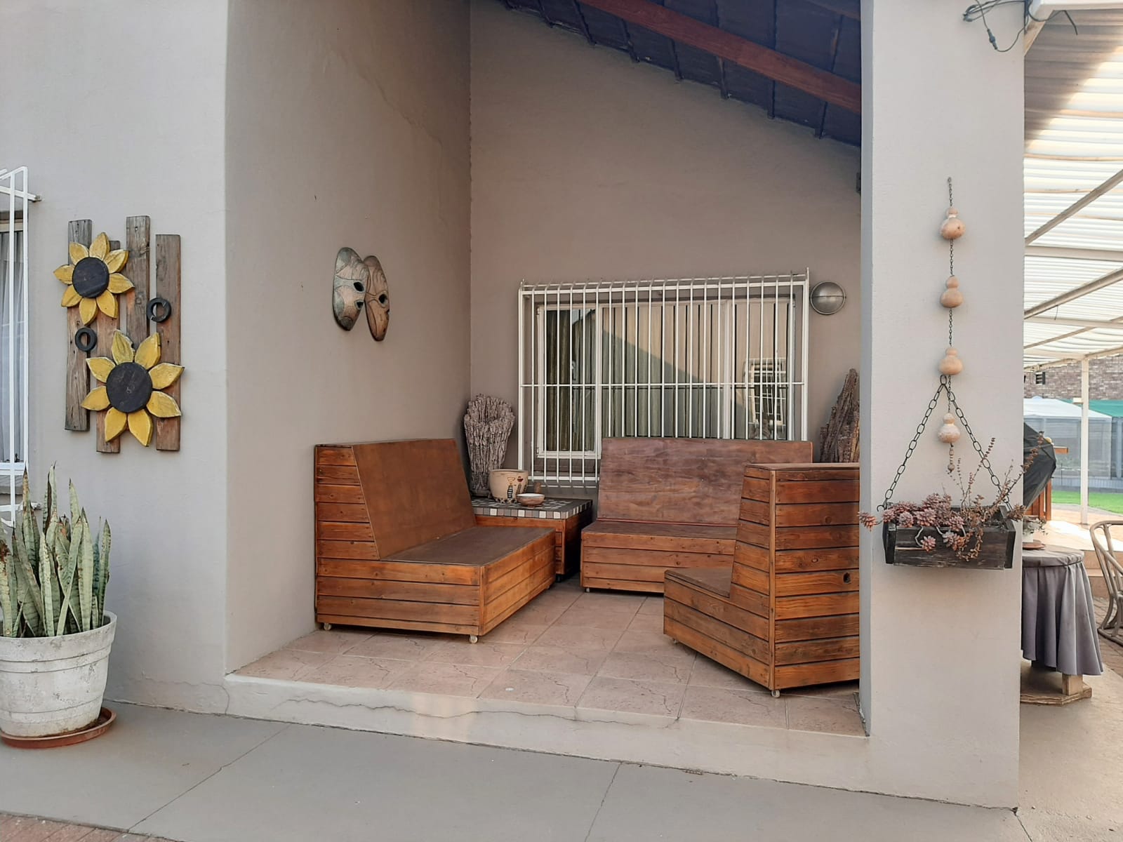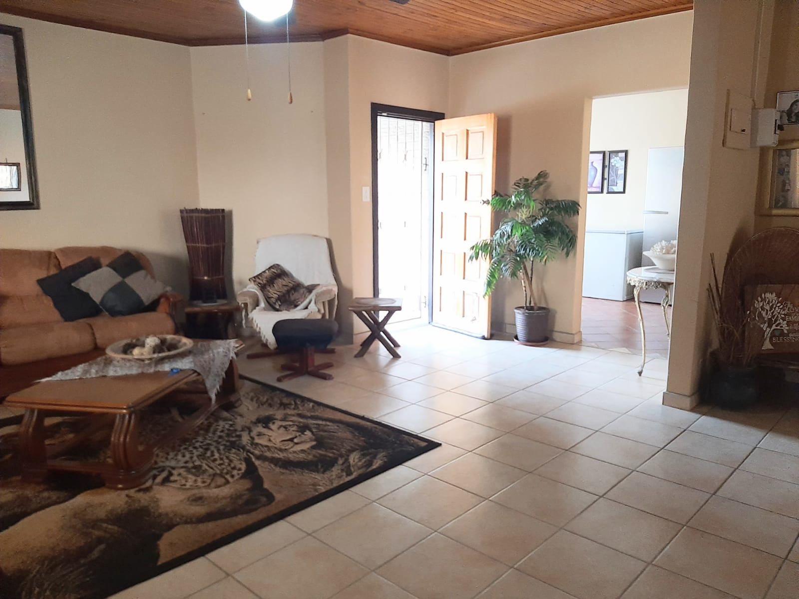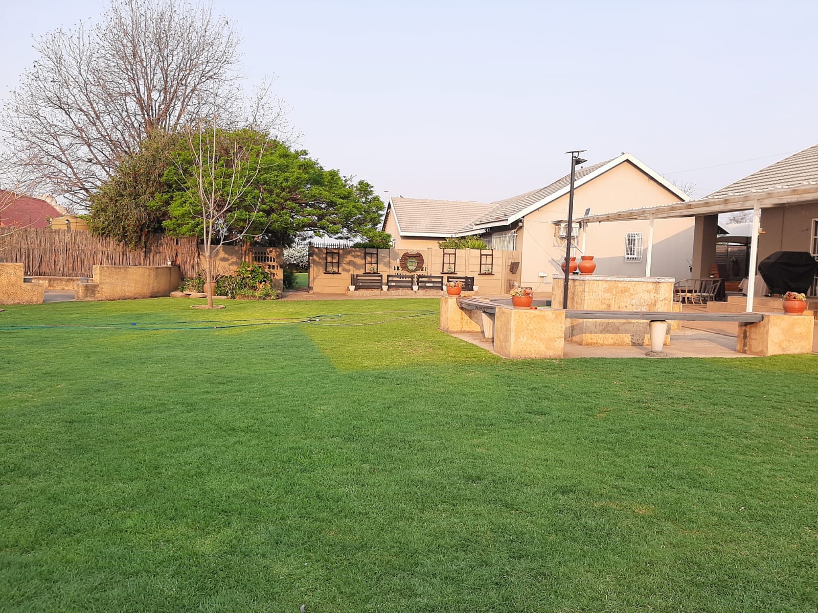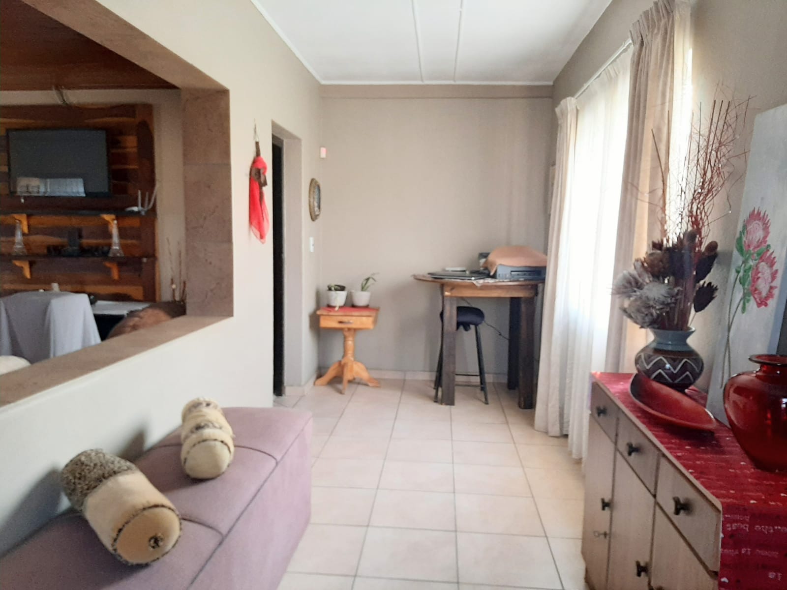This spacious and exceptionally neat property is located in Erasmus, a well-established and sought-after neighborhood. The stand measures a generous 2552 m2 and features a beautifully maintained garden with a variety of practical outdoor elements. The main house offers three bedrooms, each equipped with air conditioner and a cooling fan, as well as two bathrooms, a lounge, dining room, and entrance hall. The kitchen is fitted with wooden cupboards, a gas stove, eye-level oven, and a double sink. Flooring throughout the home is a combination of tiles and carpet, and additional features include a gas geyser, satellite dish, burglar bars, blinds, curtain rails, and a water tank.