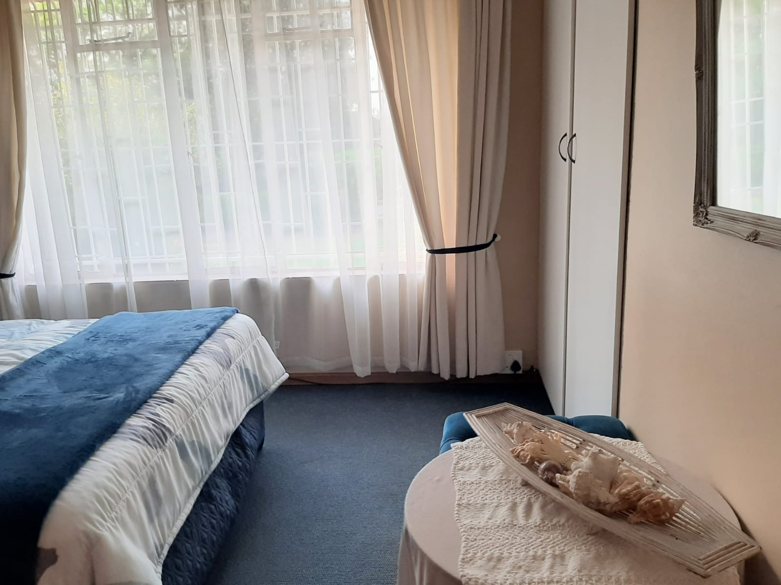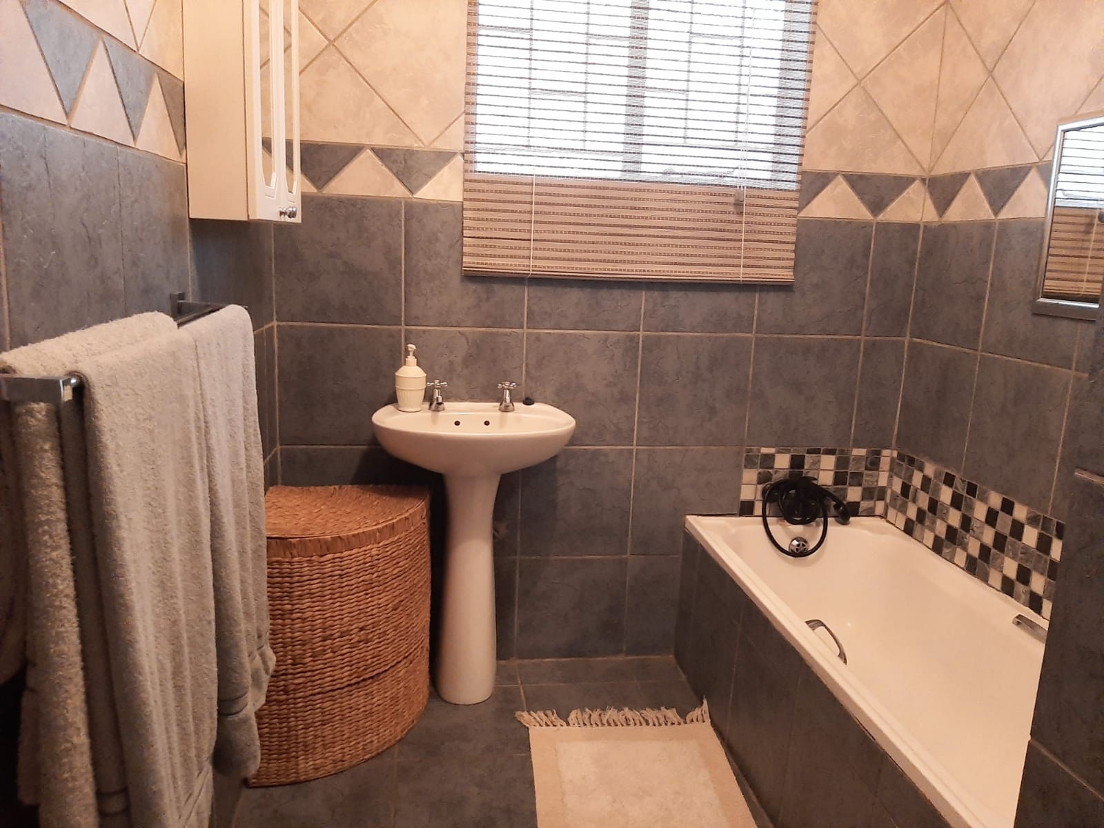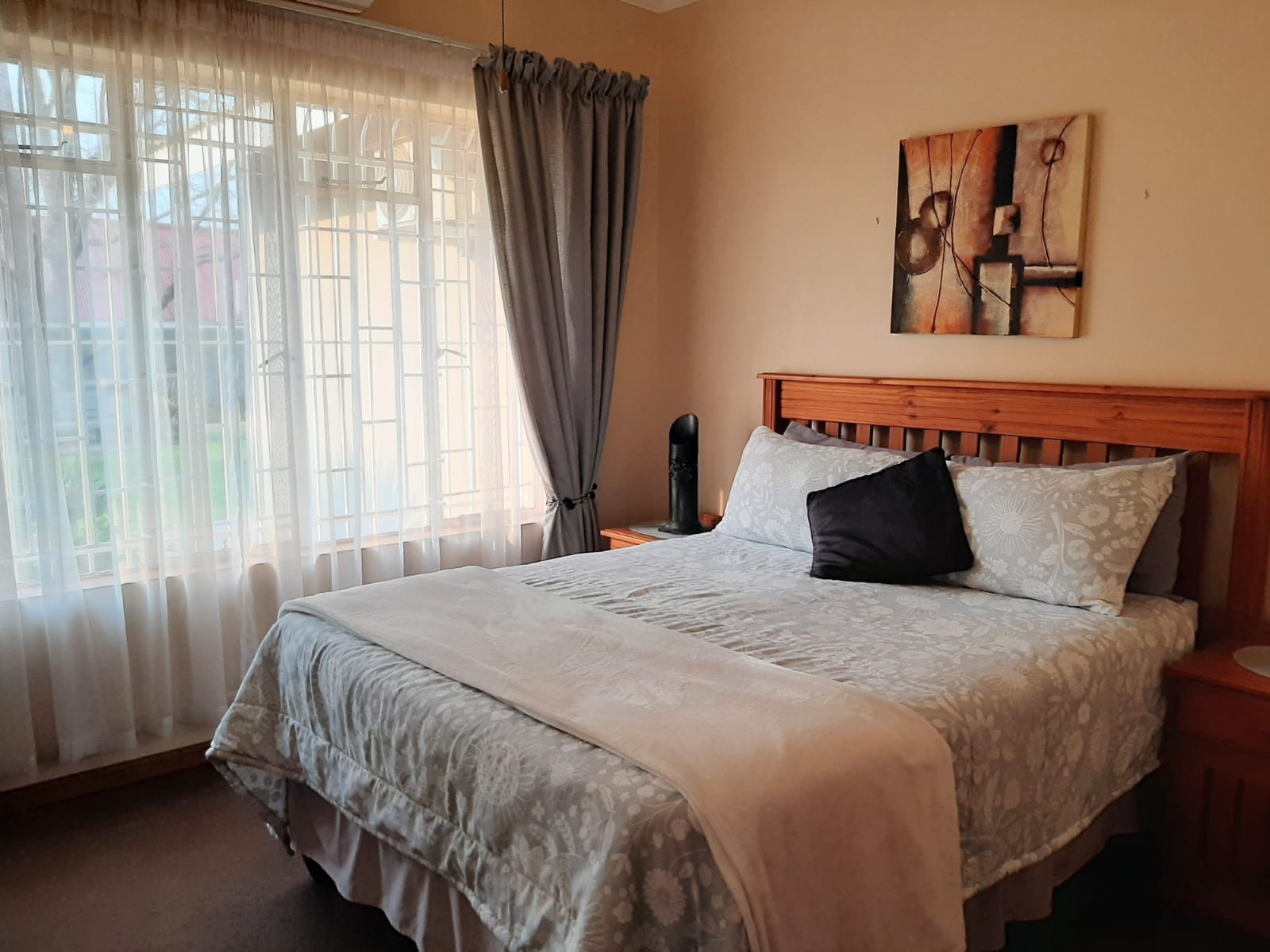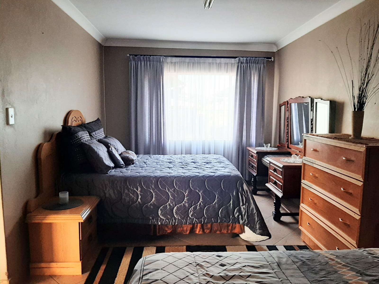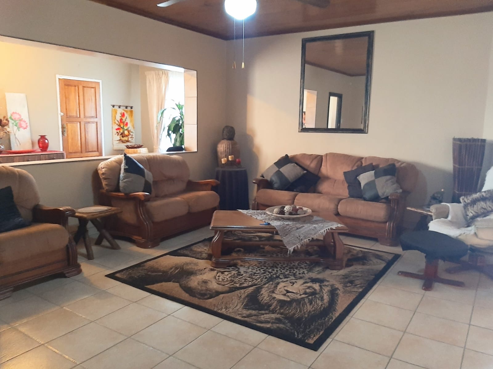 This spacious and exceptionally neat property is located in Erasmus, a well-established and sought-after neighborhood. The stand measures a generous 2552 m2 and features a beautifully maintained garden with a variety of practical outdoor elements. The main house offers three bedrooms, each equipped with air conditioner and a cooling fan, as well as two bathrooms, a lounge, dining room, and entrance hall. The kitchen is fitted with wooden cupboards, a gas stove, eye-level oven, and a double sink. Flooring throughout the home is a combination of tiles and carpet, and additional features include a gas geyser, satellite dish, burglar bars, blinds, curtain rails, and a water tank.