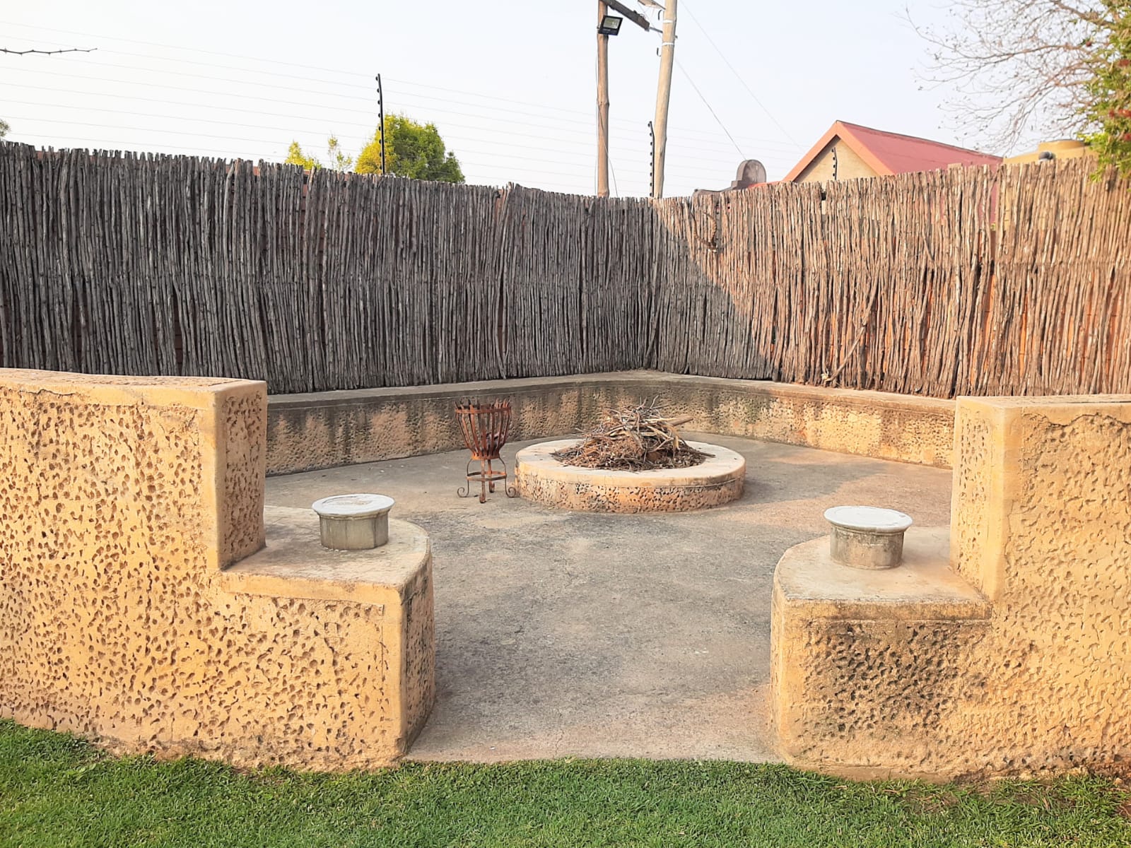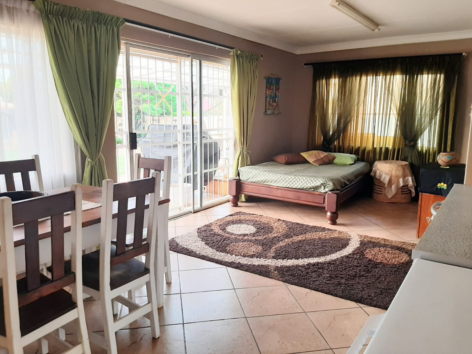 Outdoor features include a built-in braai with a seating area, a boma for fireside gatherings, and a greenhouse with a sprinkling system. Parking is well catered for with a double carport that can accommodate a caravan and two cars, along with two additional shade-net covered bays. Security features include an electric fence and burglar bars, and the property is equipped with prepaid electricity, a borehole, and a water tank.