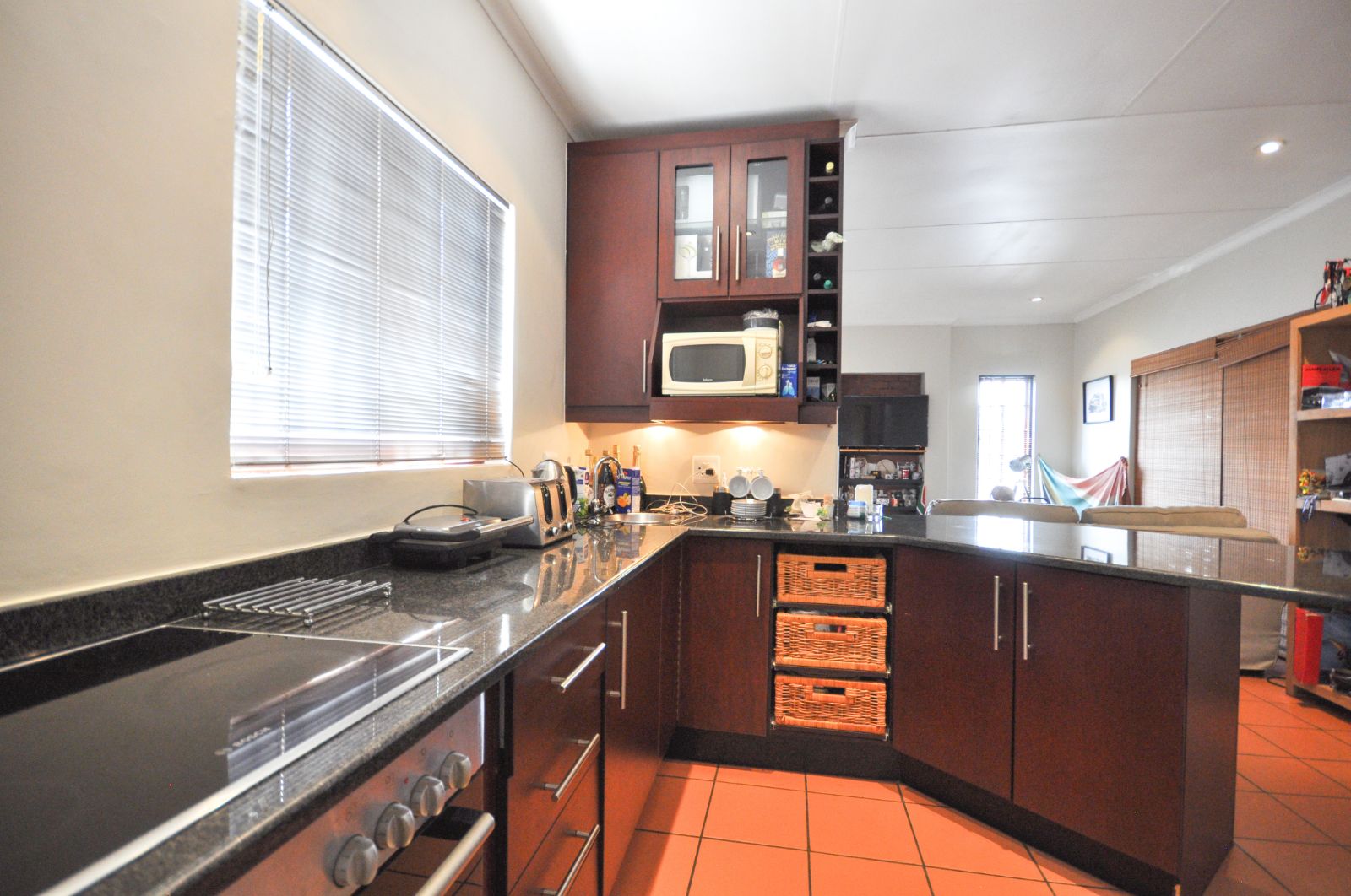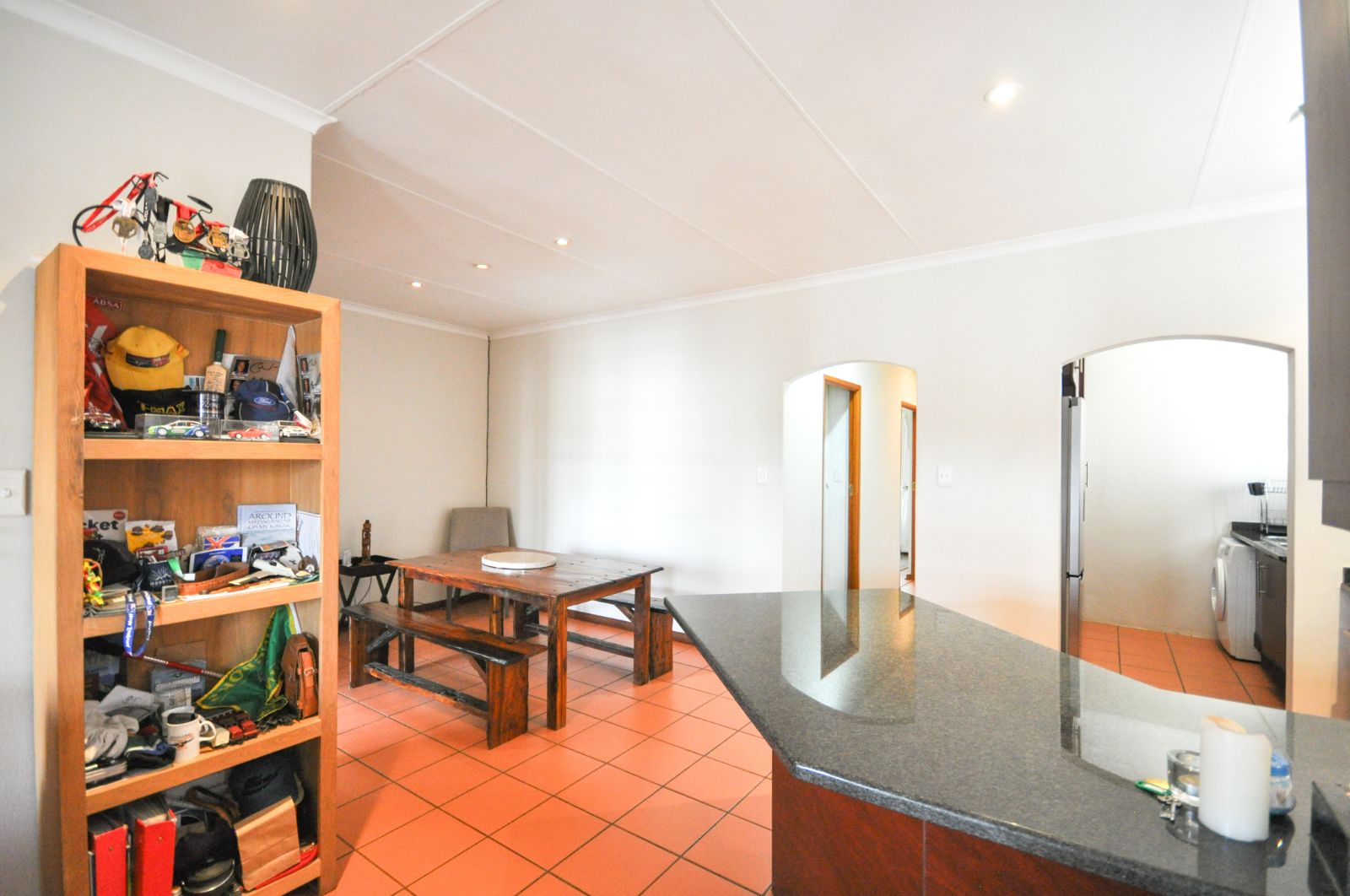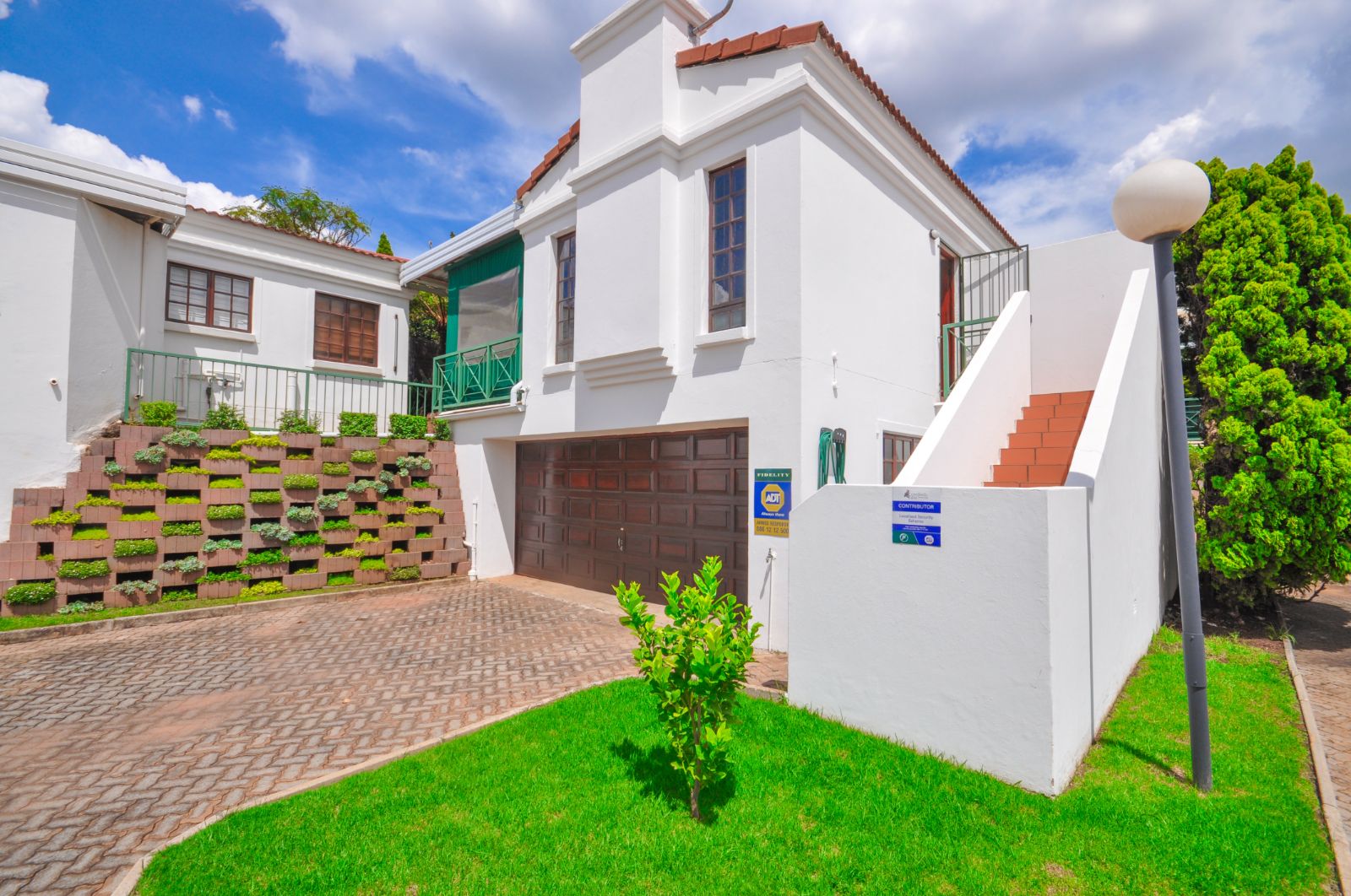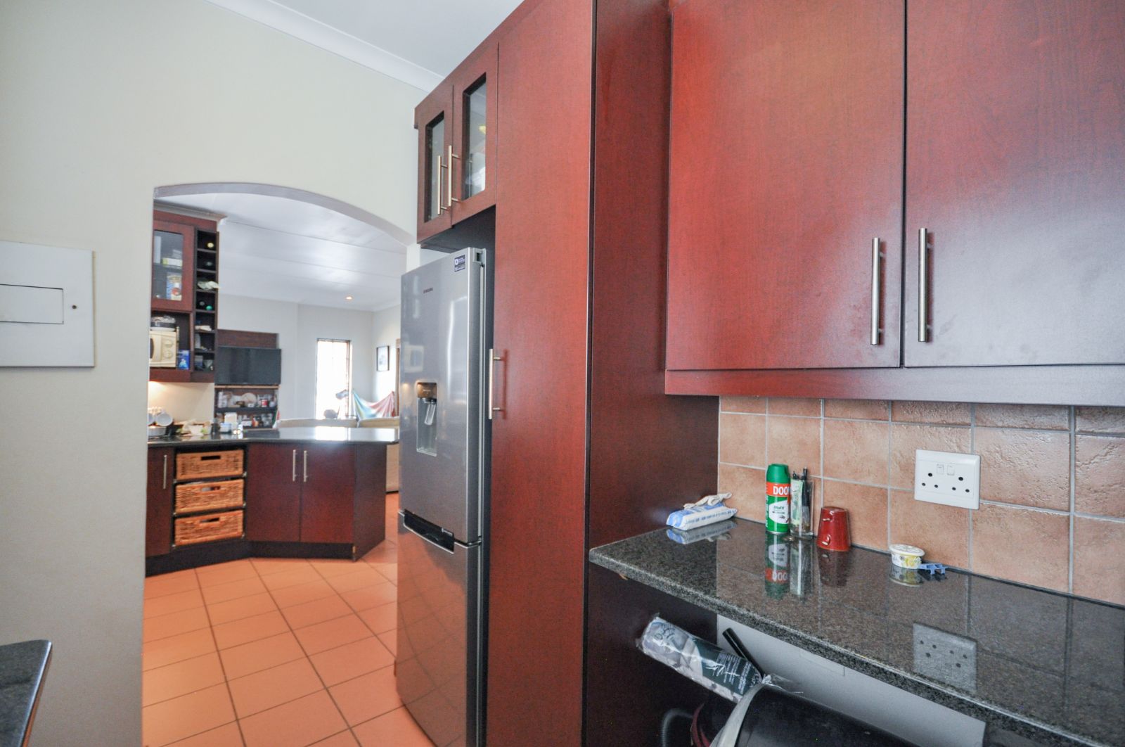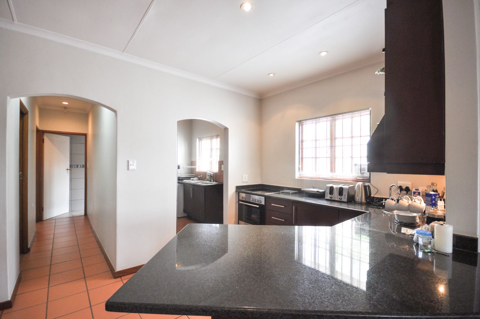 Upon entering, one is greeted by the staircase leading from the double automated garage, which provides not only secure parking but also a generous additional storage space. The heart of the home reveals a gracious open-plan living room and a separate dining area, elegantly tiled throughout. The kitchen, with its timeless black granite finishes, is both stylish and functional, complete with a breakfast nook and a separate scullery that offers ample space for three electrical appliances, a pantry, and abundant cupboard storage. The scullery further extends to a private courtyard complete with a washing line.