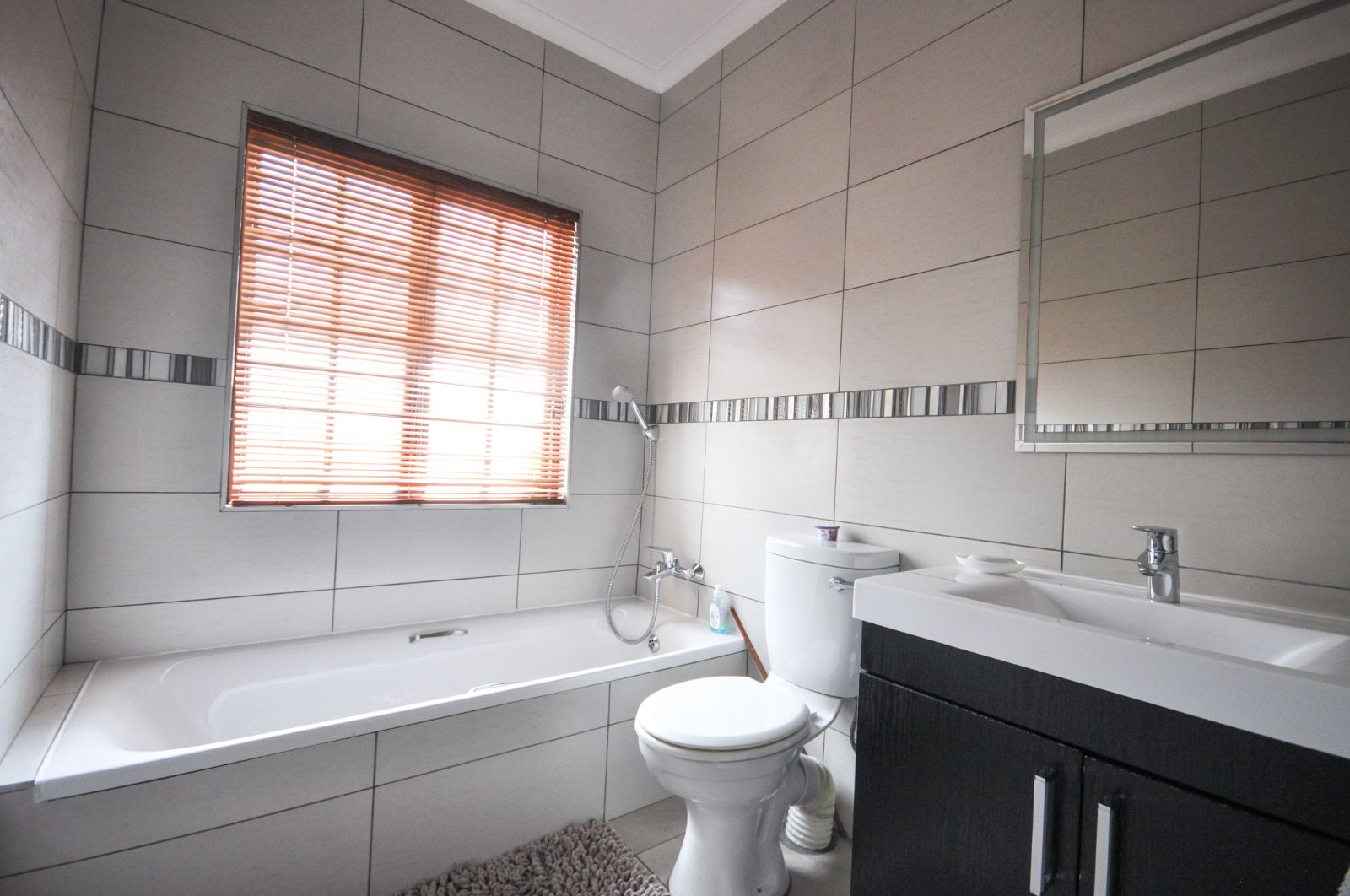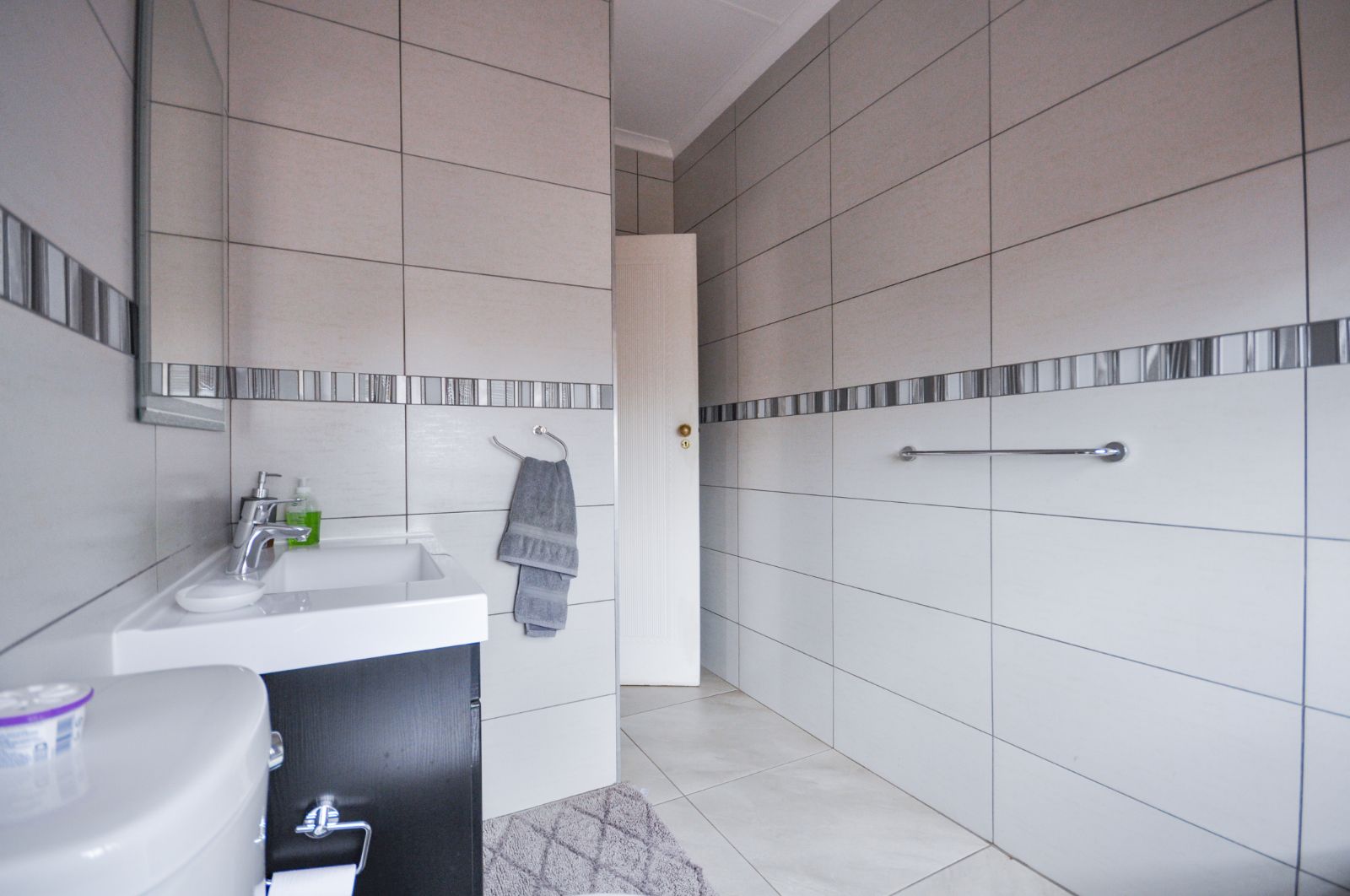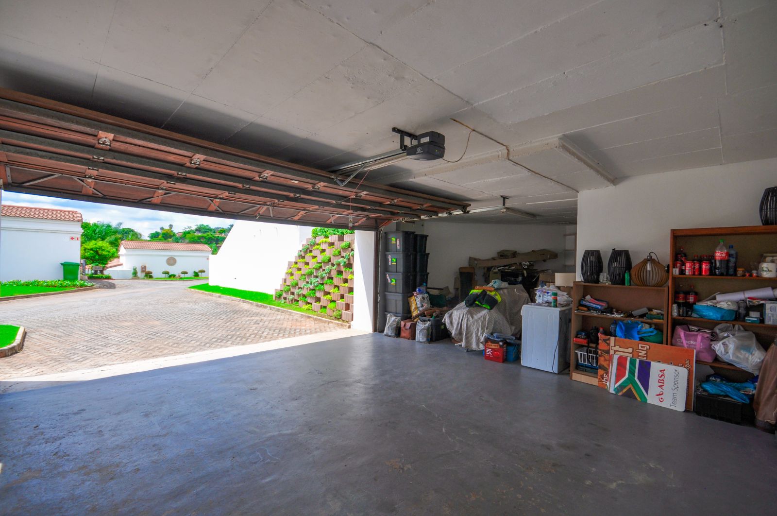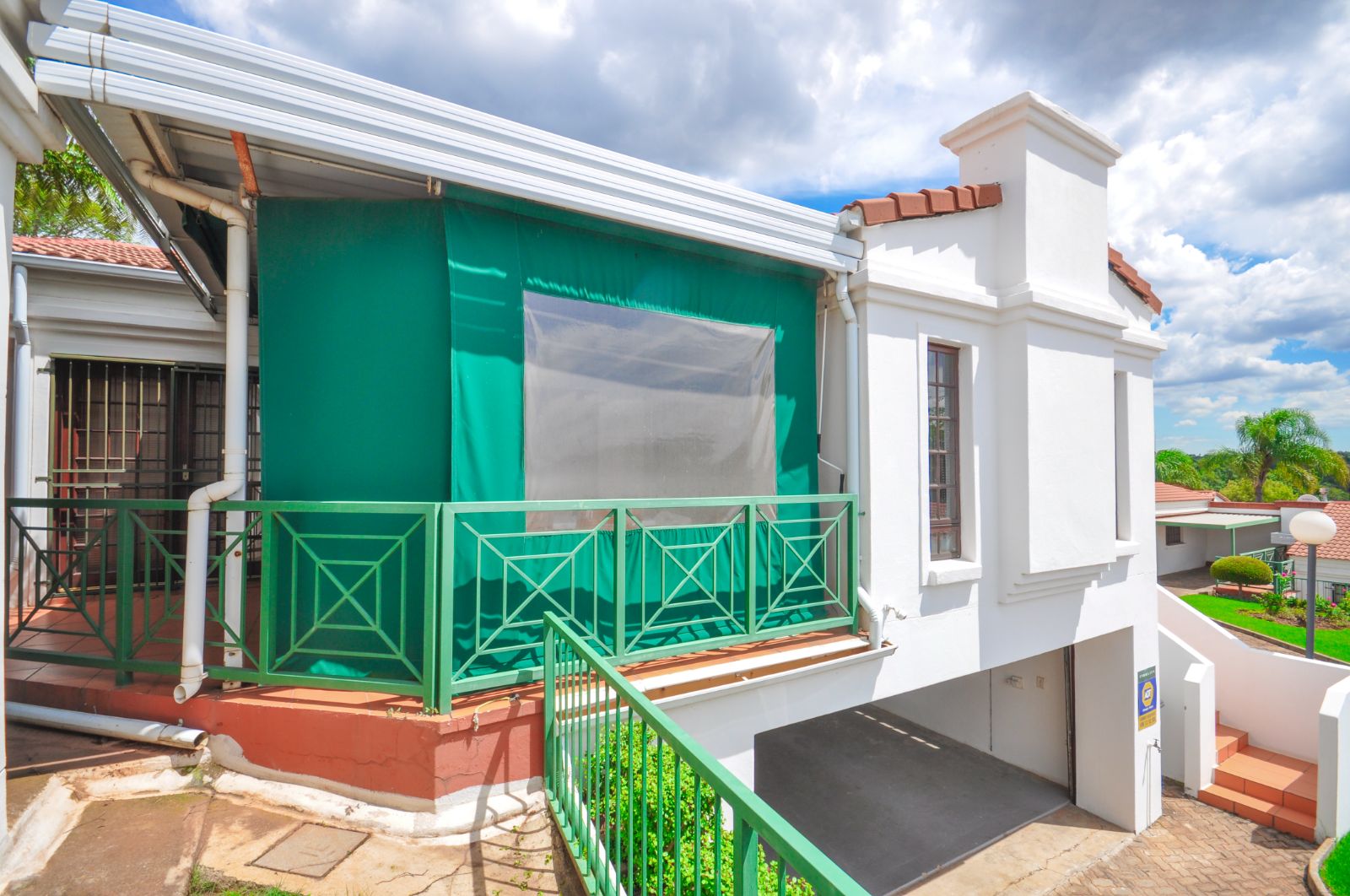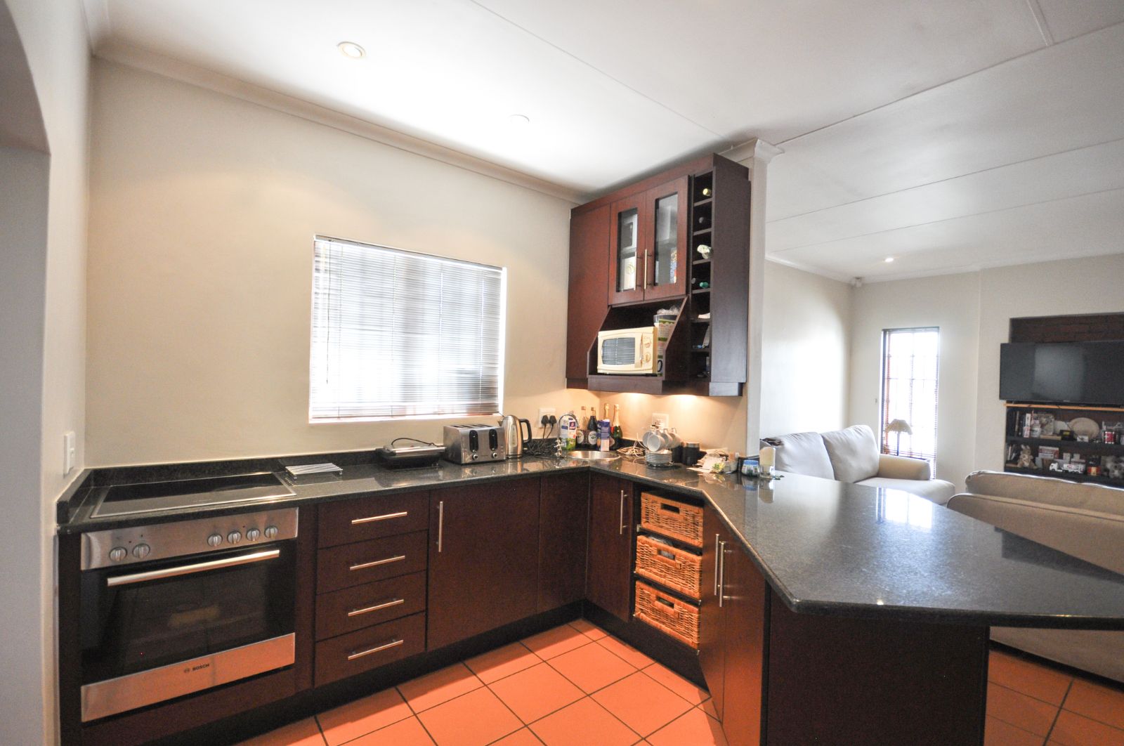 Upon entering, one is greeted by the staircase leading from the double automated garage, which provides not only secure parking but also a generous additional storage space. The heart of the home reveals a gracious open-plan living room and a separate dining area, elegantly tiled throughout. The kitchen, with its timeless black granite finishes, is both stylish and functional, complete with a breakfast nook and a separate scullery that offers ample space for three electrical appliances, a pantry, and abundant cupboard storage. The scullery further extends to a private courtyard complete with a washing line.