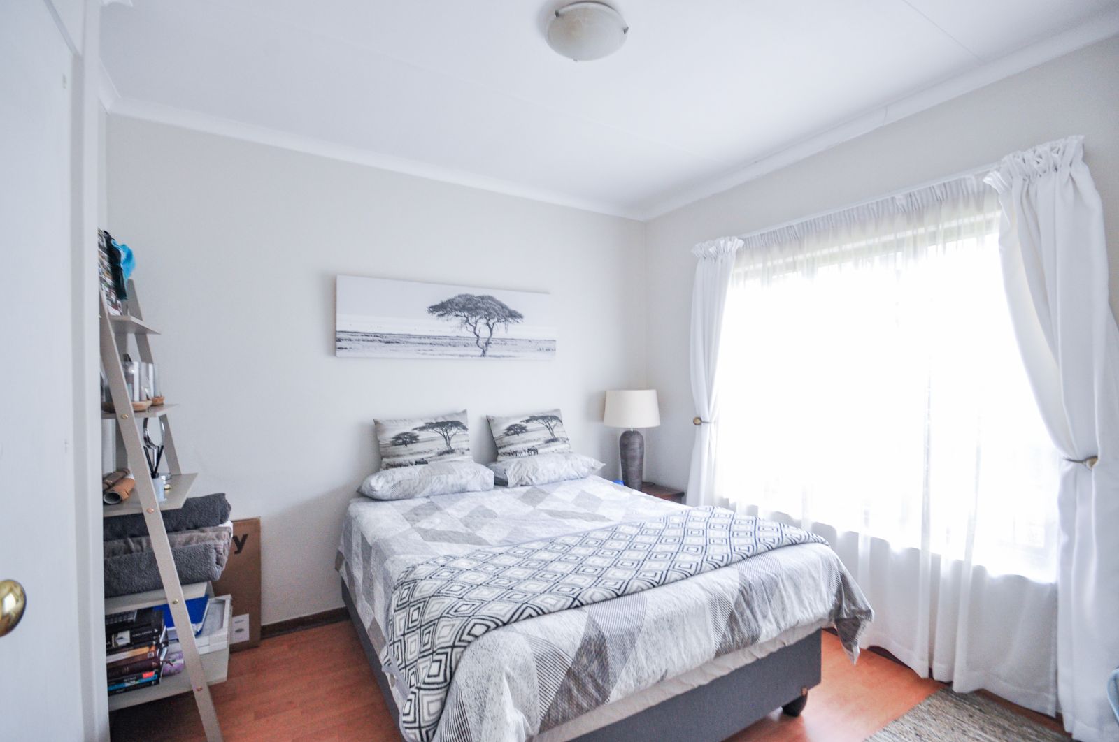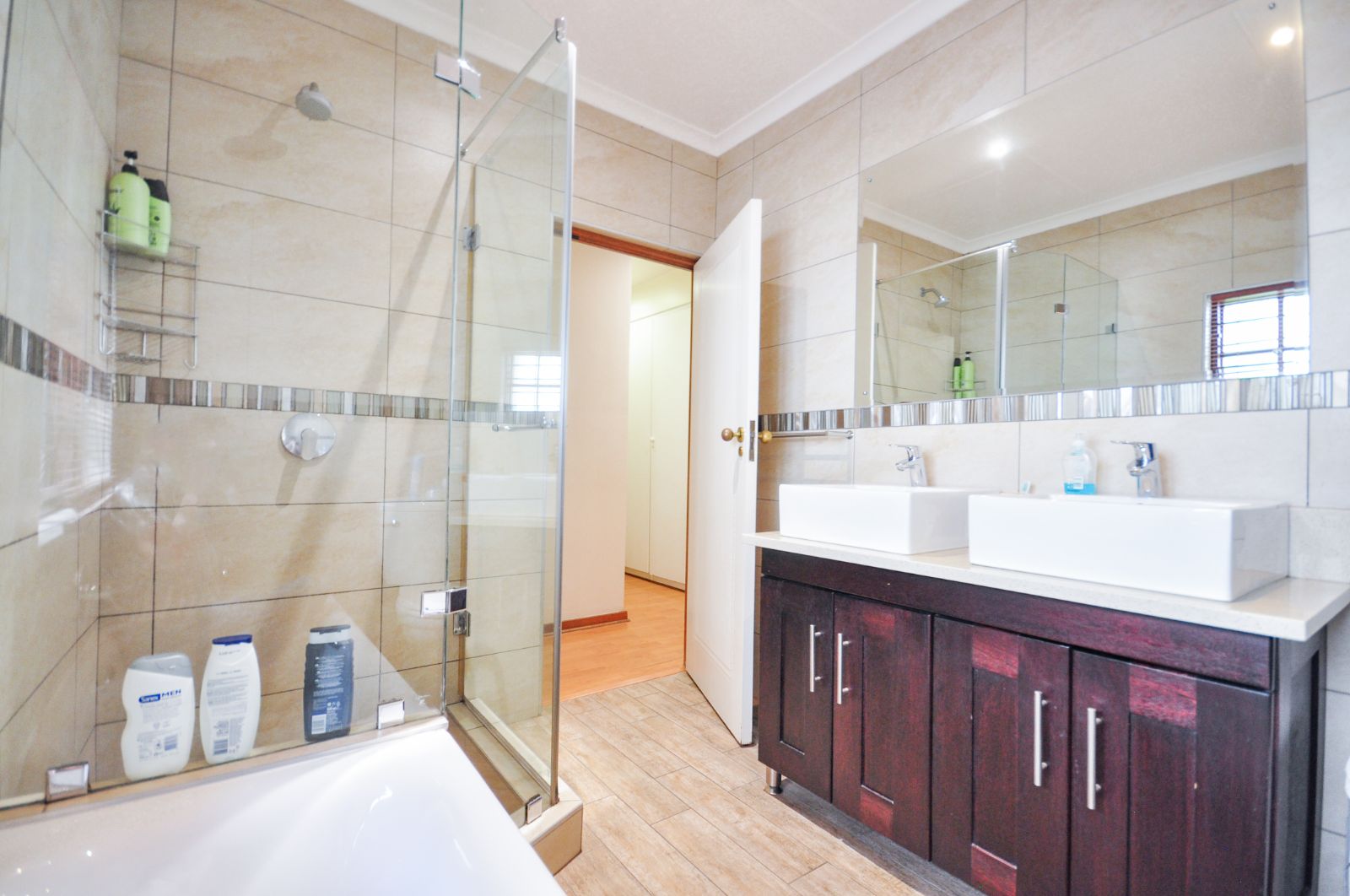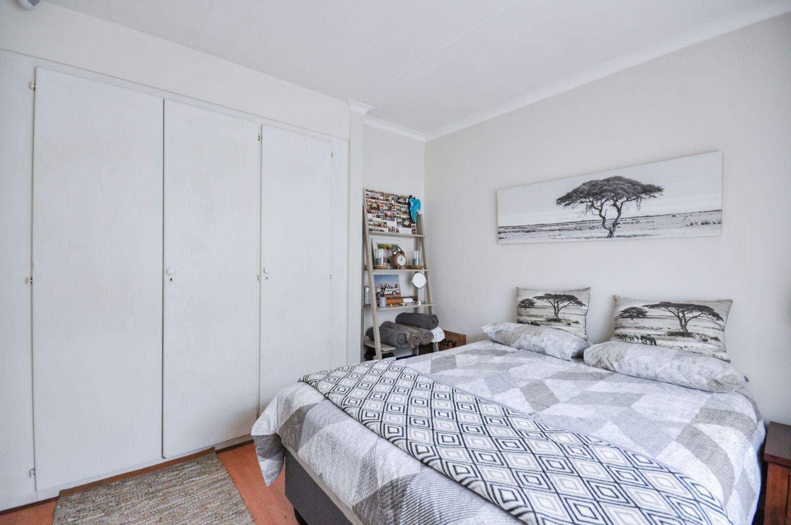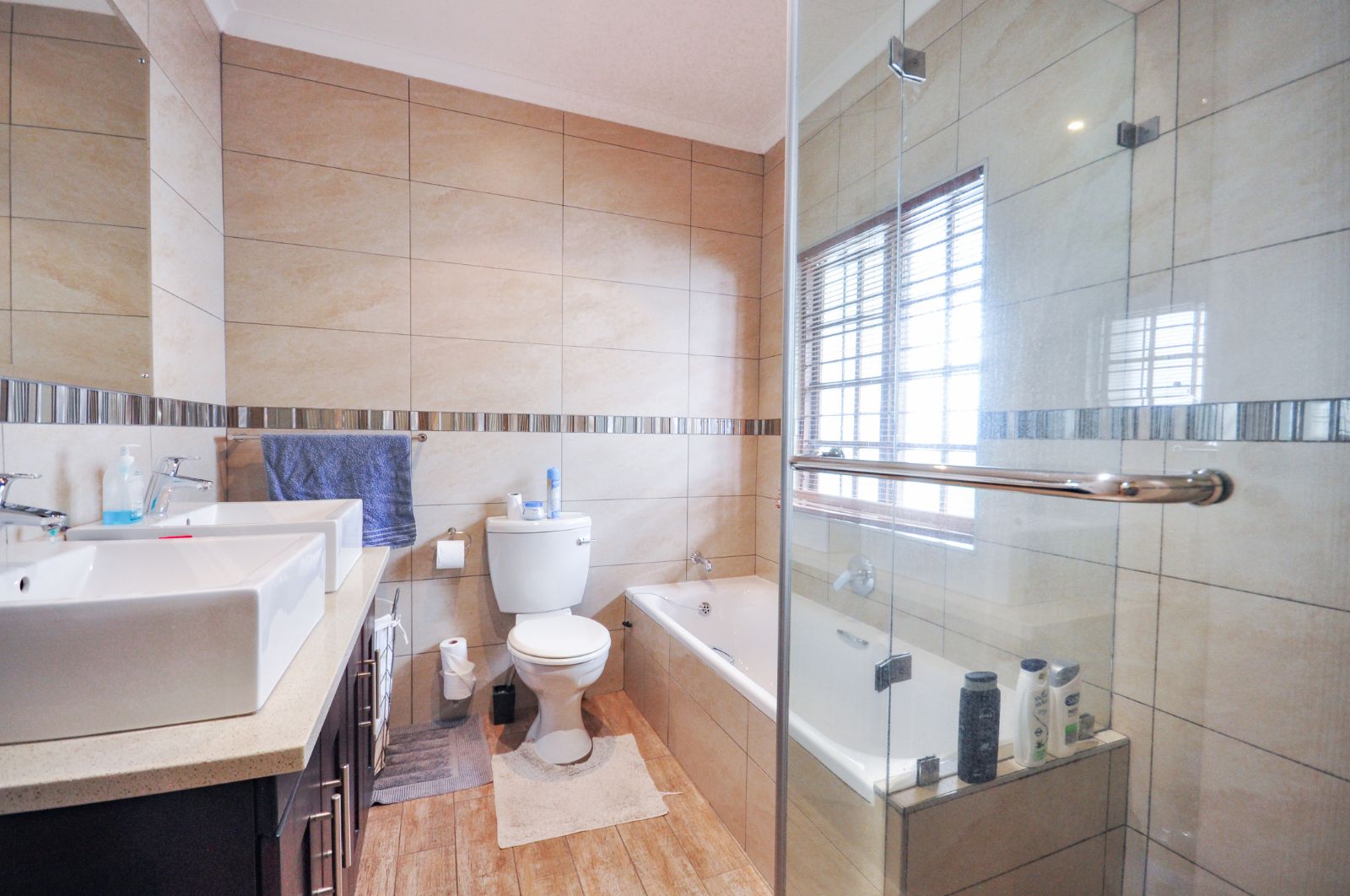 The second bedroom, equally expansive, also benefits from the refined laminate flooring and enjoys the convenience of a separate, well-appointed bathroom, complete with a bath, basin, and toilet.