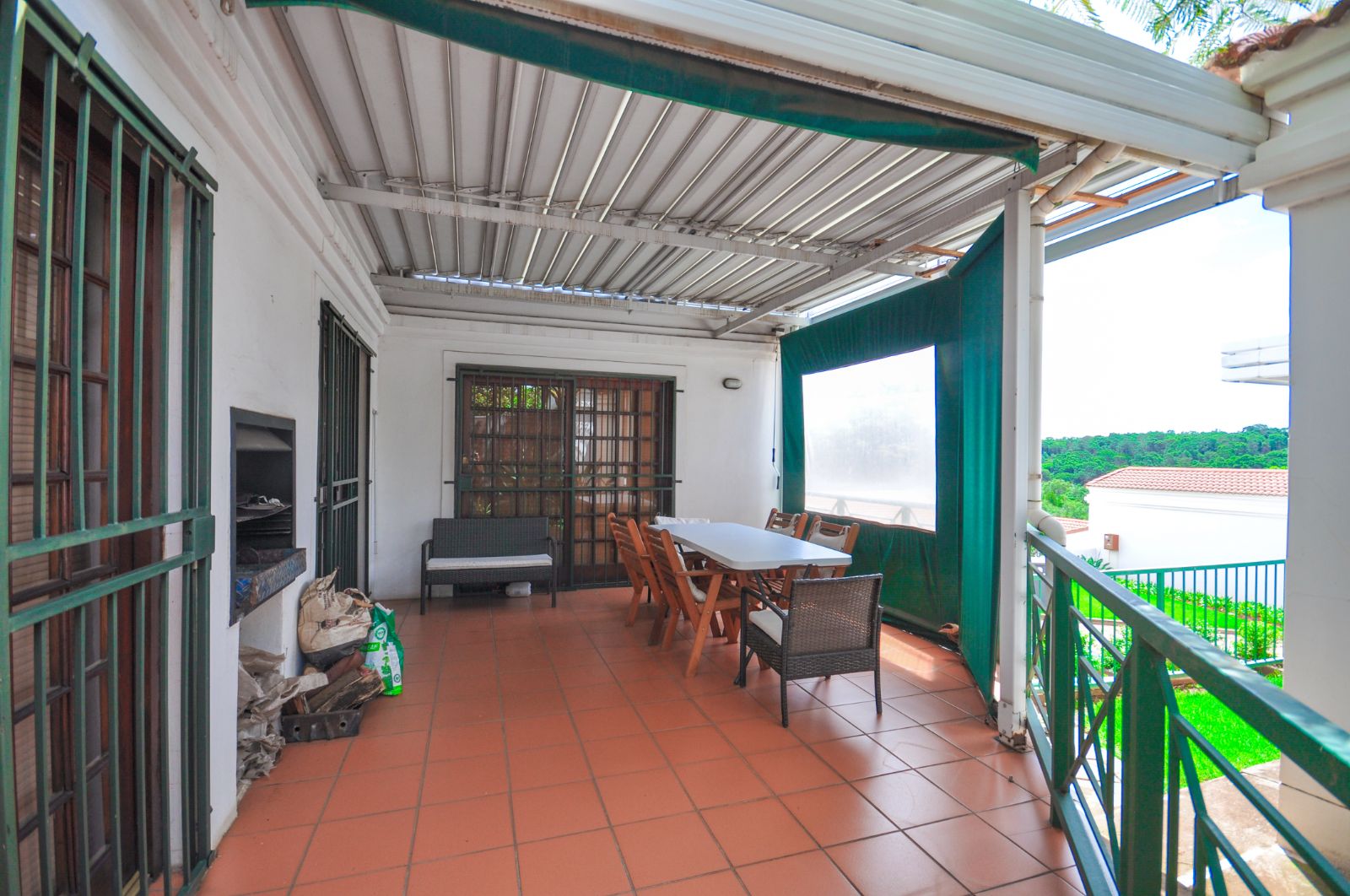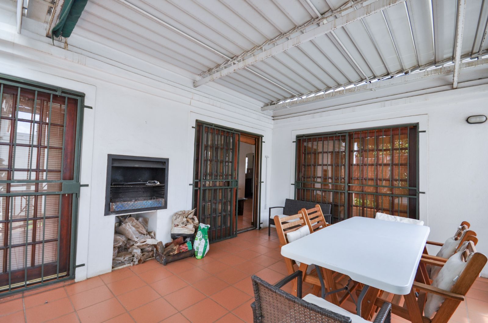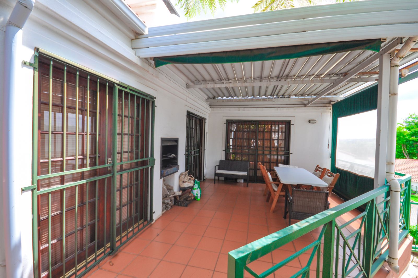 The dining room seamlessly flows onto the outdoor patio, where a built-in braai beckons for entertaining. Canvas blinds, thoughtfully installed, ensure the comfort of the space regardless of weather conditions, allowing for year-round enjoyment of the stunning views that stretch before you.