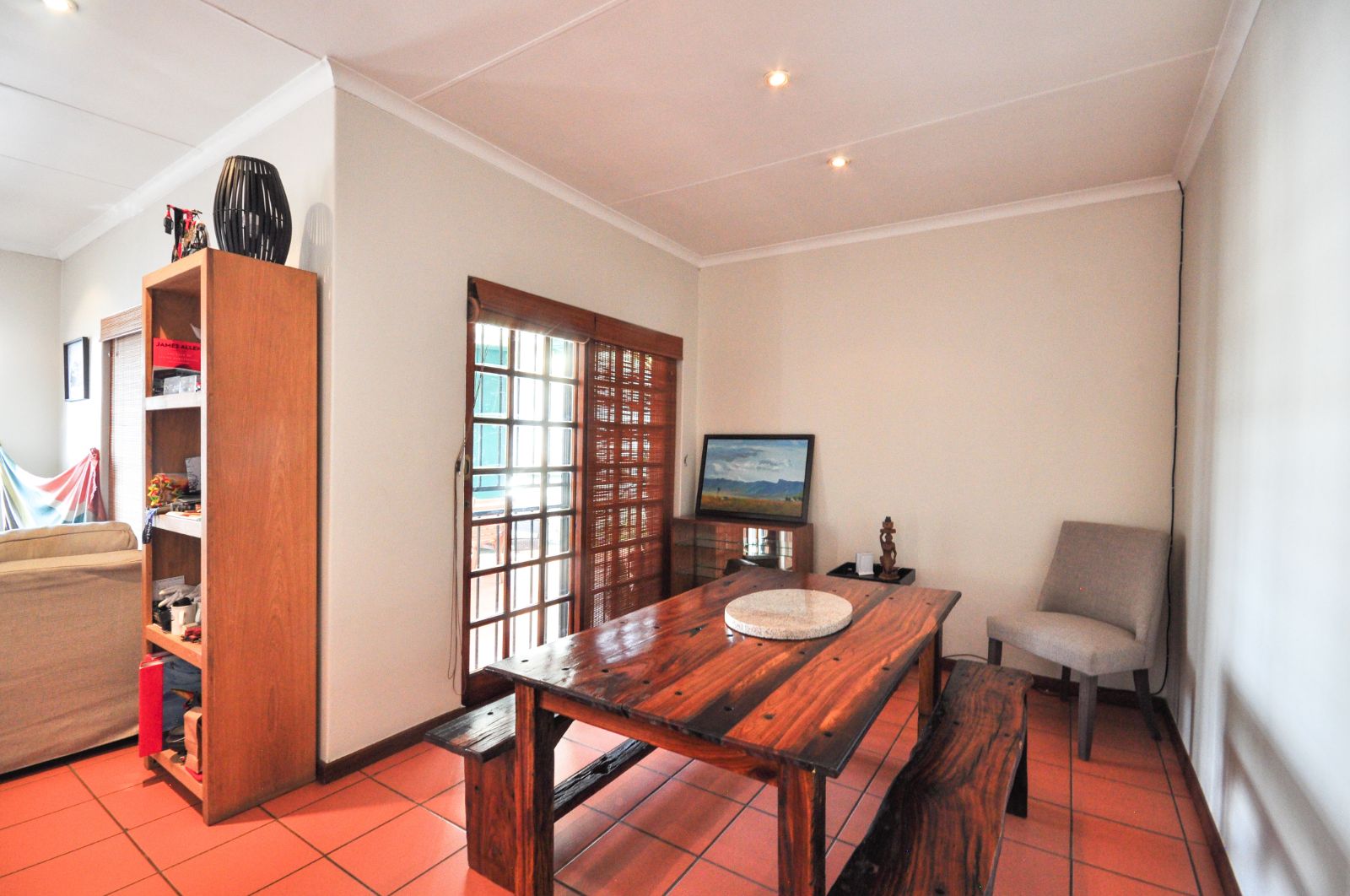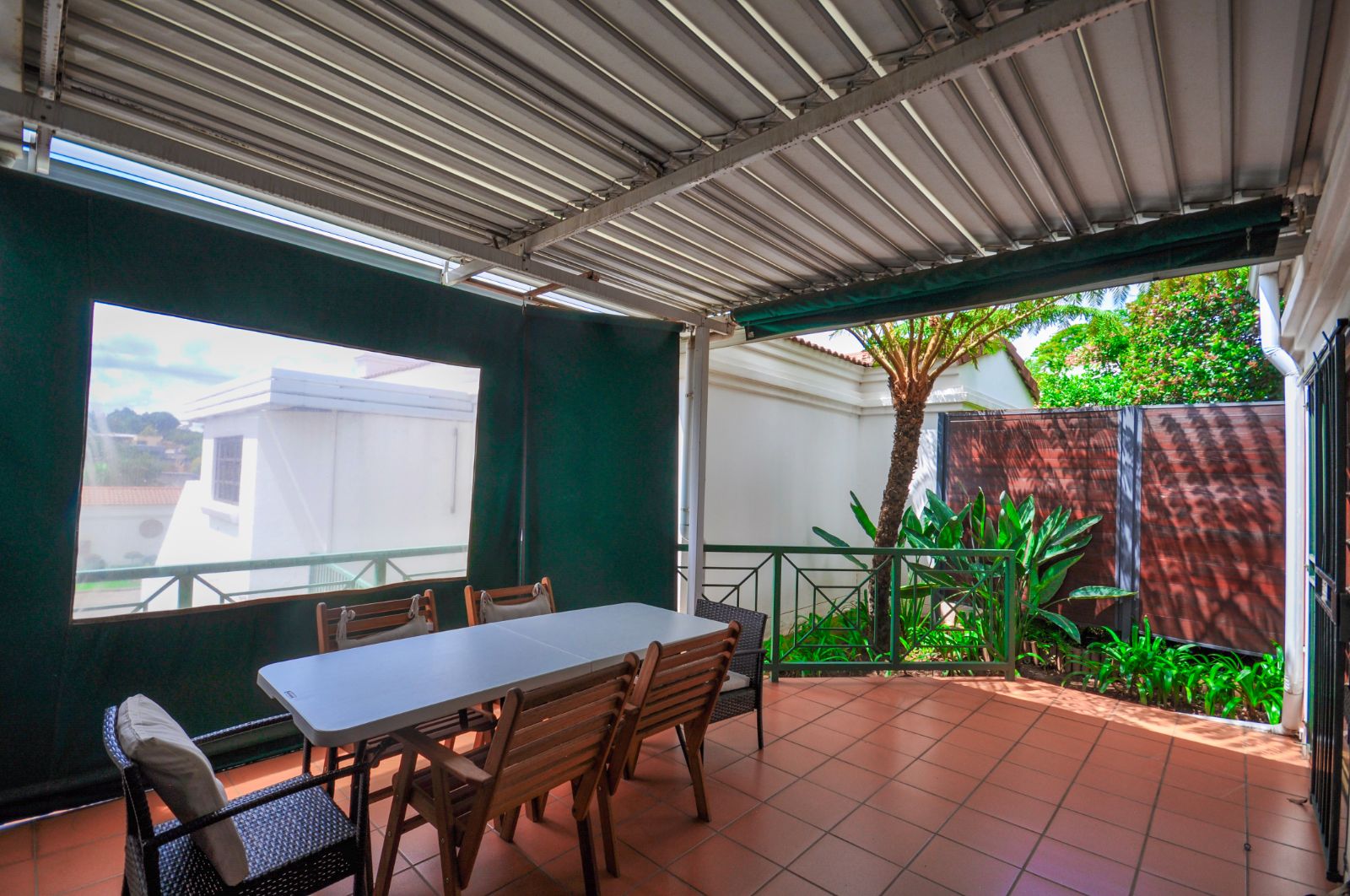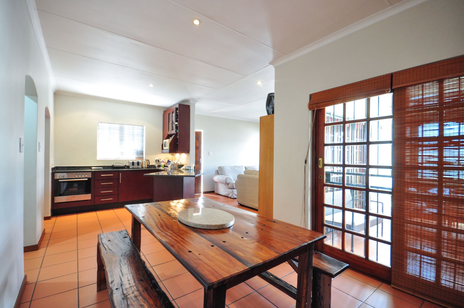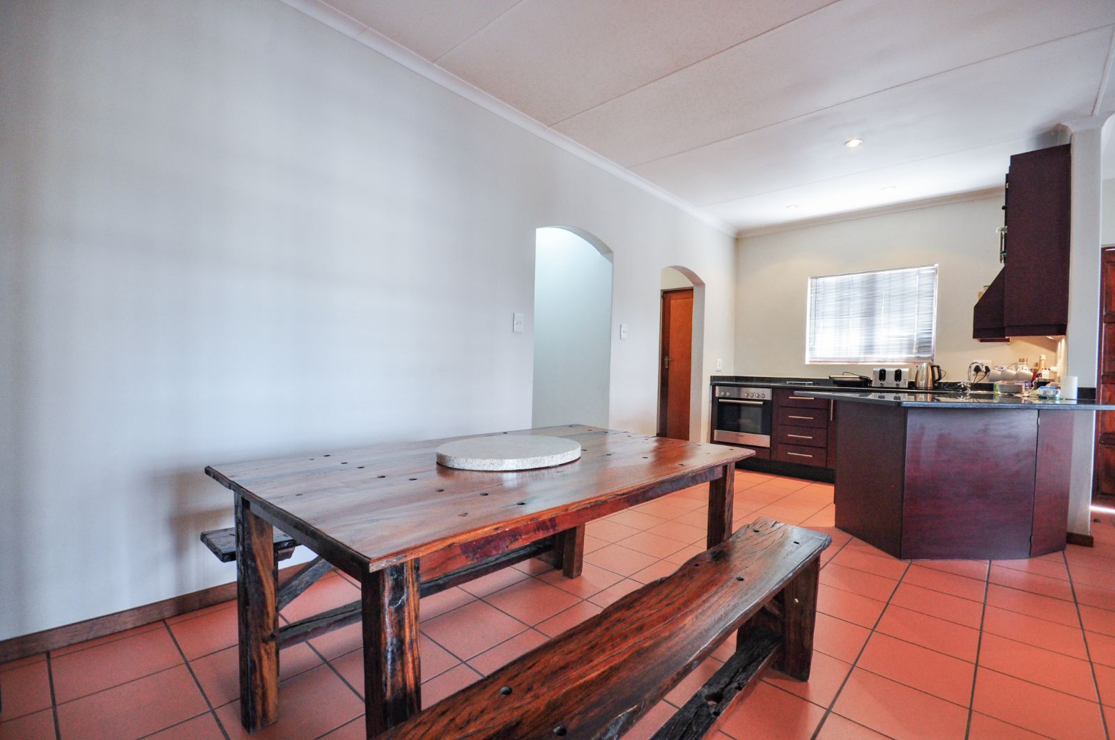 The dining room seamlessly flows onto the outdoor patio, where a built-in braai beckons for entertaining. Canvas blinds, thoughtfully installed, ensure the comfort of the space regardless of weather conditions, allowing for year-round enjoyment of the stunning views that stretch before you.