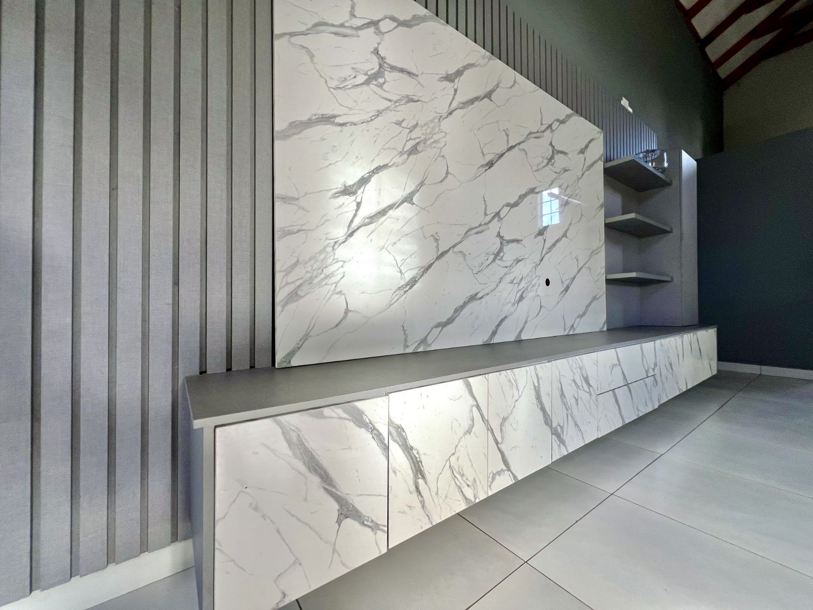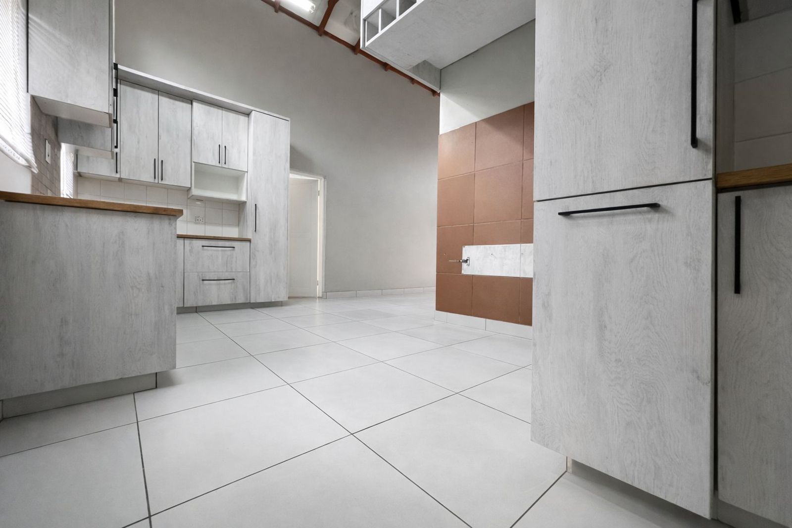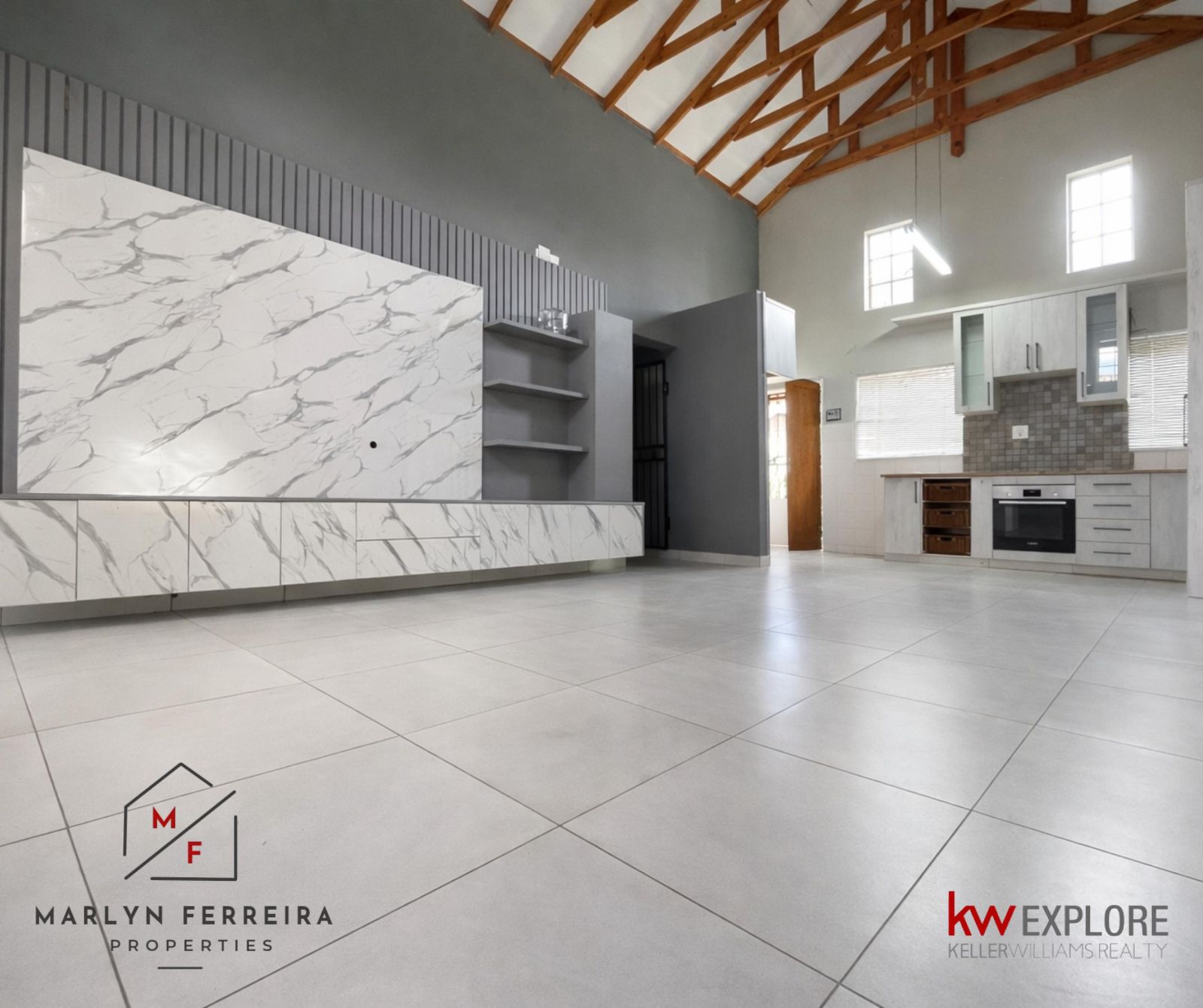 This modern townhouse offers a striking double-volume living area with exposed roof trusses, creating space, light, and architectural character. Open-plan living flows effortlessly into the kitchen, finished with quality tiles and a sleek floating TV stand.