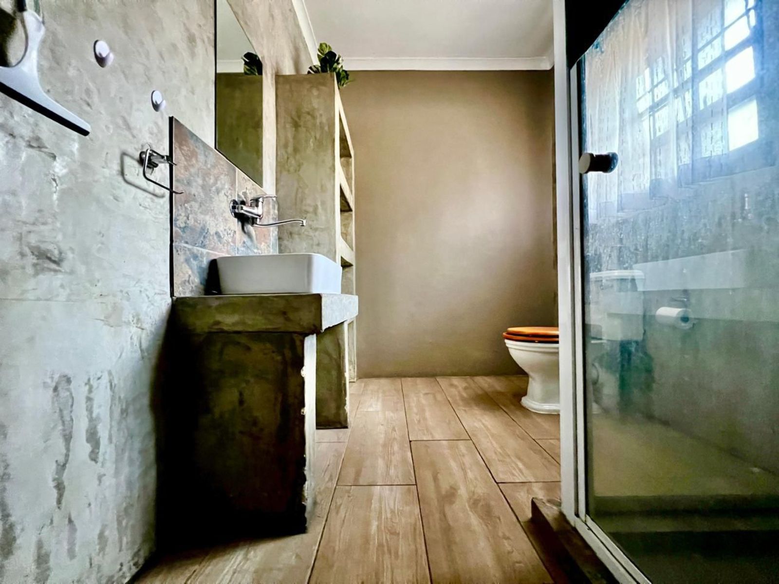 The beautiful kitchen is fitted with stylish cement countertops, adding a modern touch to the space.