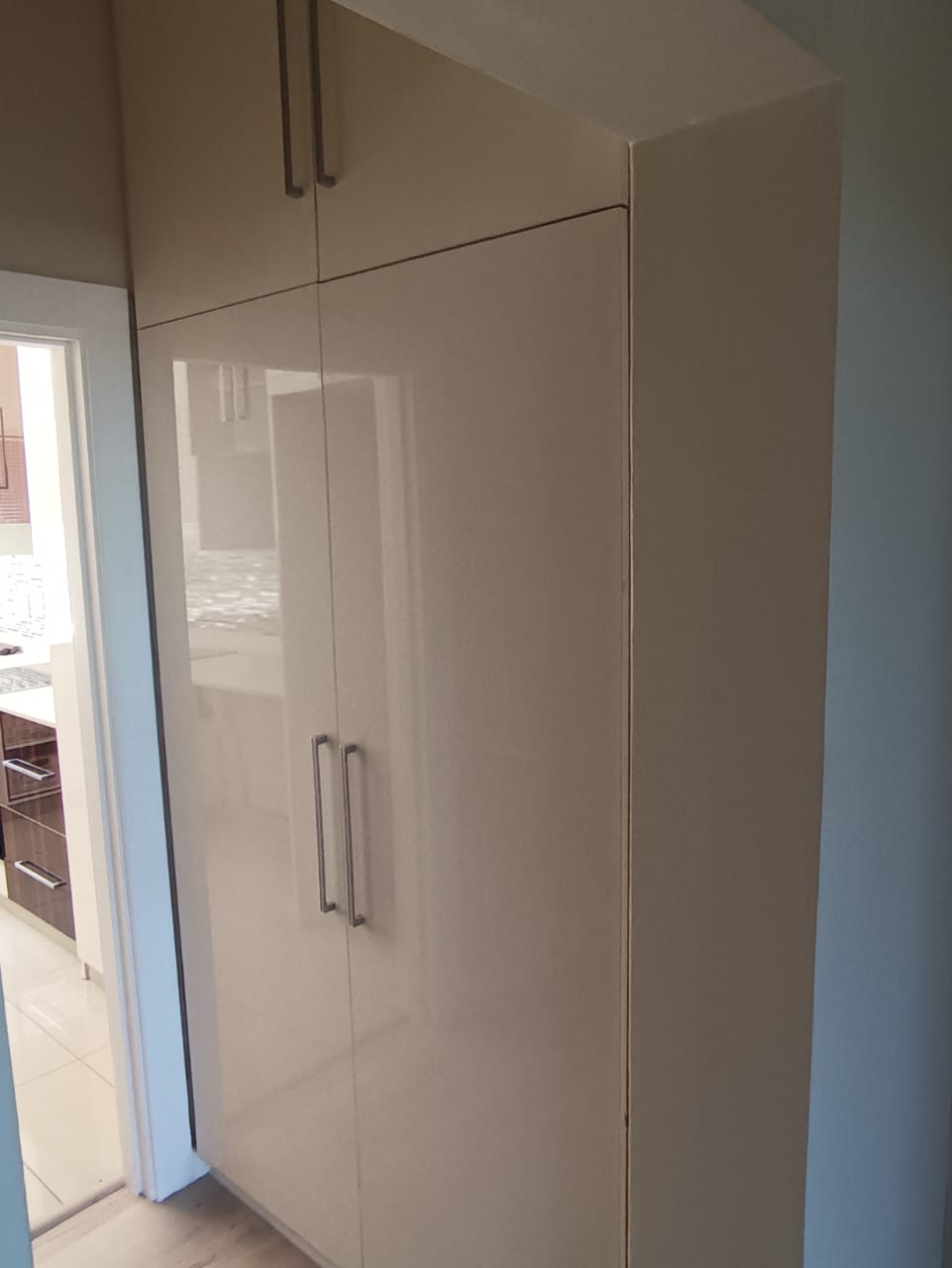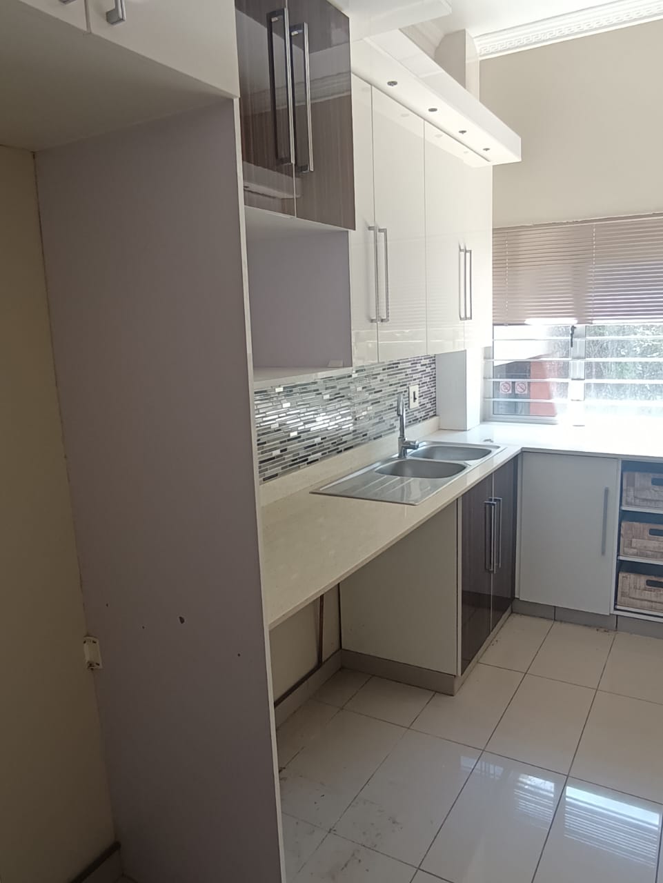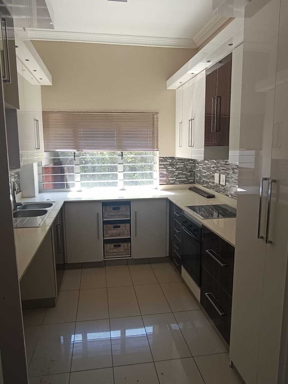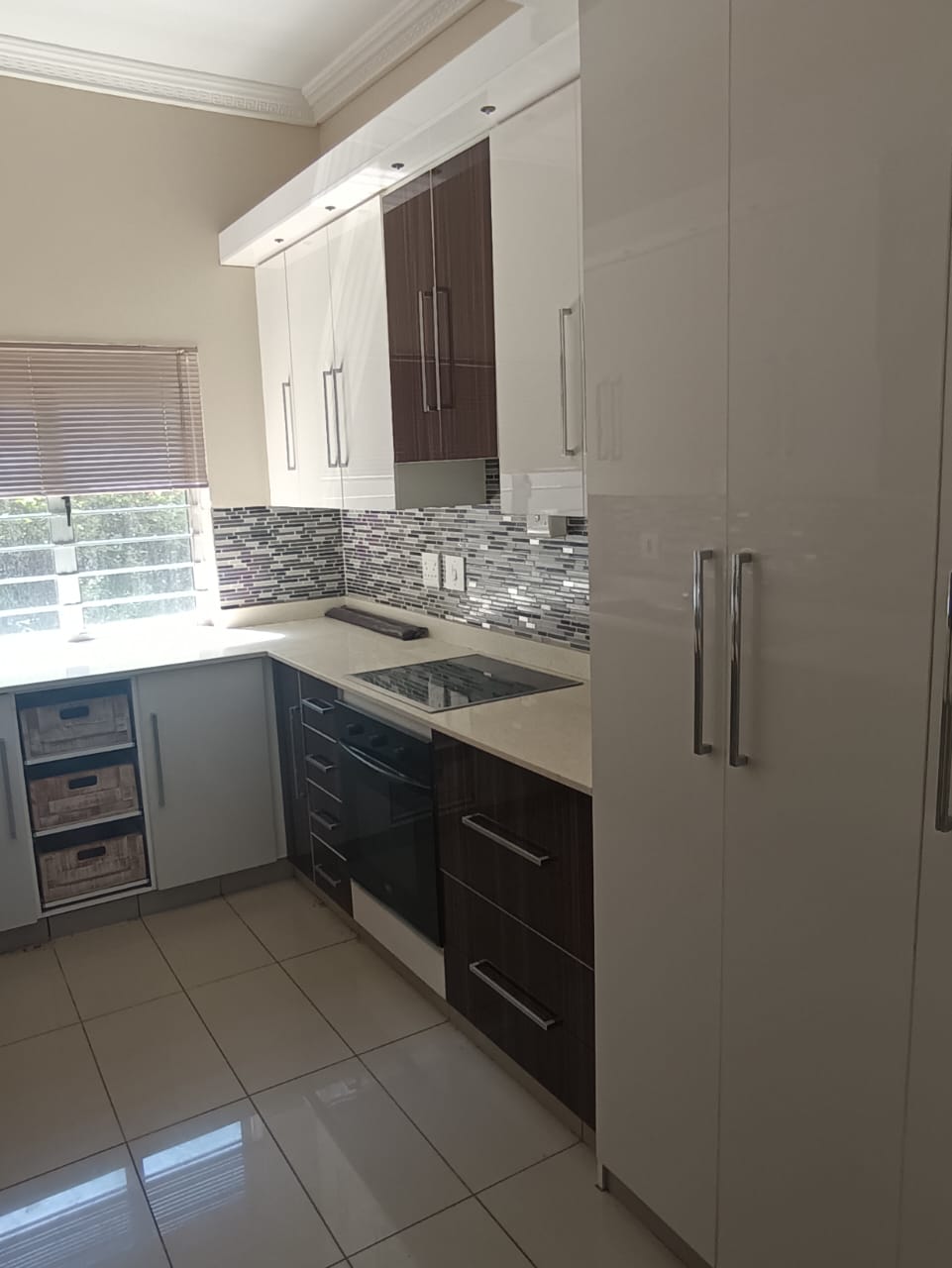 The generously sized kitchen provides space for double undercounter appliances, a double-door fridge, and offers ample storage.