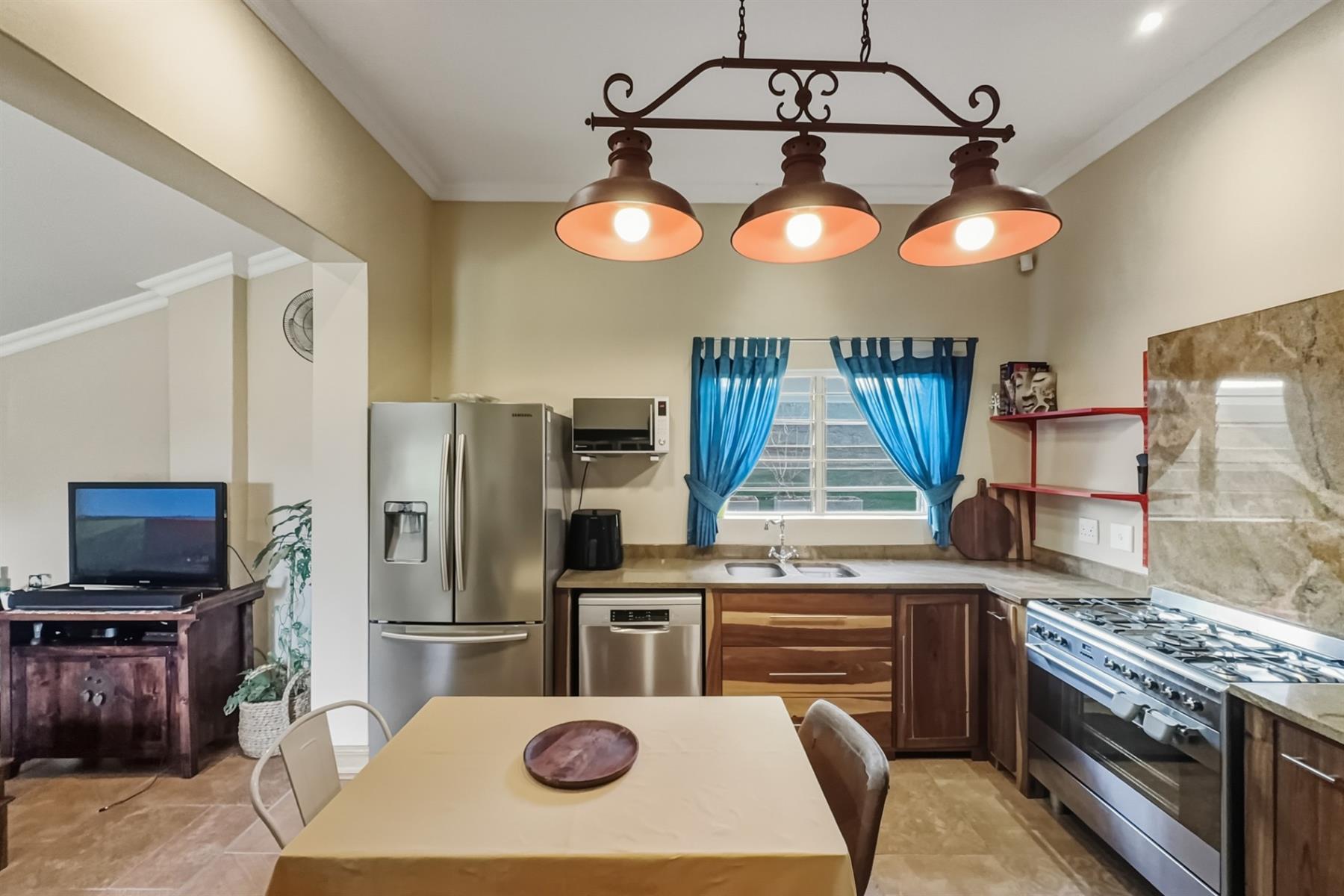 The modern kitchen combines style and functionality with solid wood cabinetry, granite countertops, and a gas stove. Thoughtfully designed for everyday convenience, it’s a space that invites cooking, perfect for family mornings or hosting friends.