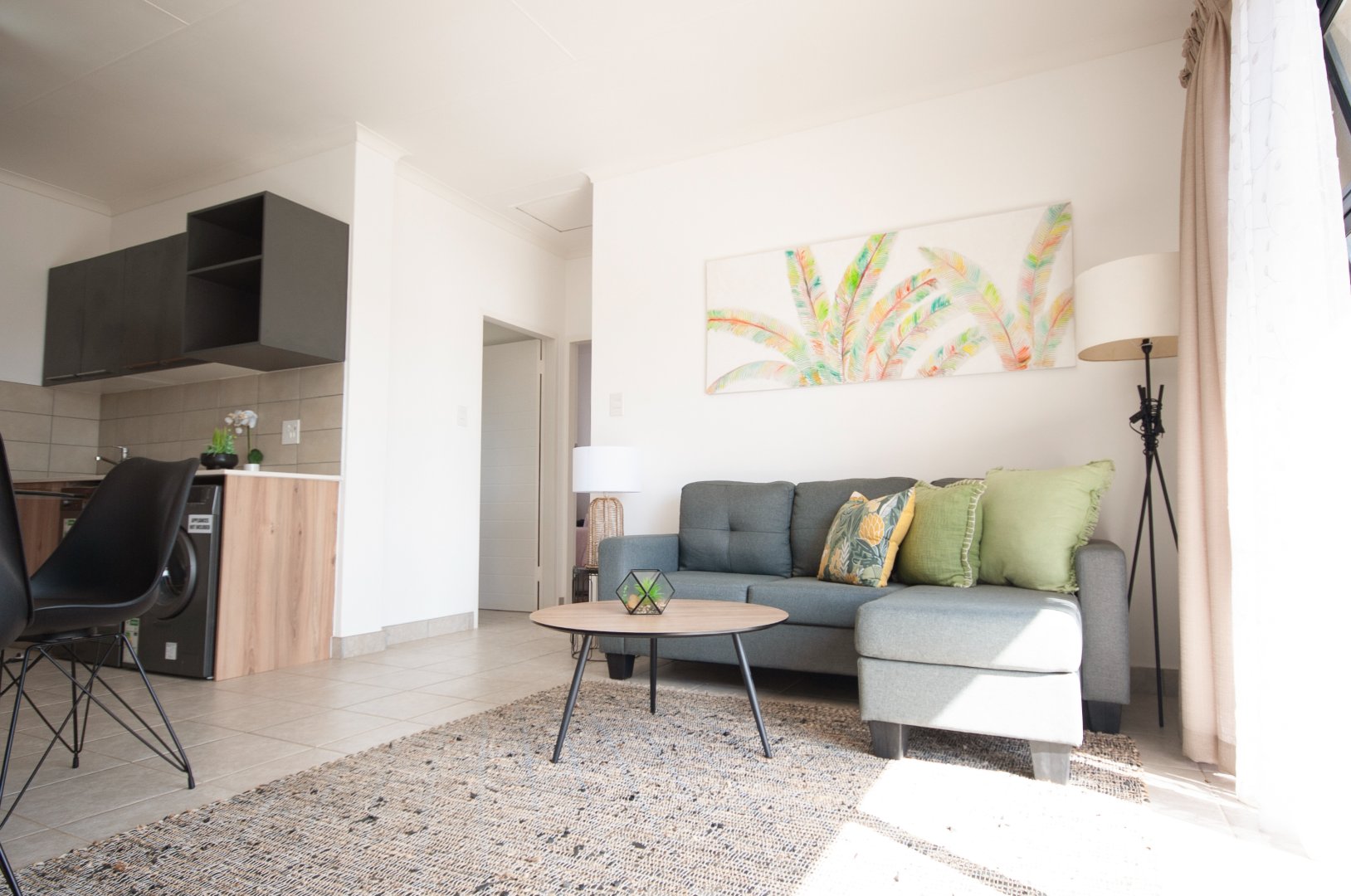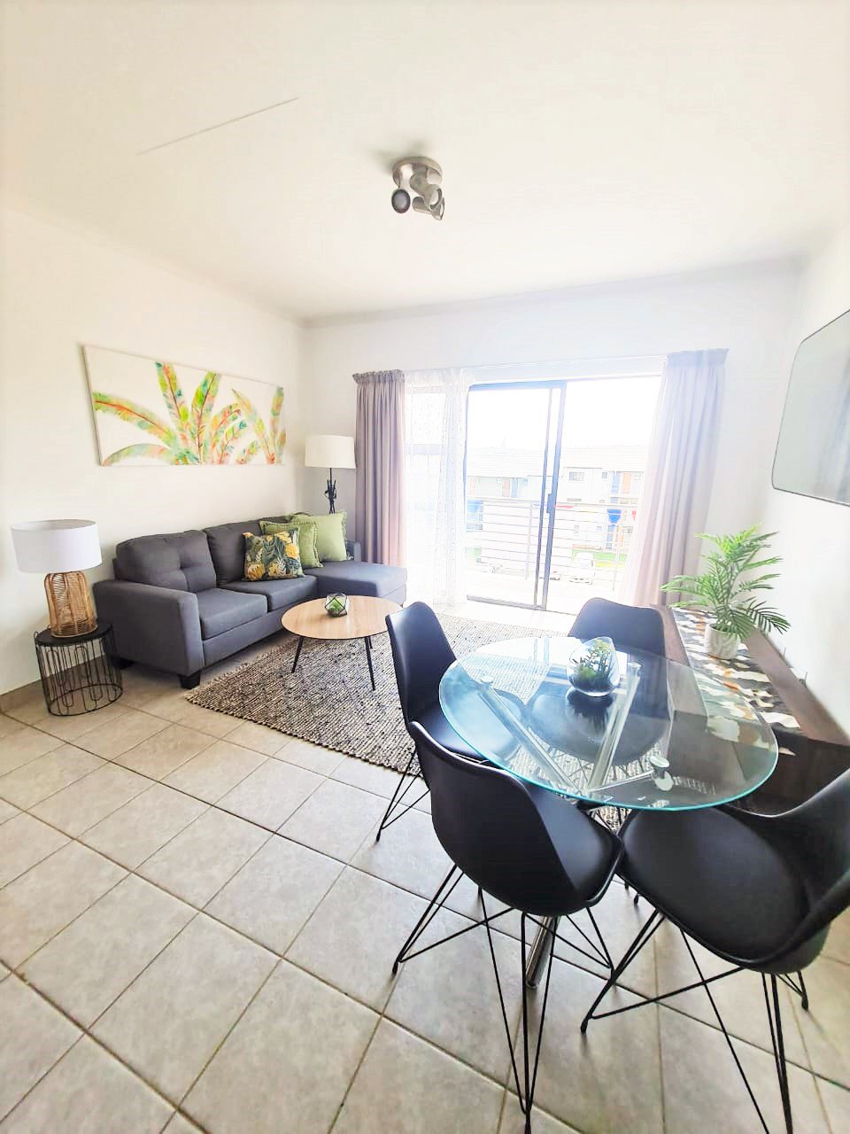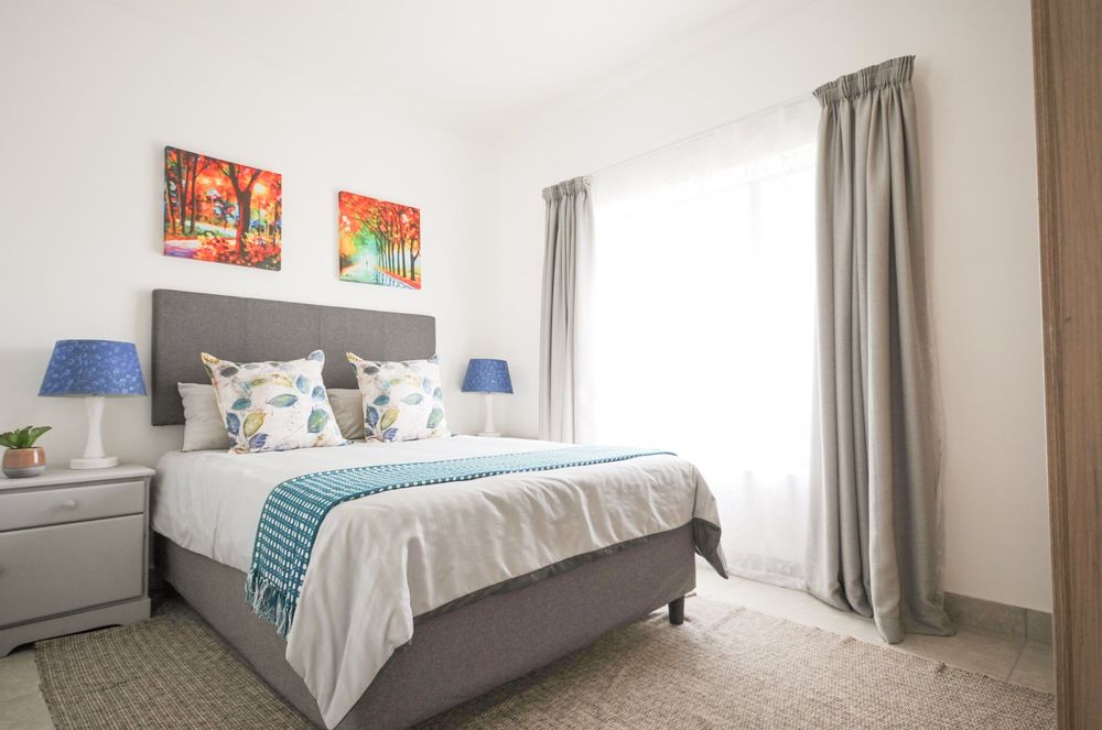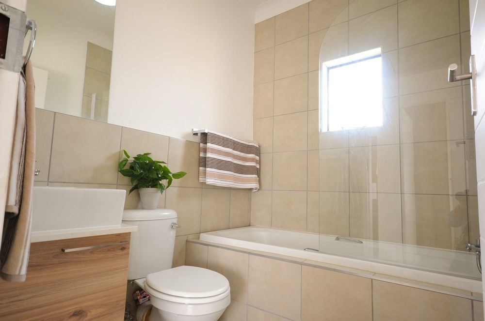 The kitchen and lounge are open plan, perfect for easy cleaning and creates a spacious atmosphere. The kitchen is modern with superb finishes and has ample storage cupboards, a fitted stove hob, and an oven. This 2-bedroom unit comes with a lovely balcony looking out on the estate.