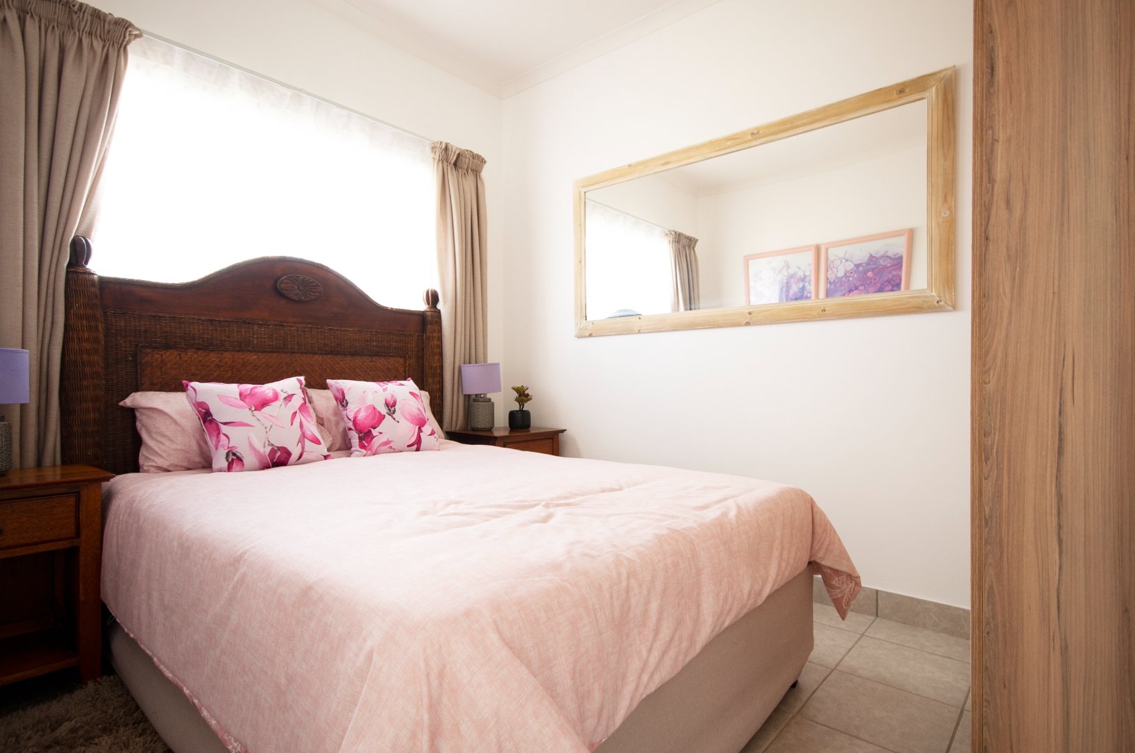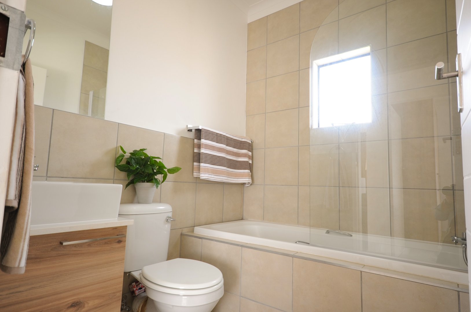 This apartment offers 2 bedrooms with built-in cupboards, big enough for a double bed and bedside tables. It features a shared full bathroom with modern finishes. Nature-filled activities are just around the corner.