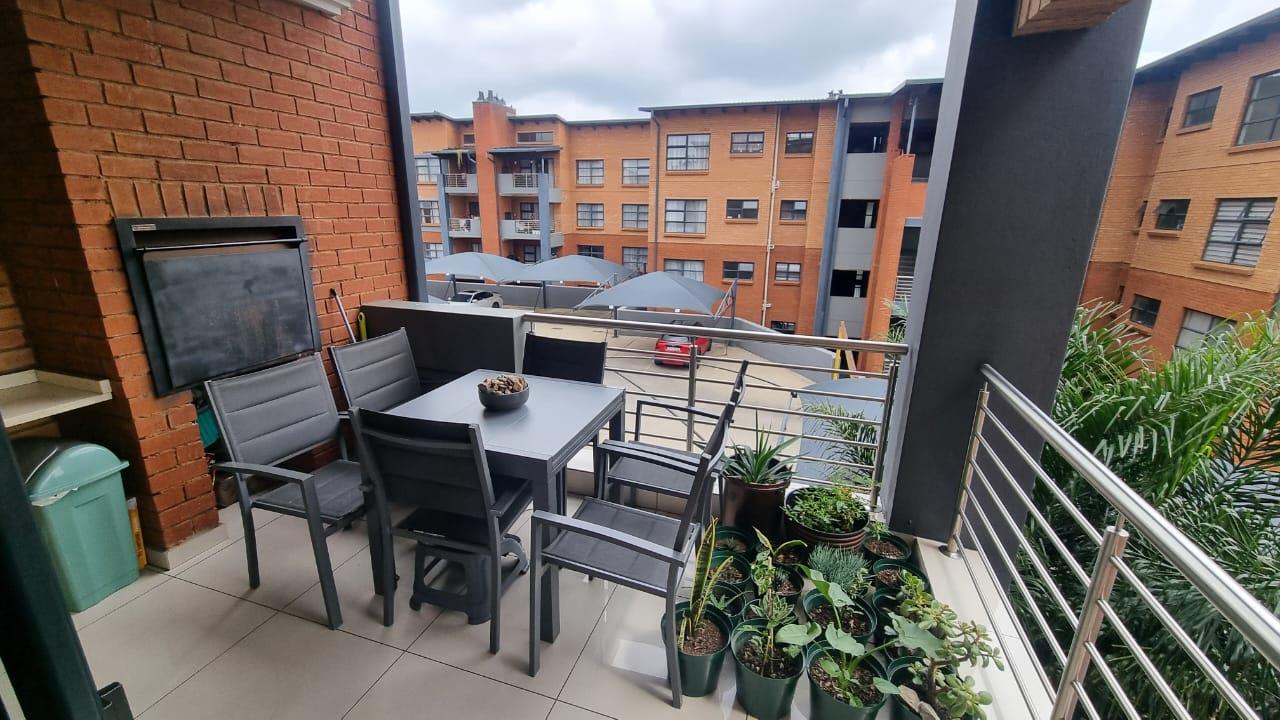 The expansive lounge and dining area flow seamlessly onto a private balcony patio, perfect for relaxation or entertaining guests. This charming outdoor space includes a built-in braai, enhancing your leisure experience.