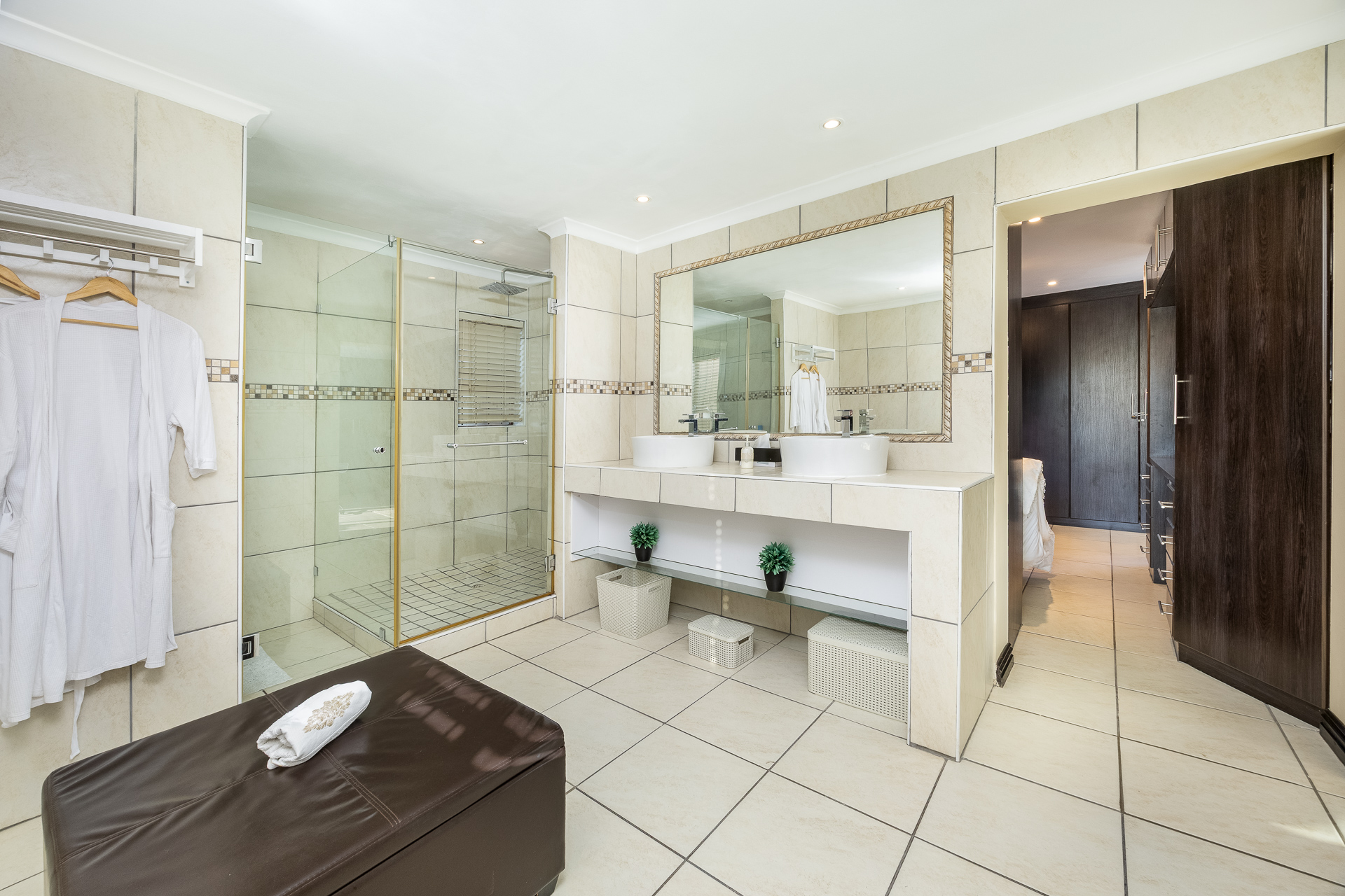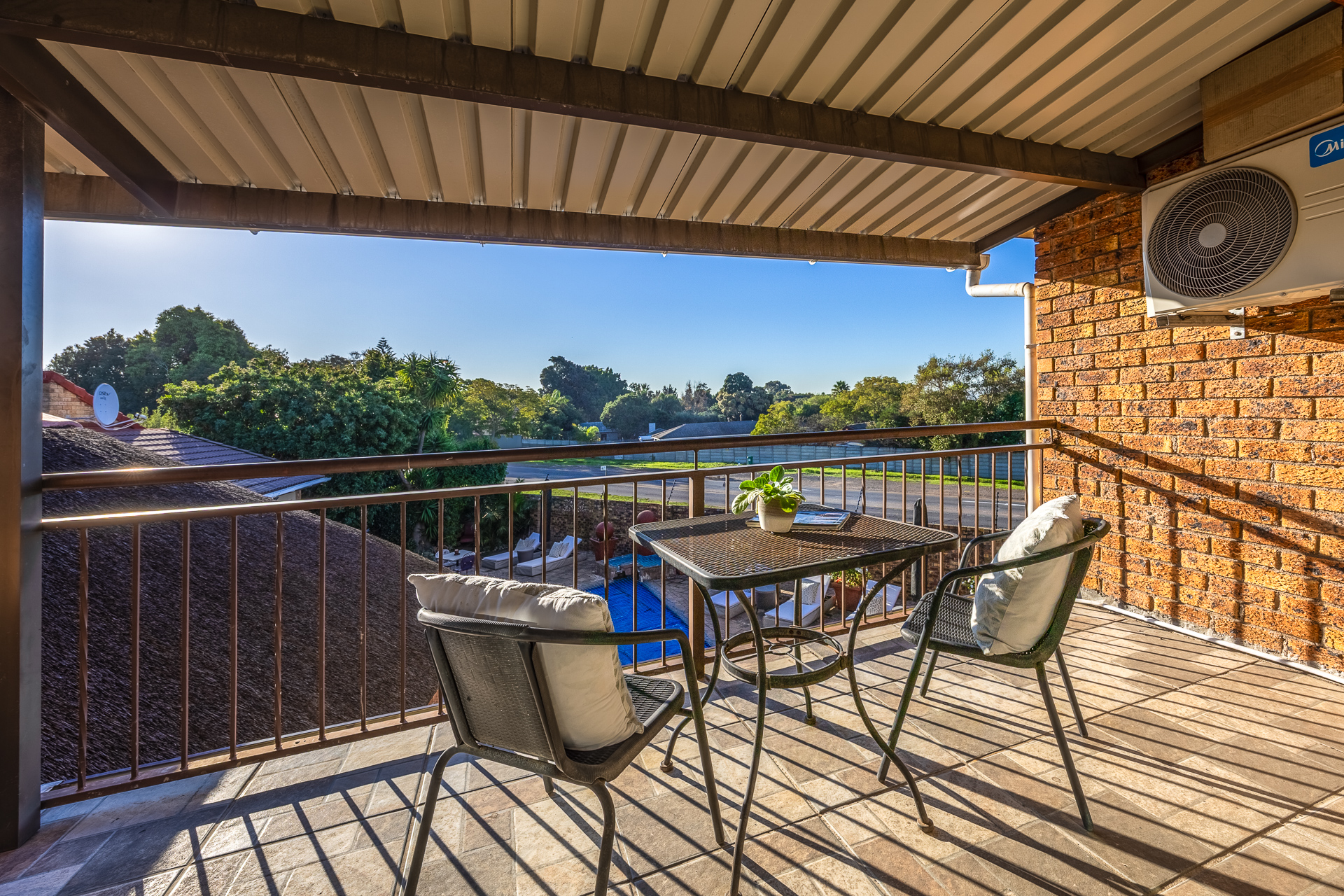* Main bedroom upstairs with air conditioning, open-plan en-suite bathroom (double basin, corner bath, shower), and private balcony