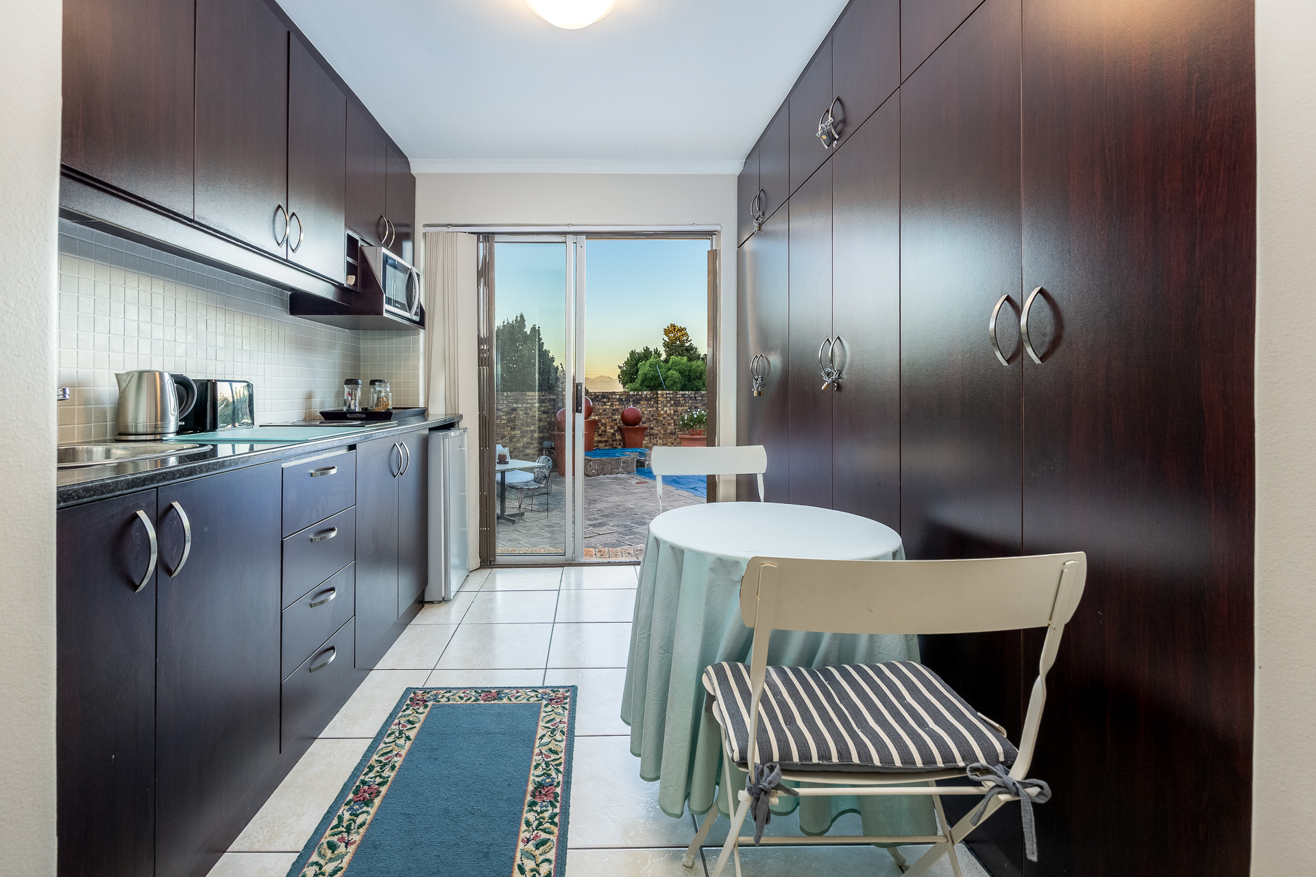 * Built-in stove, fridge in cupboard, and sliding doors to pool