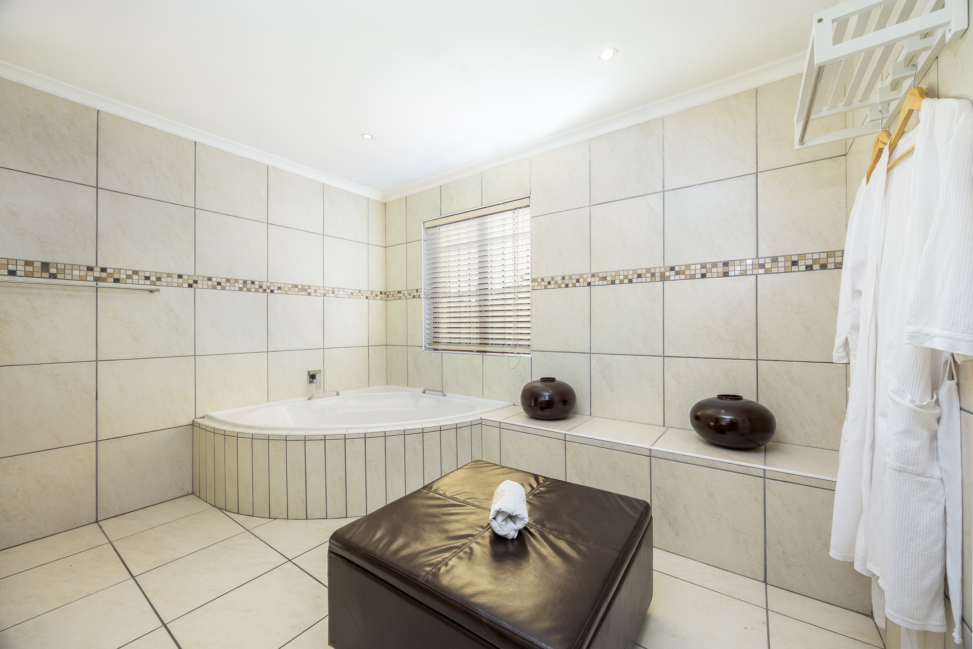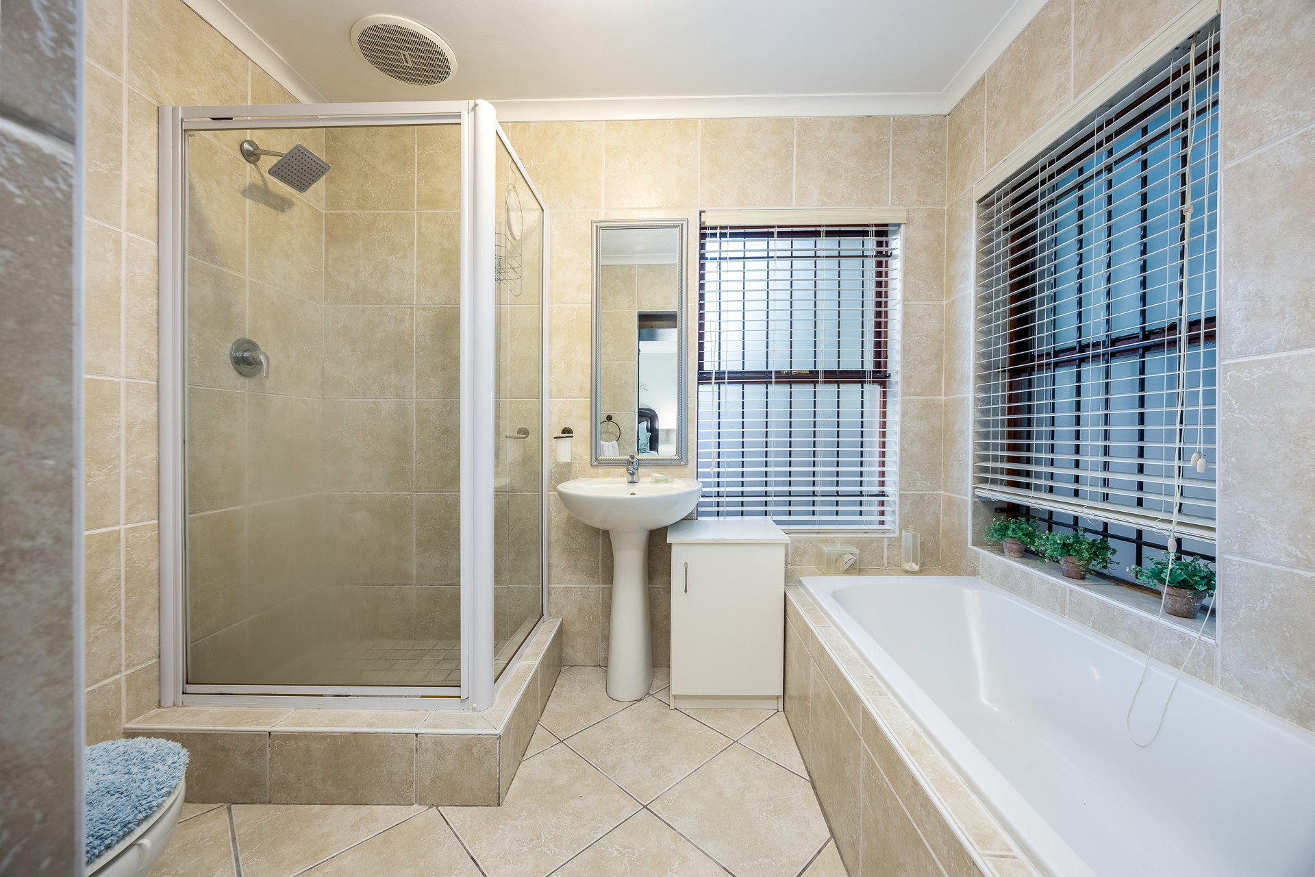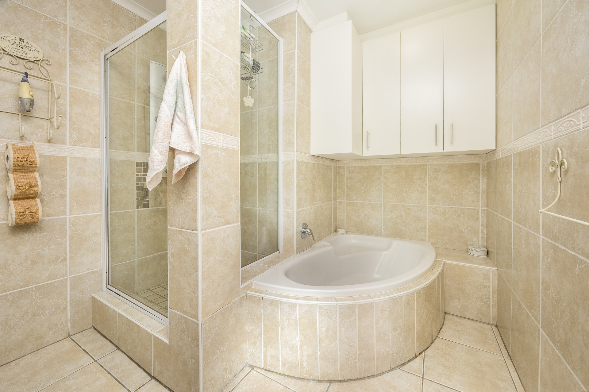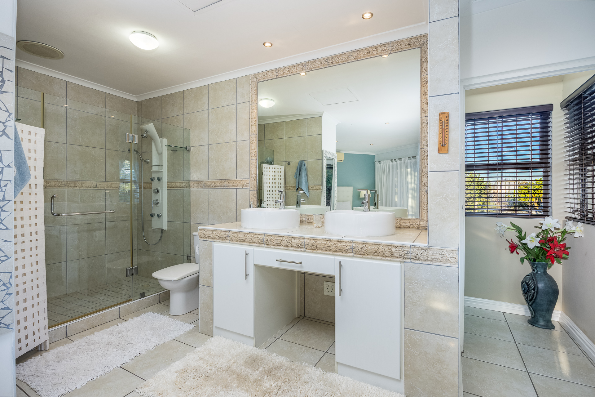 * Bathroom with corner bath, shower, toilet, and double basins
