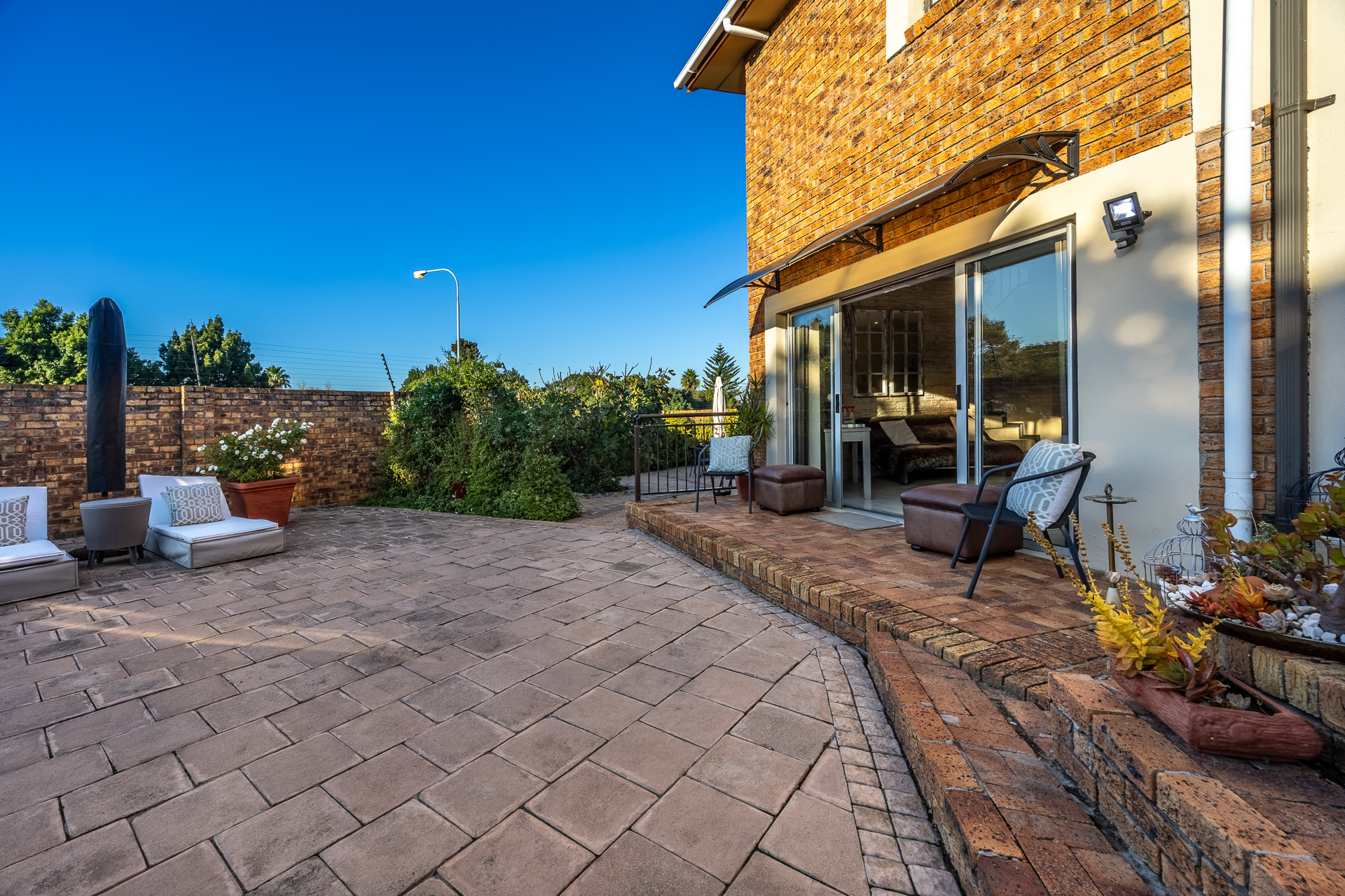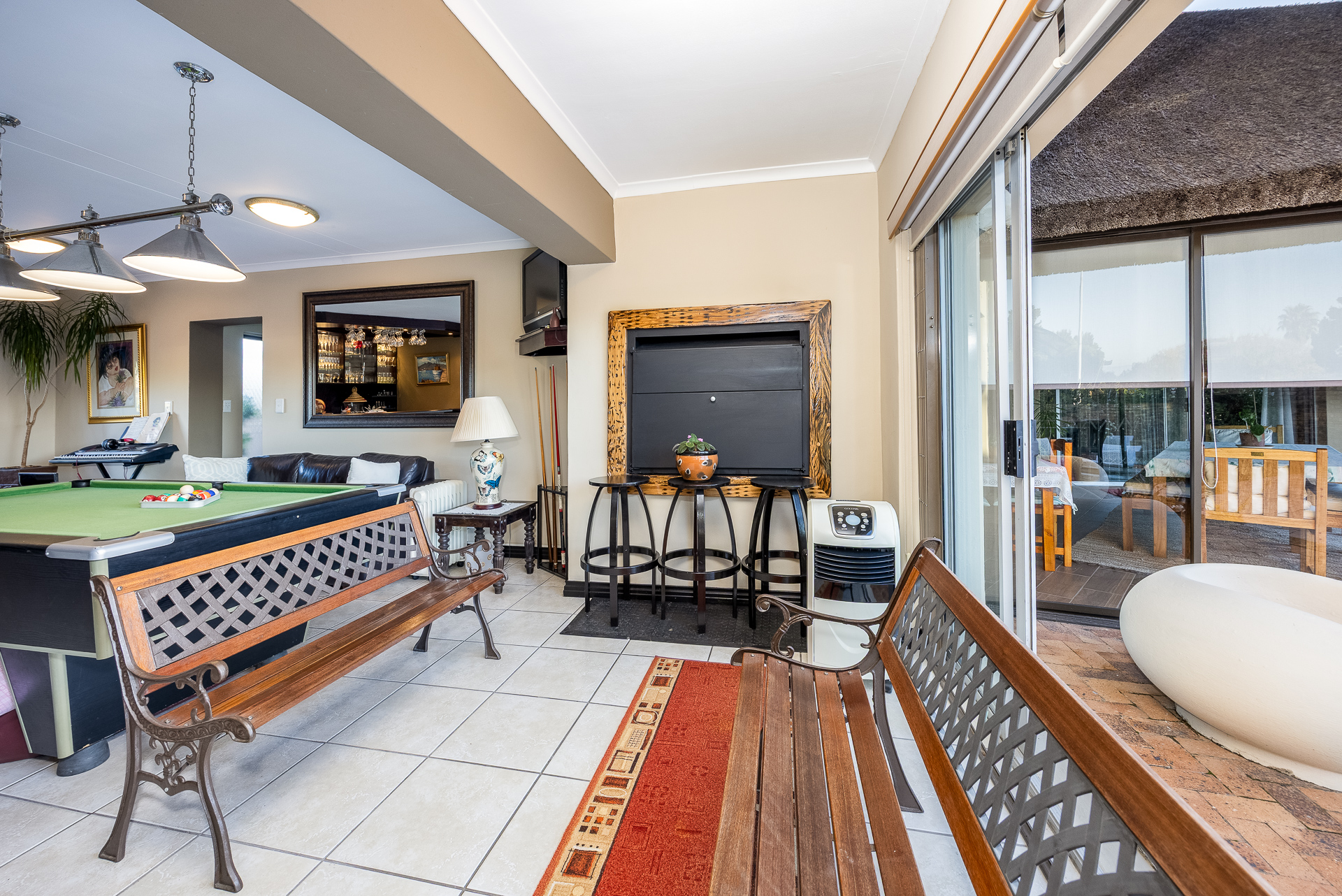 * Sliding doors open to the pool and patio area