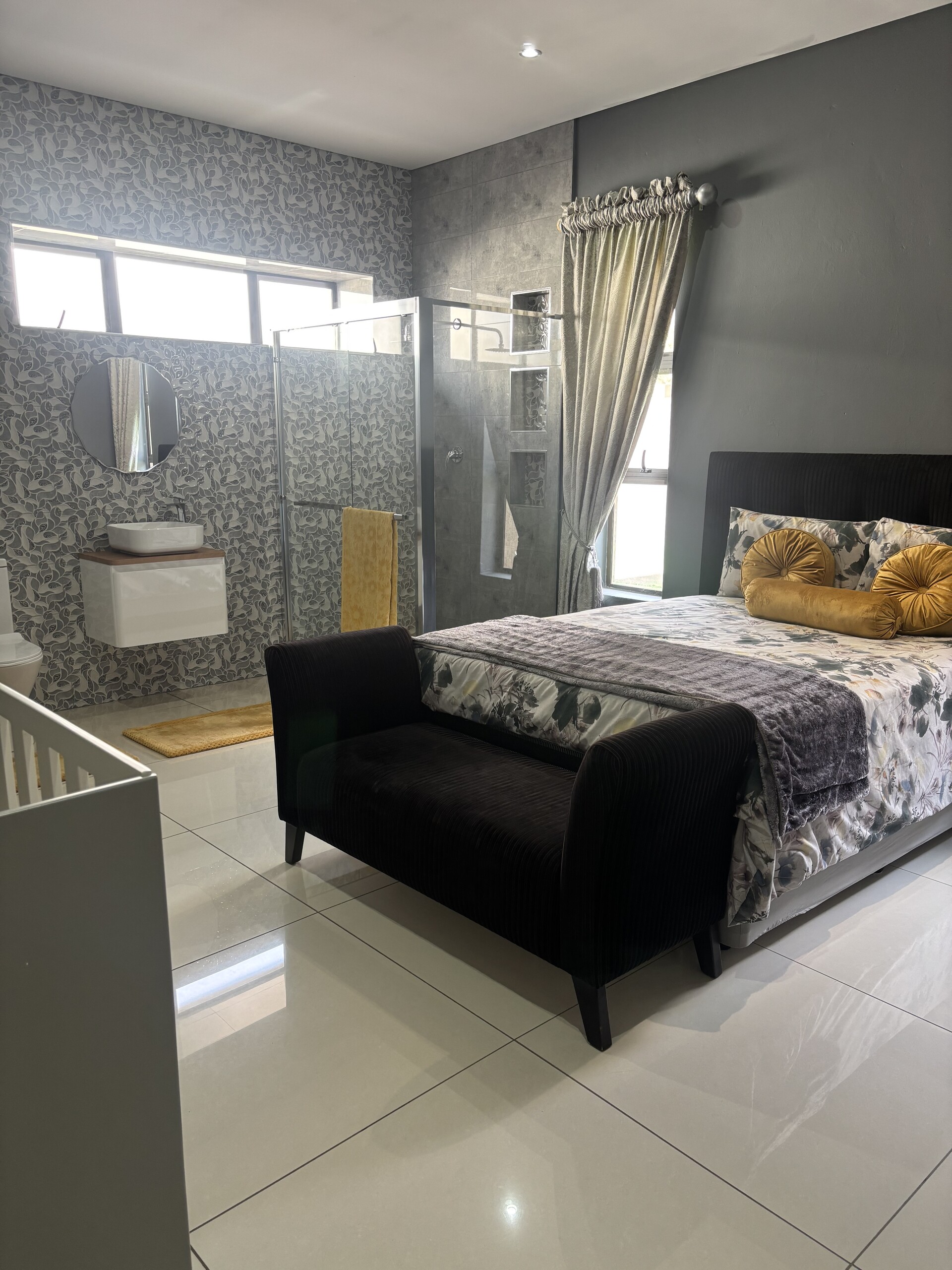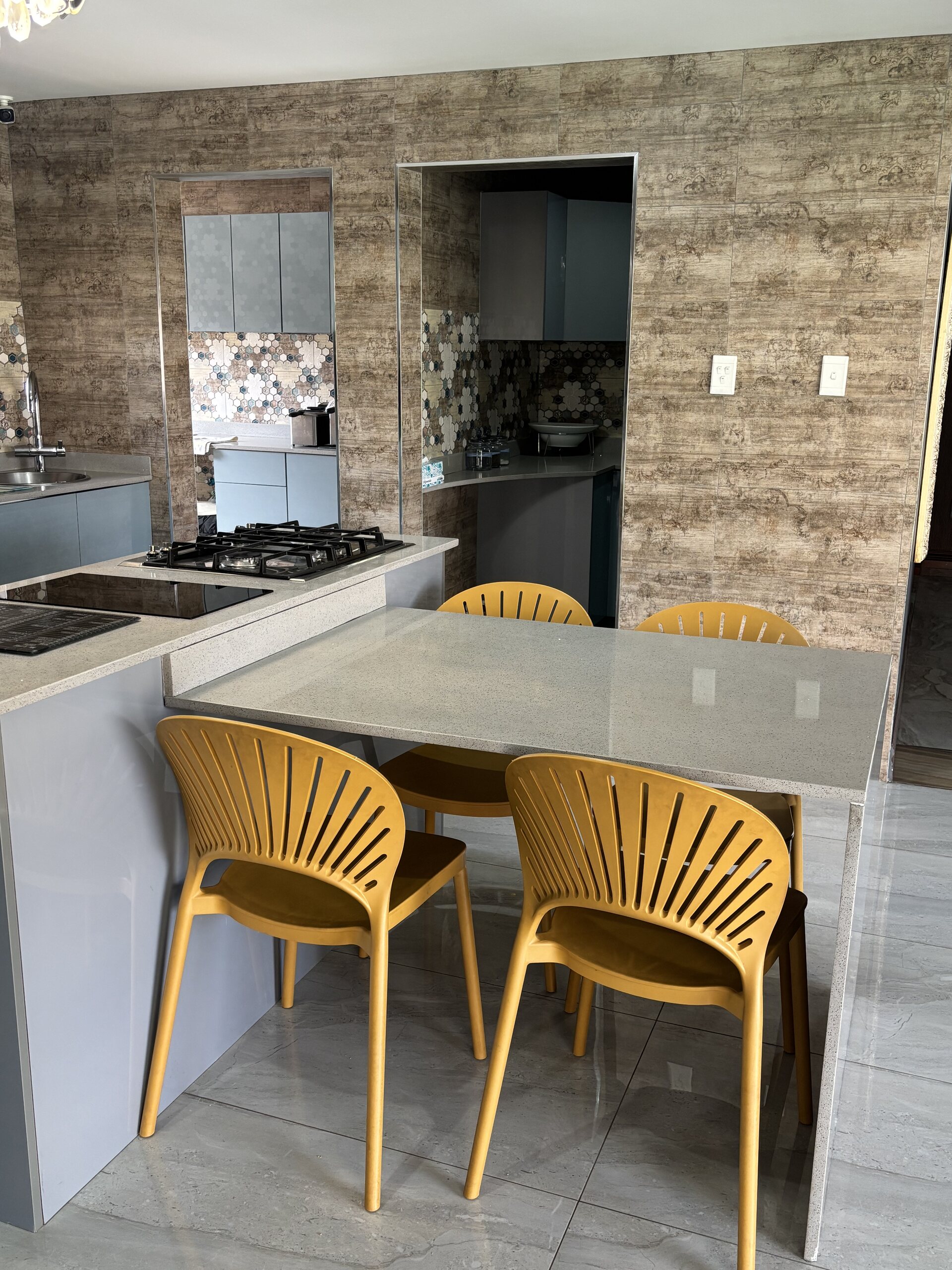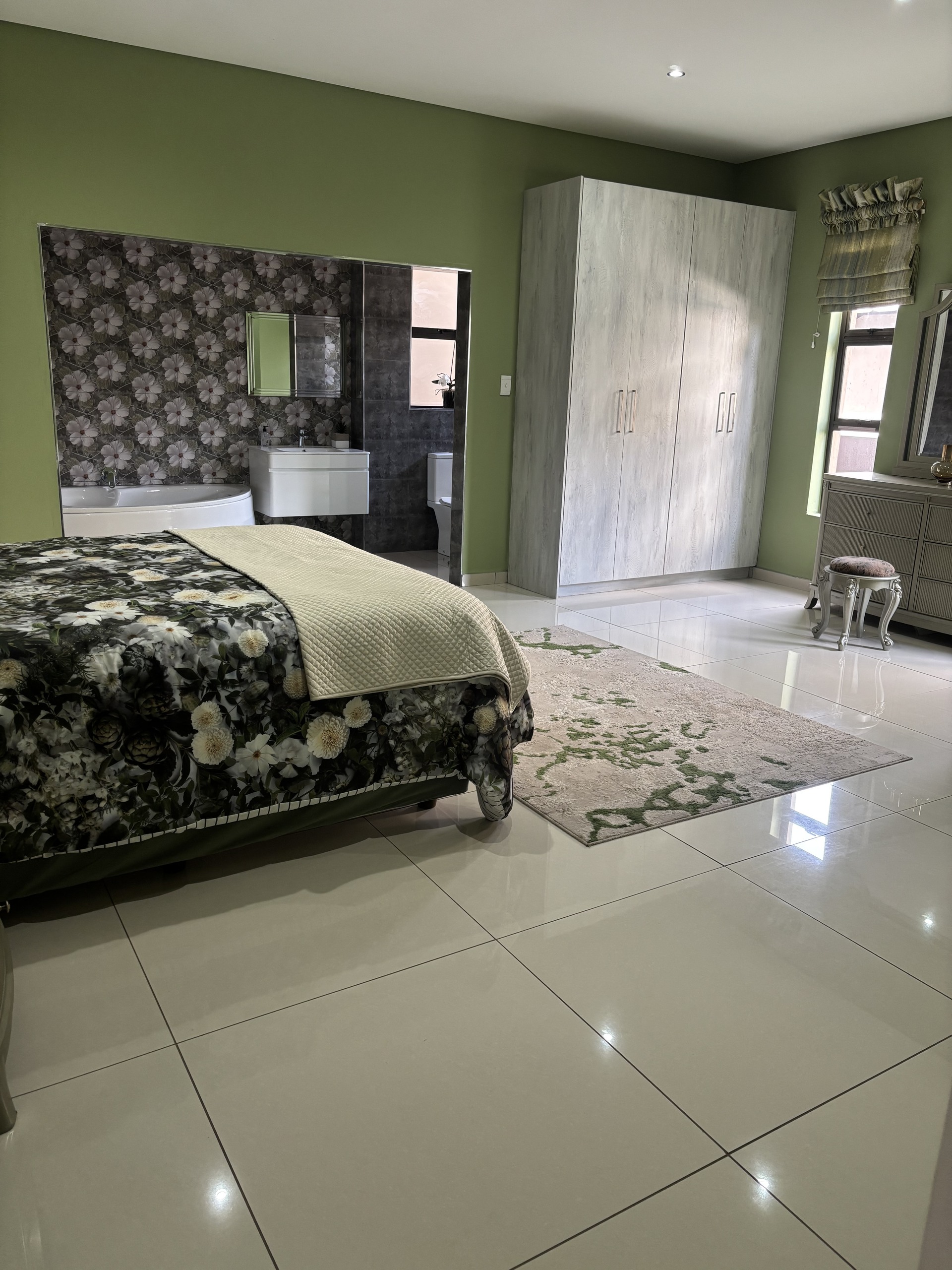 Moving upstairs, you’ll discover a private pyjama lounge with a charming wood-burning fireplace. The remaining three-bedroom suites are also located on this level, with the master bedroom featuring a luxurious bathroom suite and a vast walk-in closet. All the bedrooms have access to balconies. The upper floor also houses a gym, a study, and a laundry room. This home has a pool and caters to every need, offering a staff room and even parking for a golf cart!