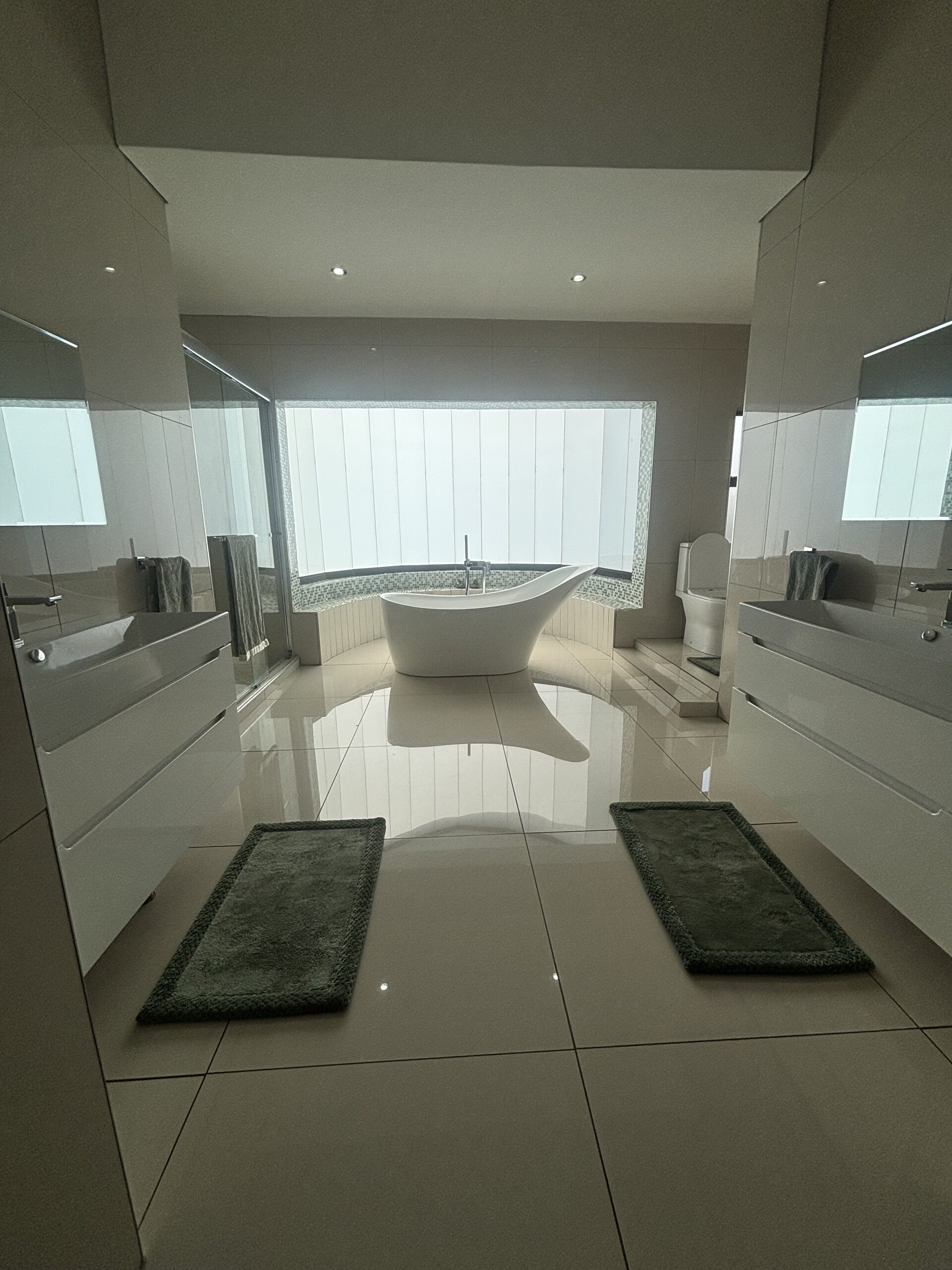 This exceptional pet-friendly home is defined by its generous space and abundant natural light. Upon arrival, you’re welcomed by a striking double-volume entrance and a bright reception area. The ground floor showcases the north-facing stacker doors as the focal point. A built-in bar and guest powder room are conveniently located downstairs. The garage doors on either side of the entrance provide direct access. The entertainment area wraps around a covered patio, complemented by a sunken lounge and a cosy TV room. Additionally, two spacious guest bedrooms are on the lower level, each with an open, roomy en-suite bathroom.