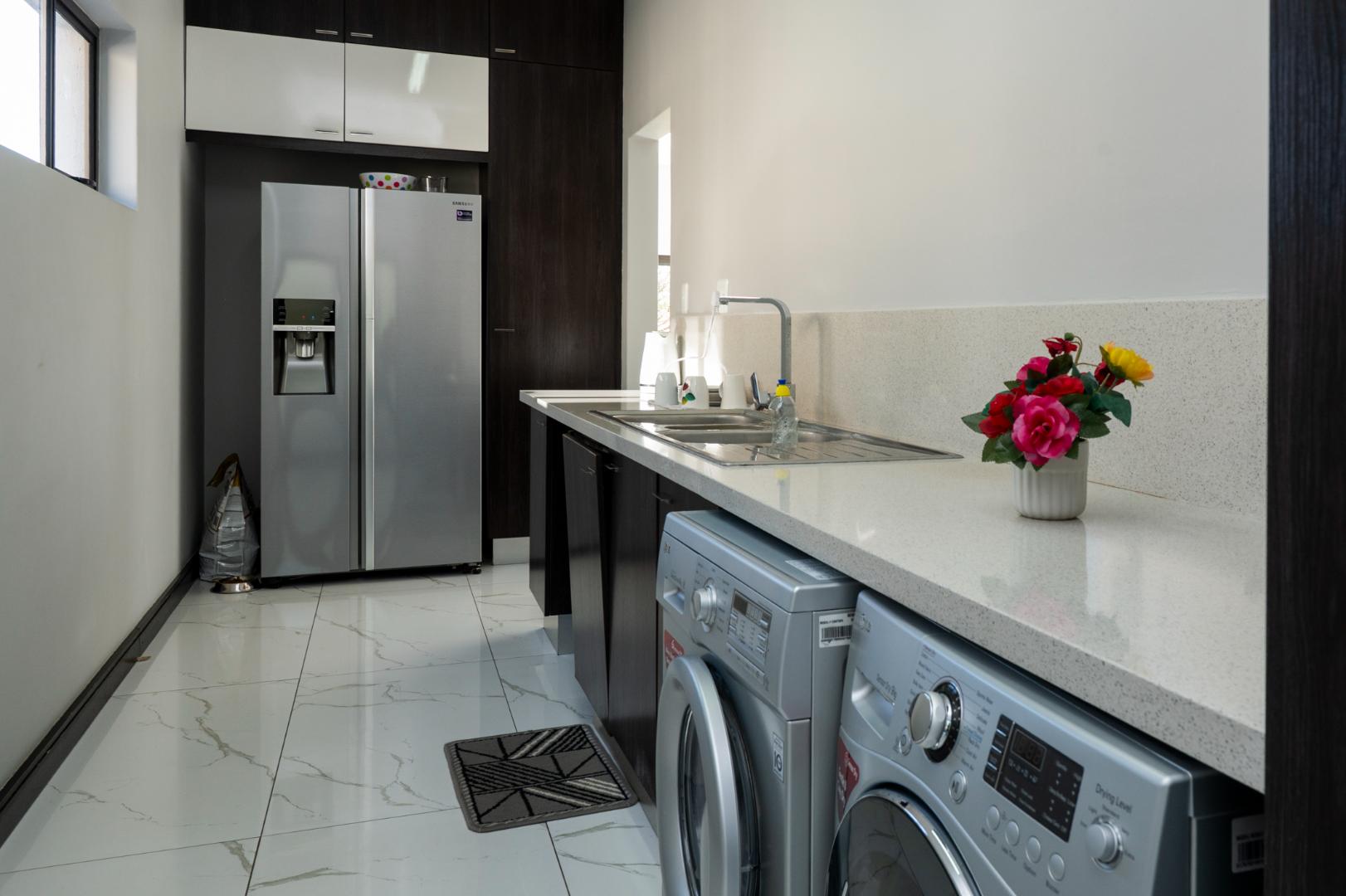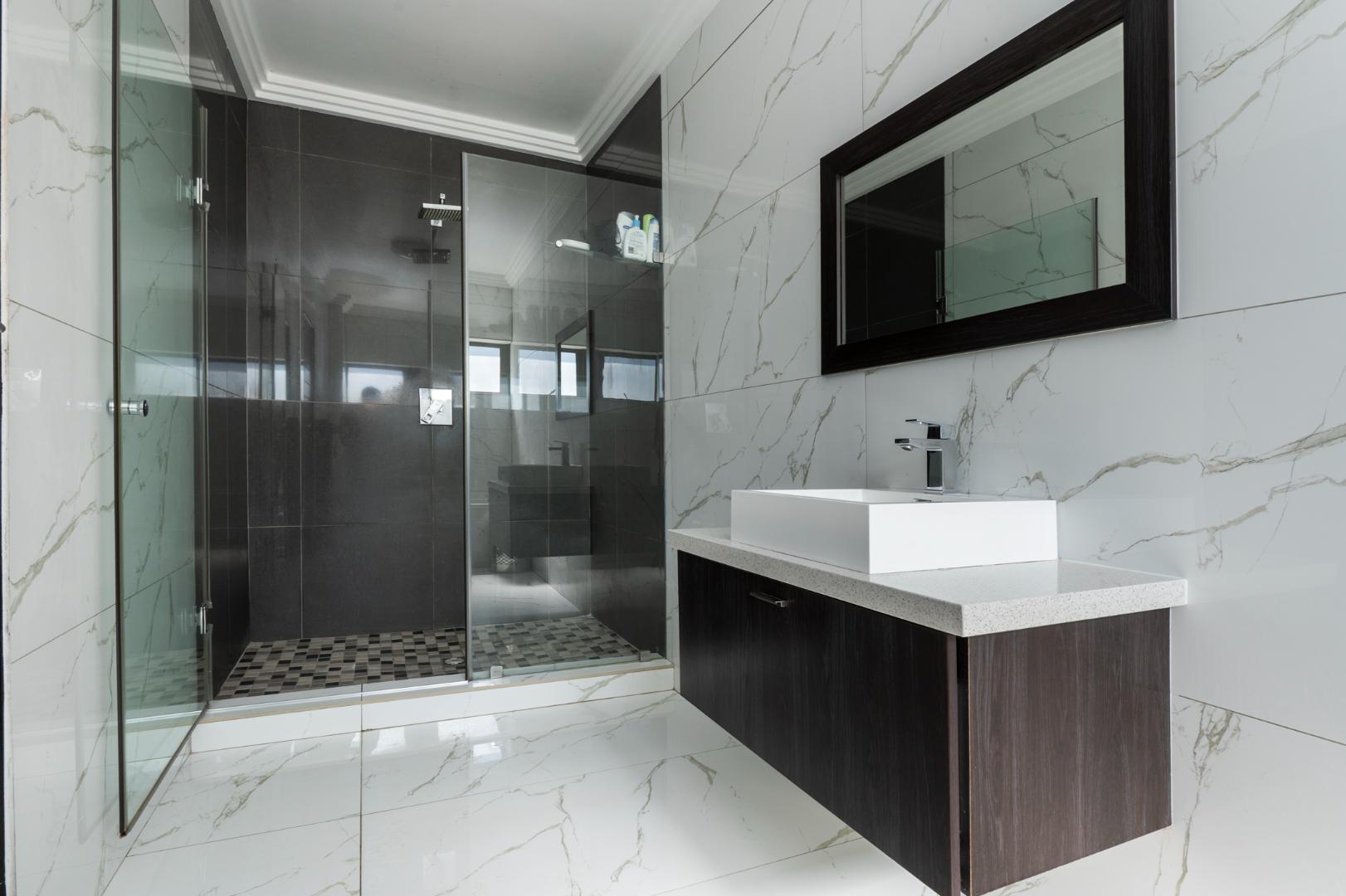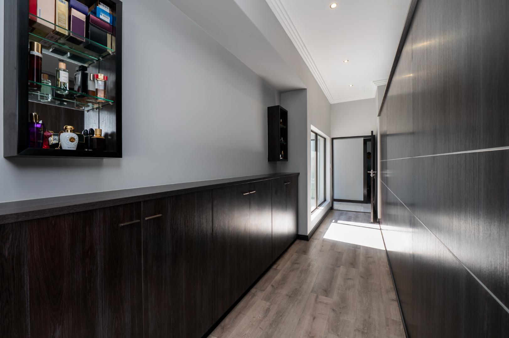 As you enter this architecturally designed home, a stunning chandelier illuminates the entrance area, setting the tone for the home’s elegance with double volume glass and frameless glass feature staircase which adds a modern touch and allows natural light to flow through the home. The downstairs large open plan living area hosts a comfortable formal lounge, spacious kitchen and dining room.