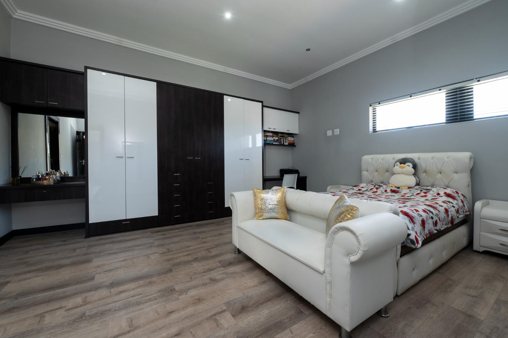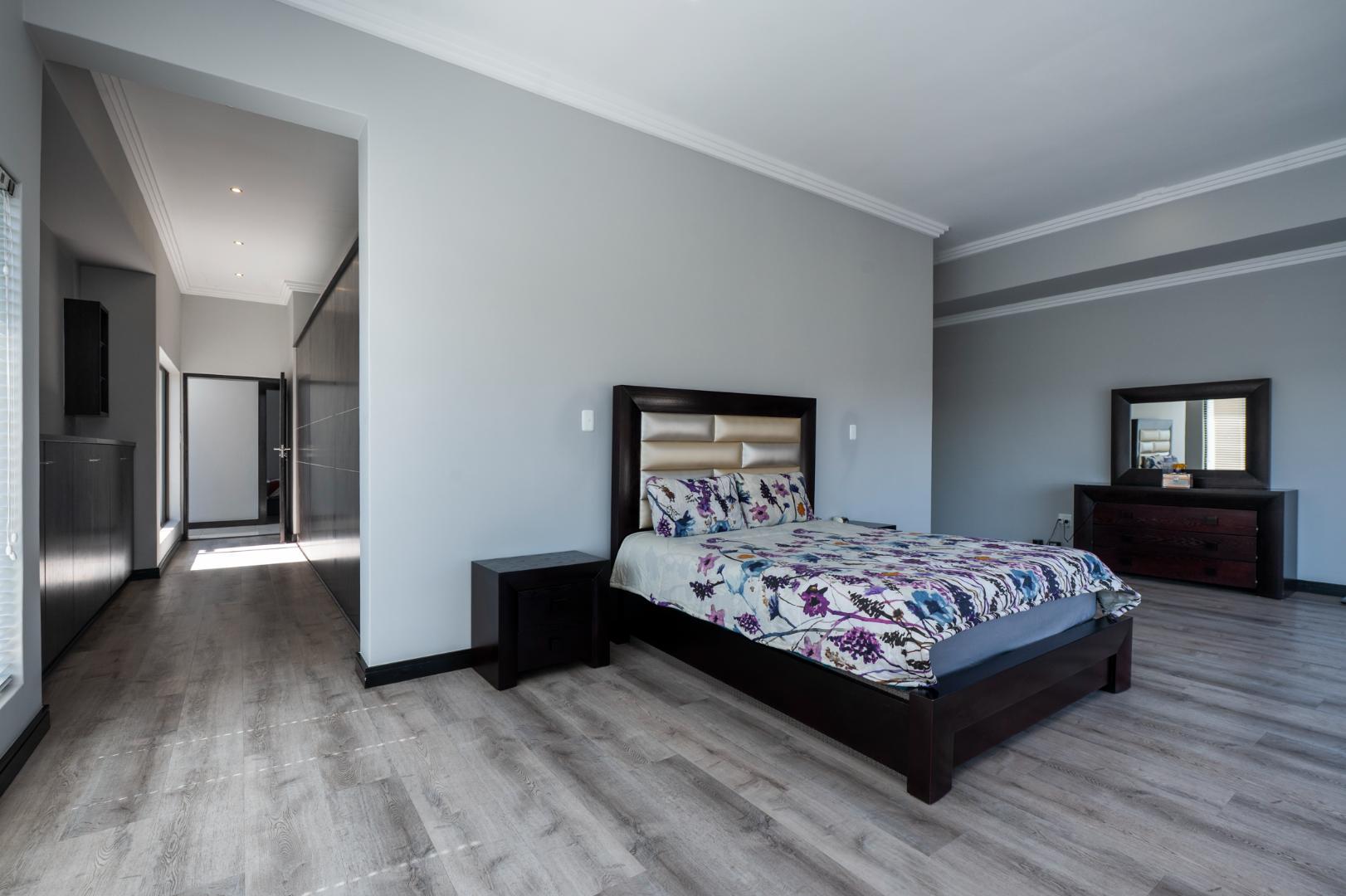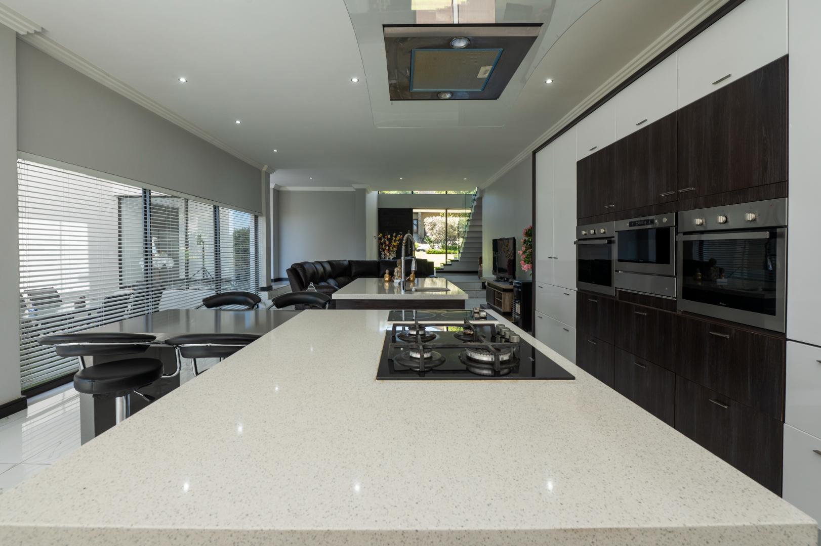 The modern, open-plan kitchen is a true centrepiece of family gatherings equipped with premium appliances, sleek finishes and ample space for culinary creativity. This open-plan living space flows effortlessly to the dining room with stacking doors to a sparkling pool and outdoor entertainment area. Beyond the landscaped garden, uninterrupted views of the prestigious Greg Norman’s 15th fairway golf course