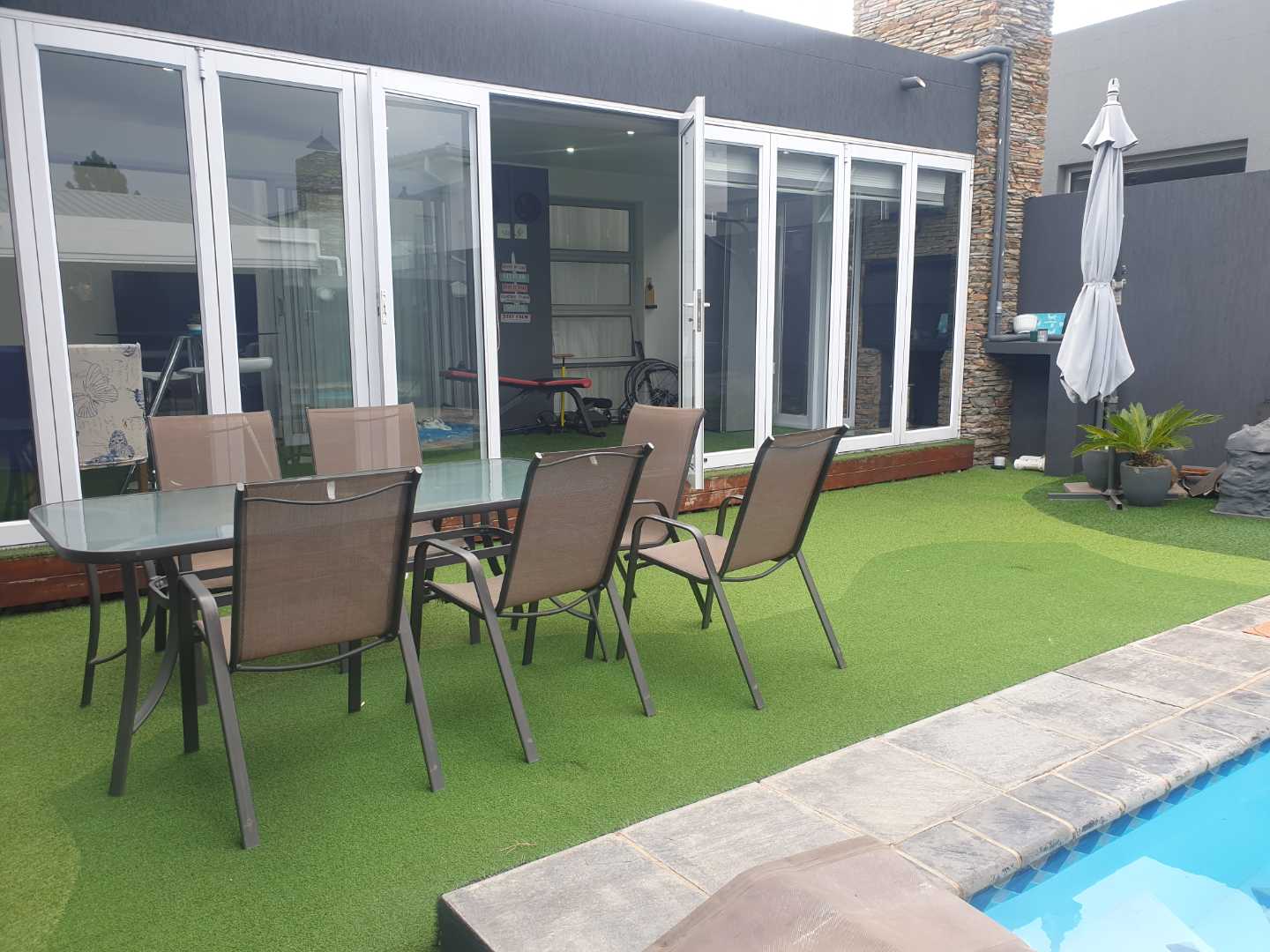The lounge leads to a Lovely enclosed built in braai area with stack up doors leading to the pool surrounded with astro turf .