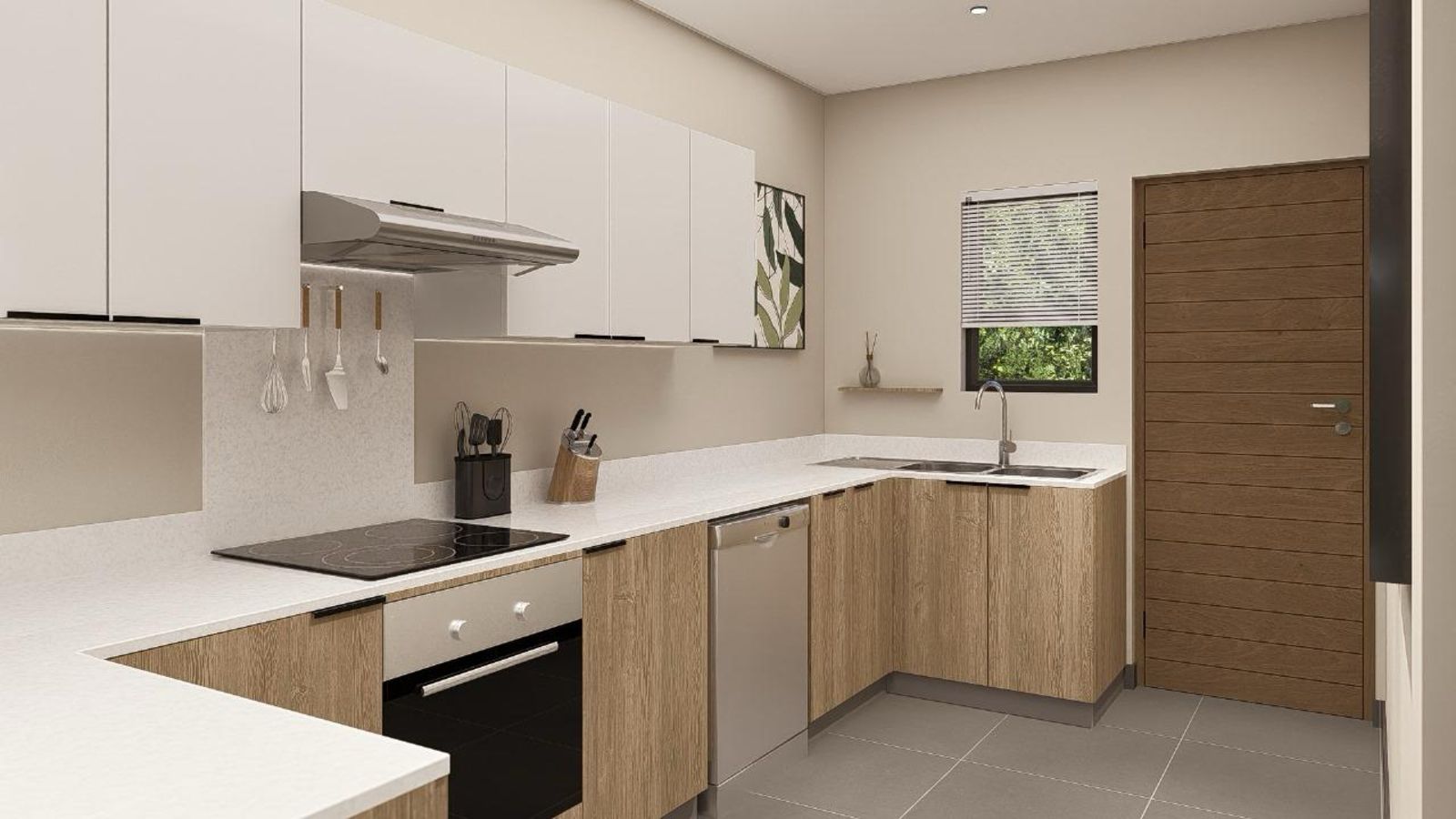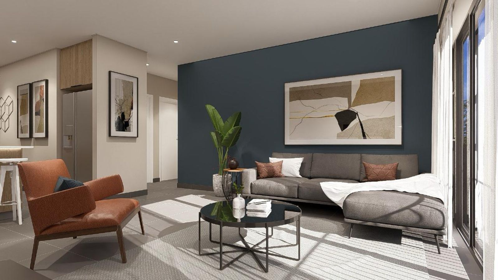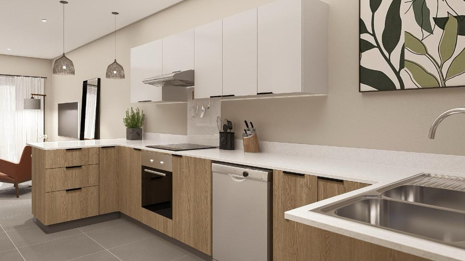 Each apartment is thoughtfully designed with elegance and functionality in mind. The open-plan kitchen is beautifully appointed with sleek cabinetry, gas hob, electric oven, and designated space for two under-counter appliances, flowing seamlessly into a living area.