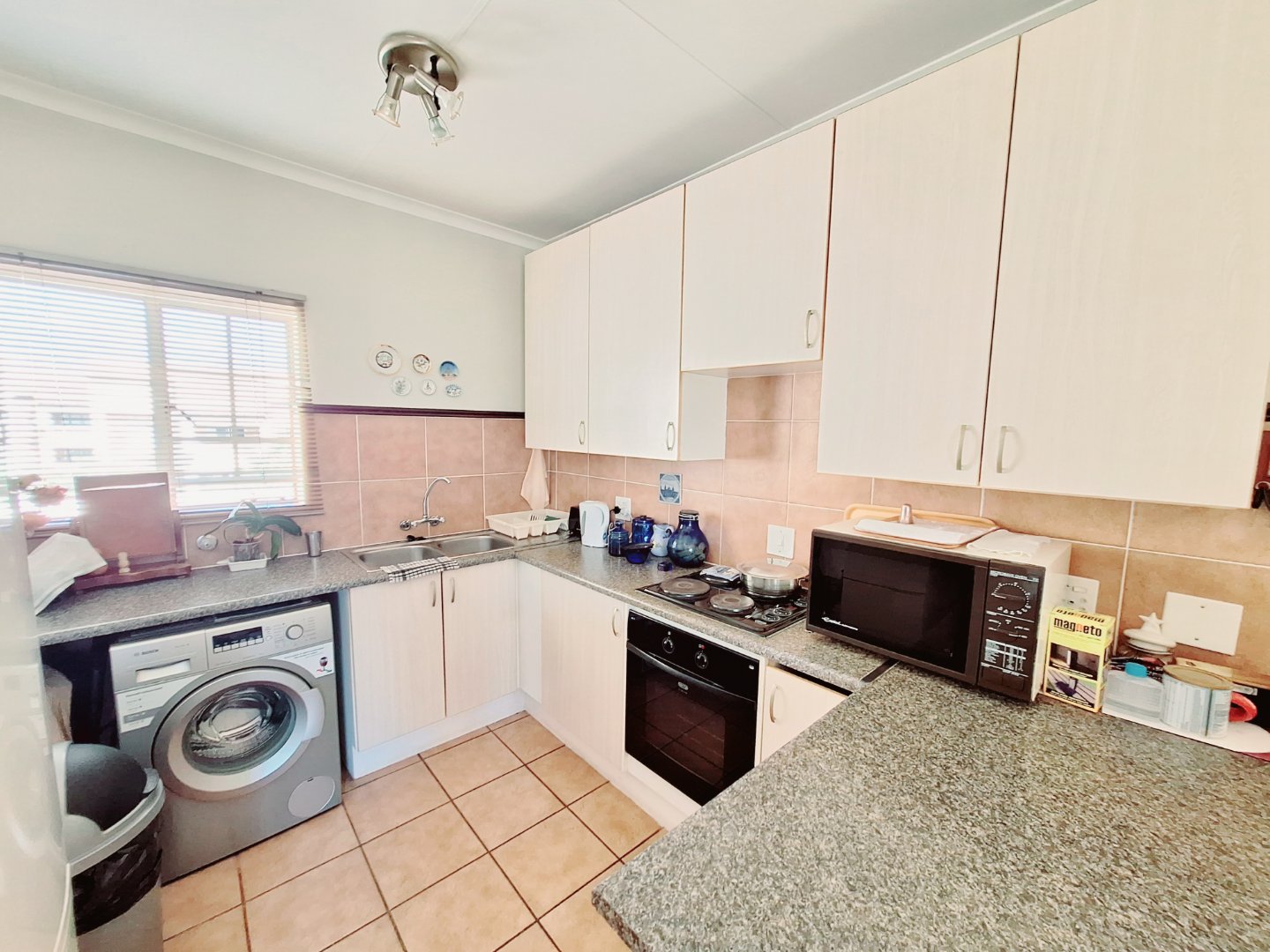 On the first floor with a balcony. An open plan kitchen and Living area. The bathroom offers a bath and shower. Two spacious bedrooms and a lock up garage. The complex has a braai area, swimmingpool and childrens play area.