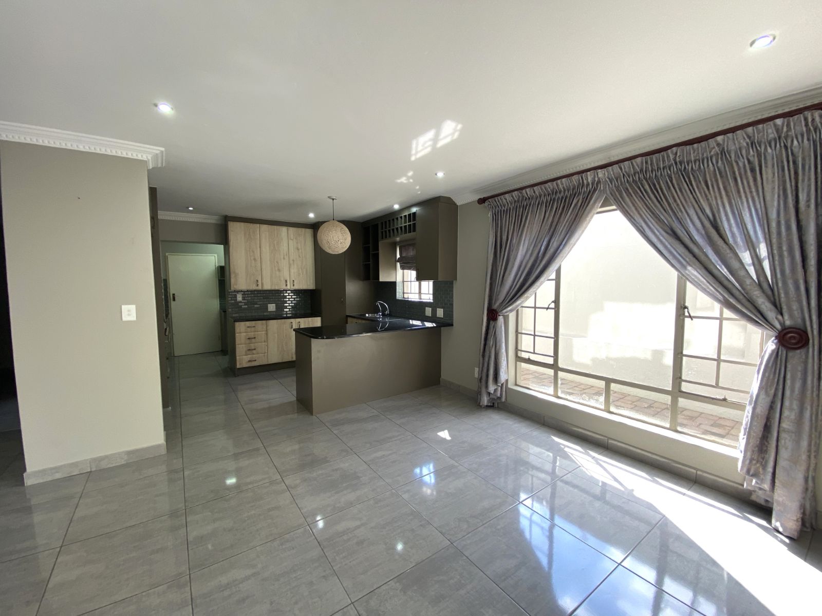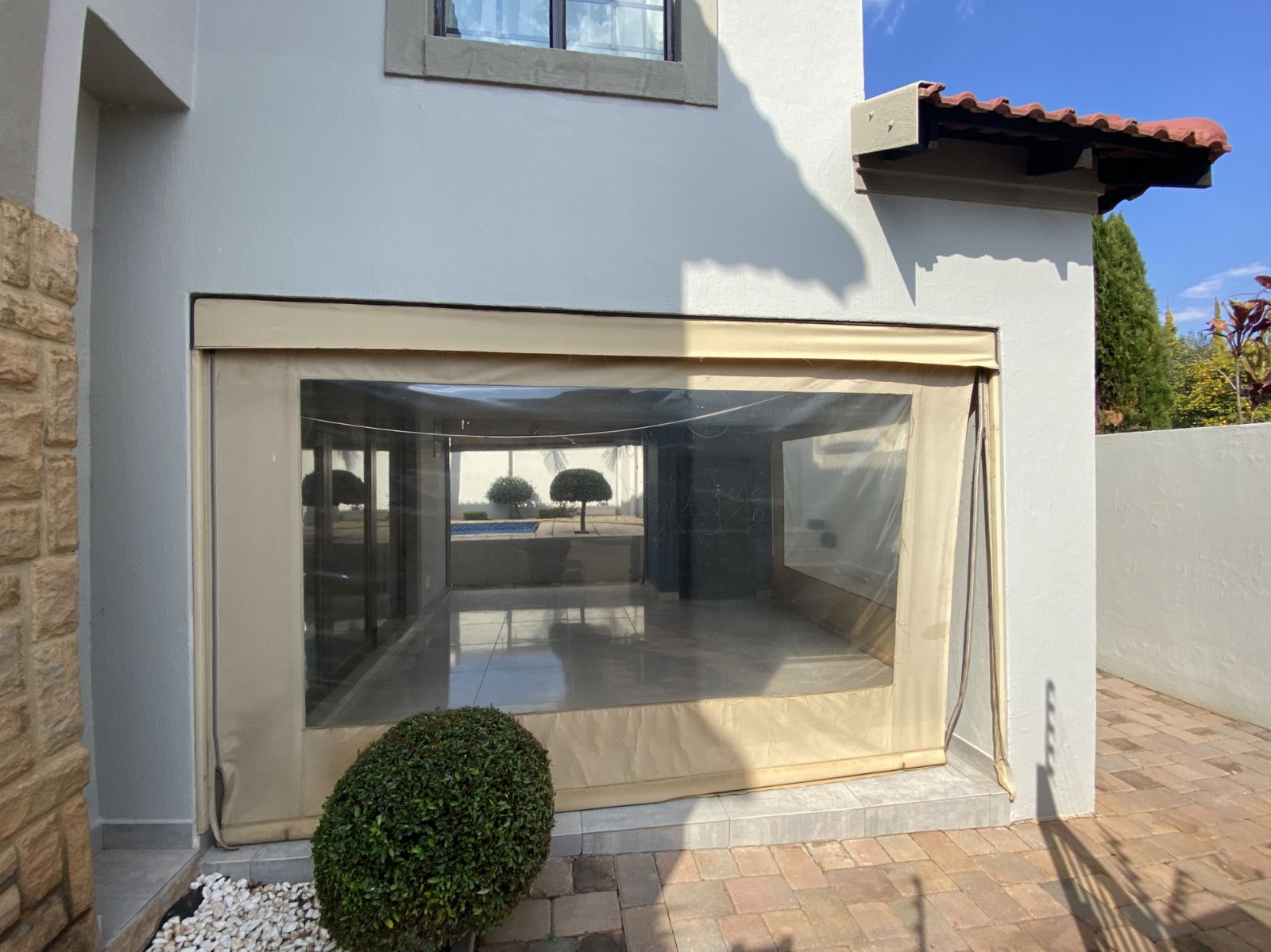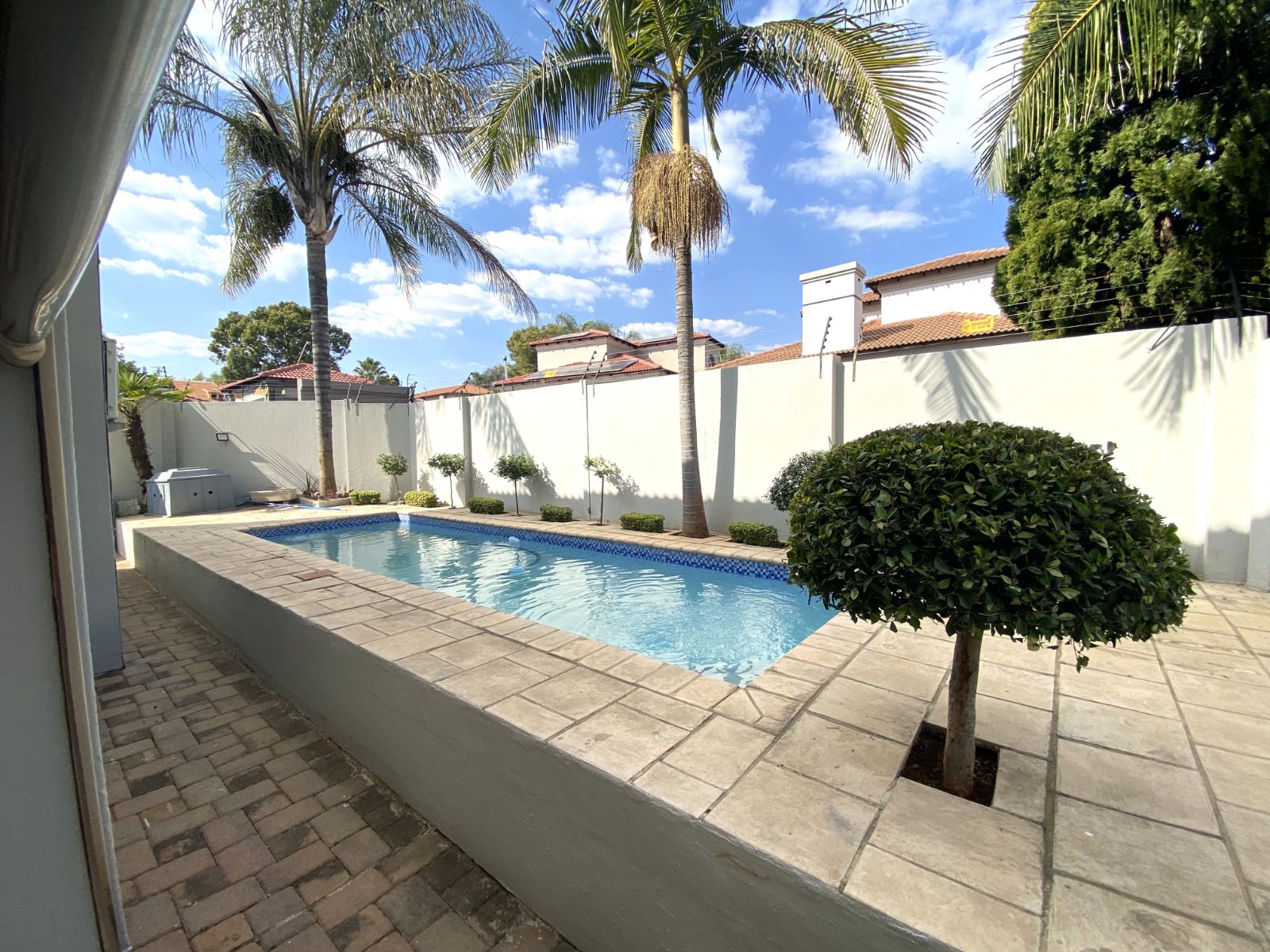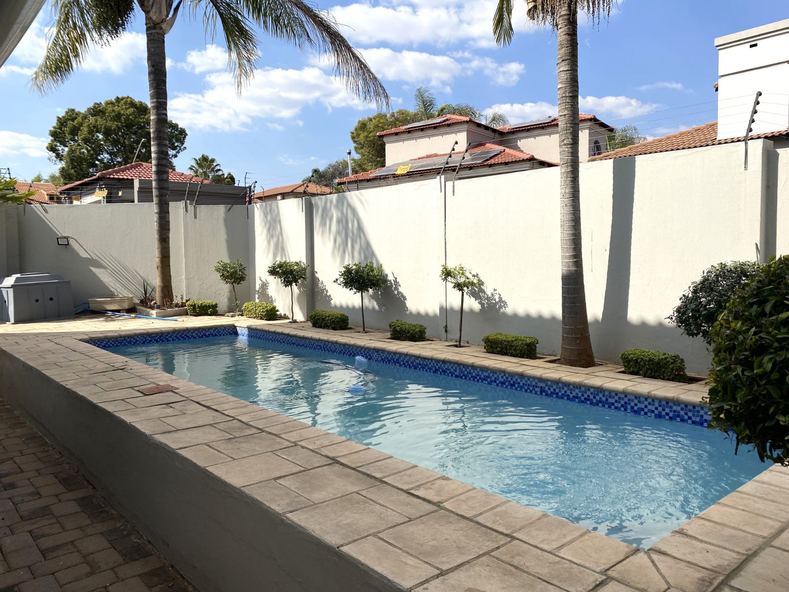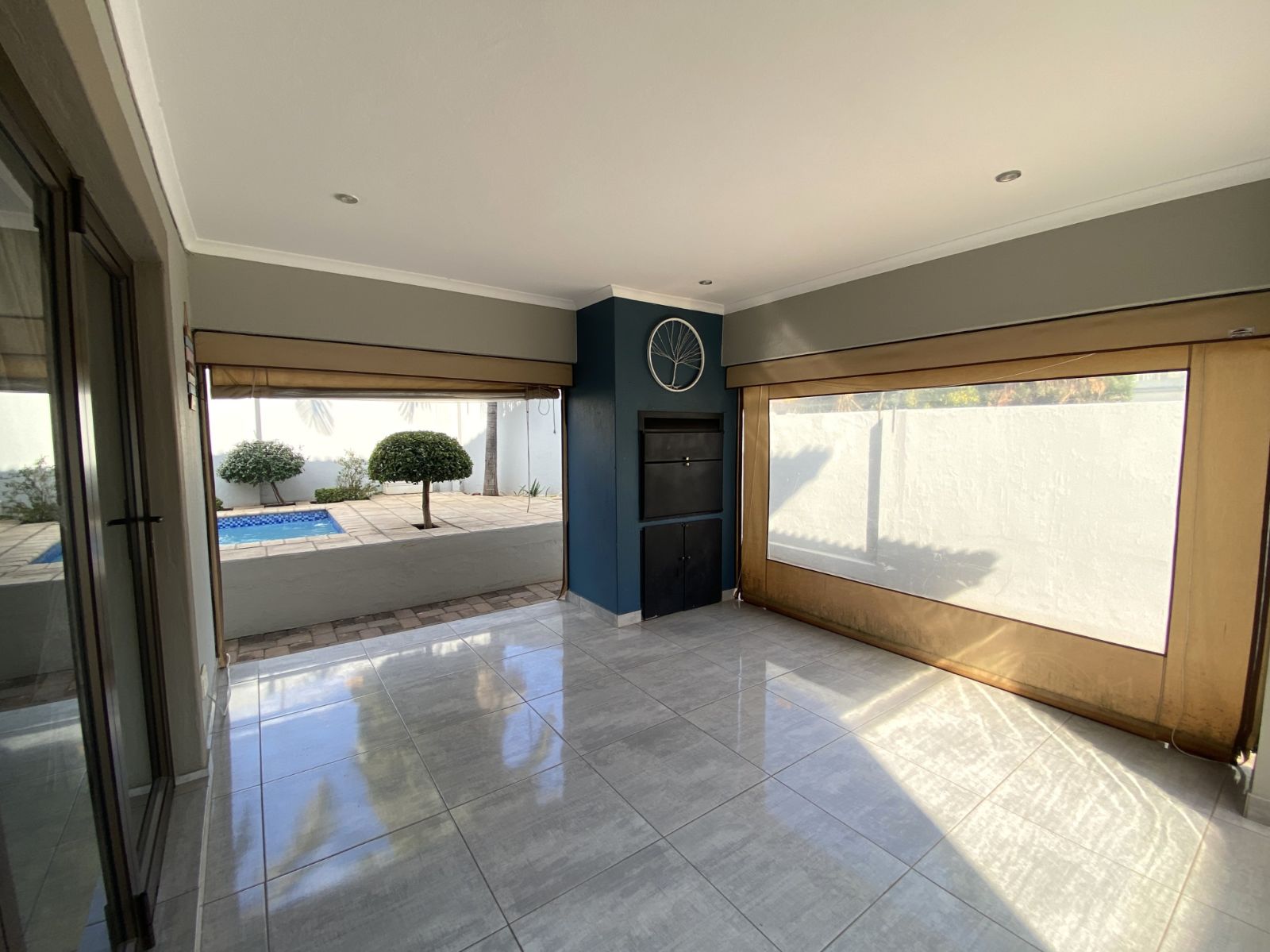 The living area opens up to an enclosed patio with a built-in braai, flowing seamlessly to a sparkling private pool set in a fully enclosed garden — perfect for entertaining or unwinding in total privacy.