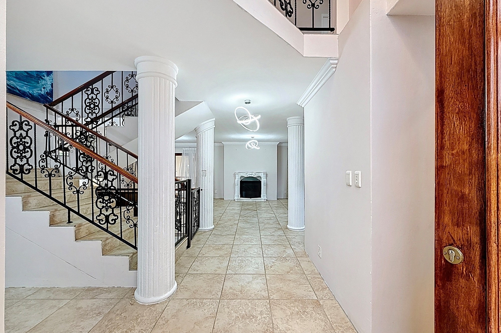 As you step through the grand entrance, you are greeted by an impressive foyer with striking columns and an expansive open-plan layout that effortlessly flows into the heart of the home. The living area, illuminated by large windows, creates an inviting space perfect for both relaxation and entertaining, with a cozy fireplace adding a touch of warmth and charm.