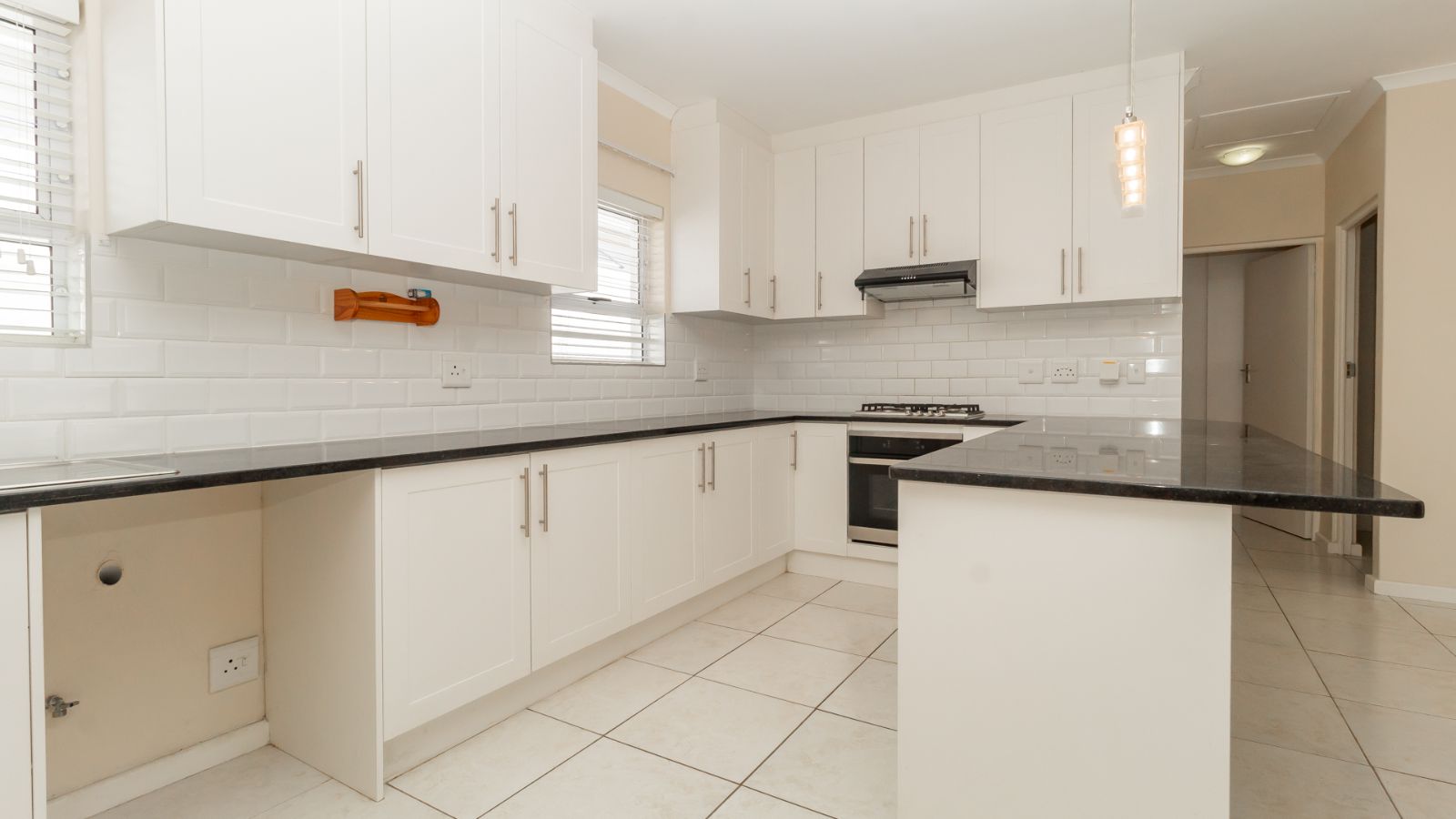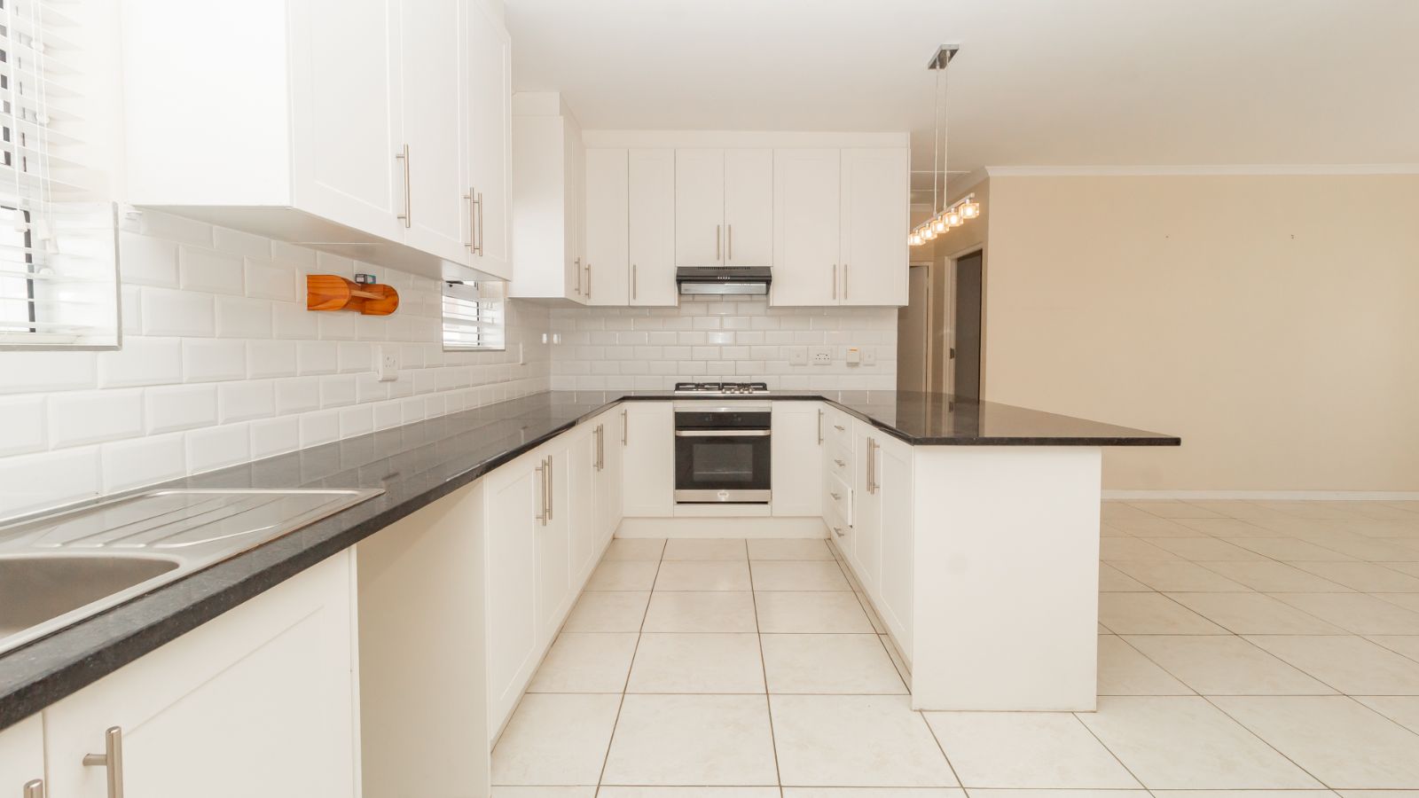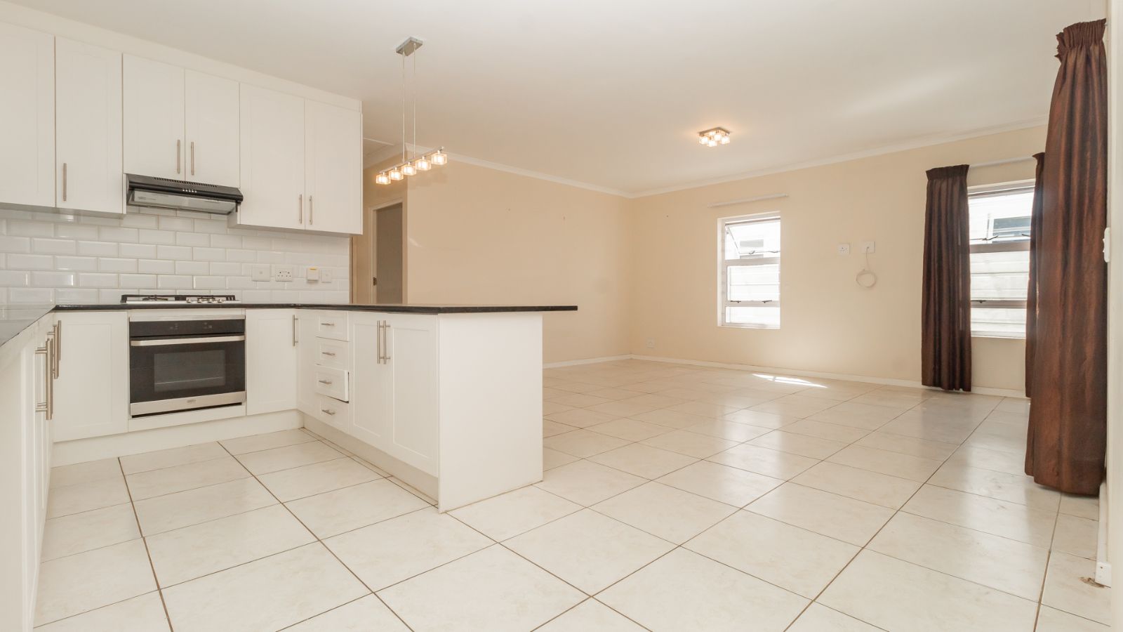 Step inside to a bright and airy open-plan living space, where the chef-inspired kitchen steals the show with sleek countertops, ample cupboard space, a gas hob, electric oven, and extractor fan. The subway-tiled backsplash adds a modern touch, making this the heart of the home.