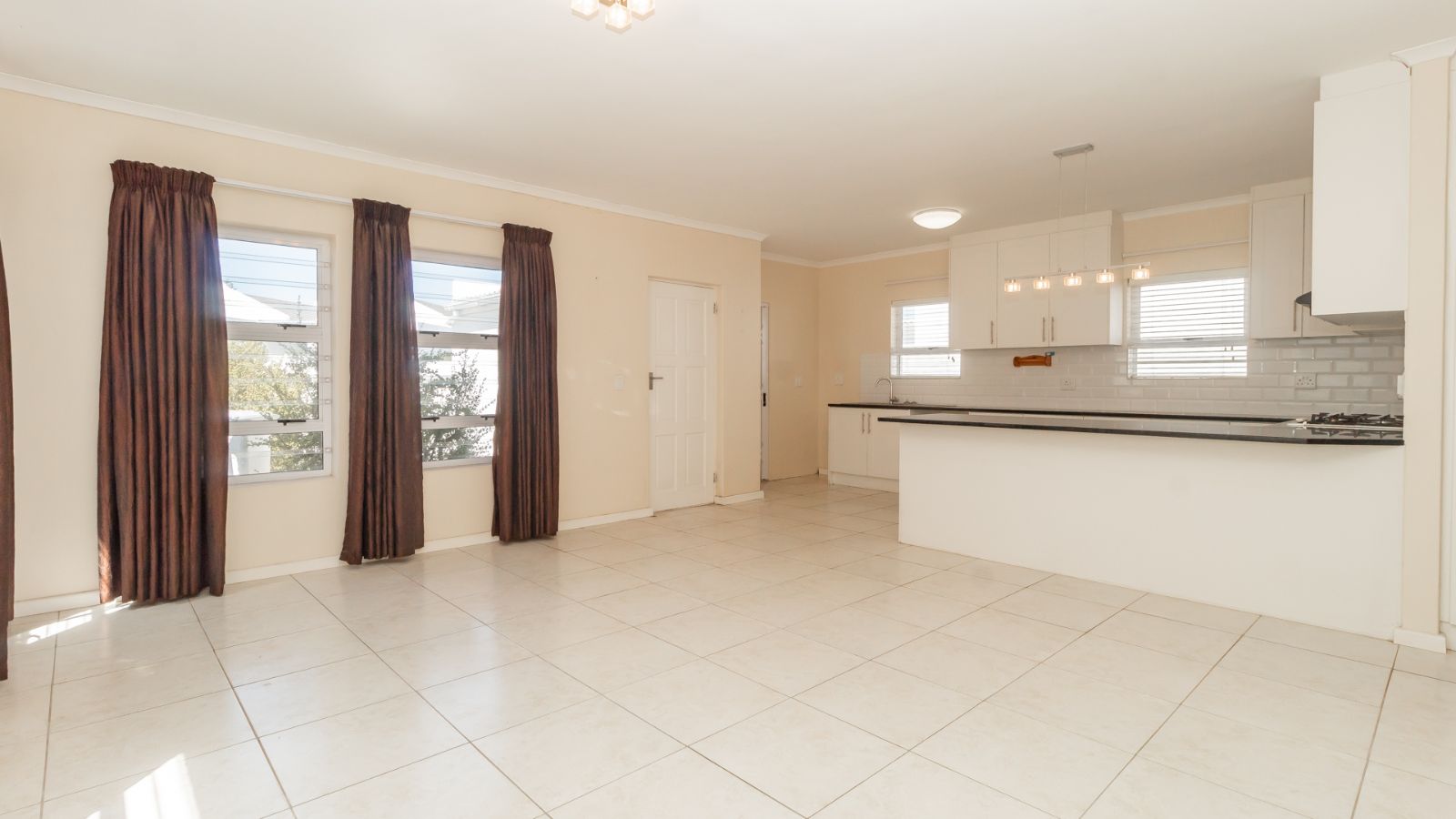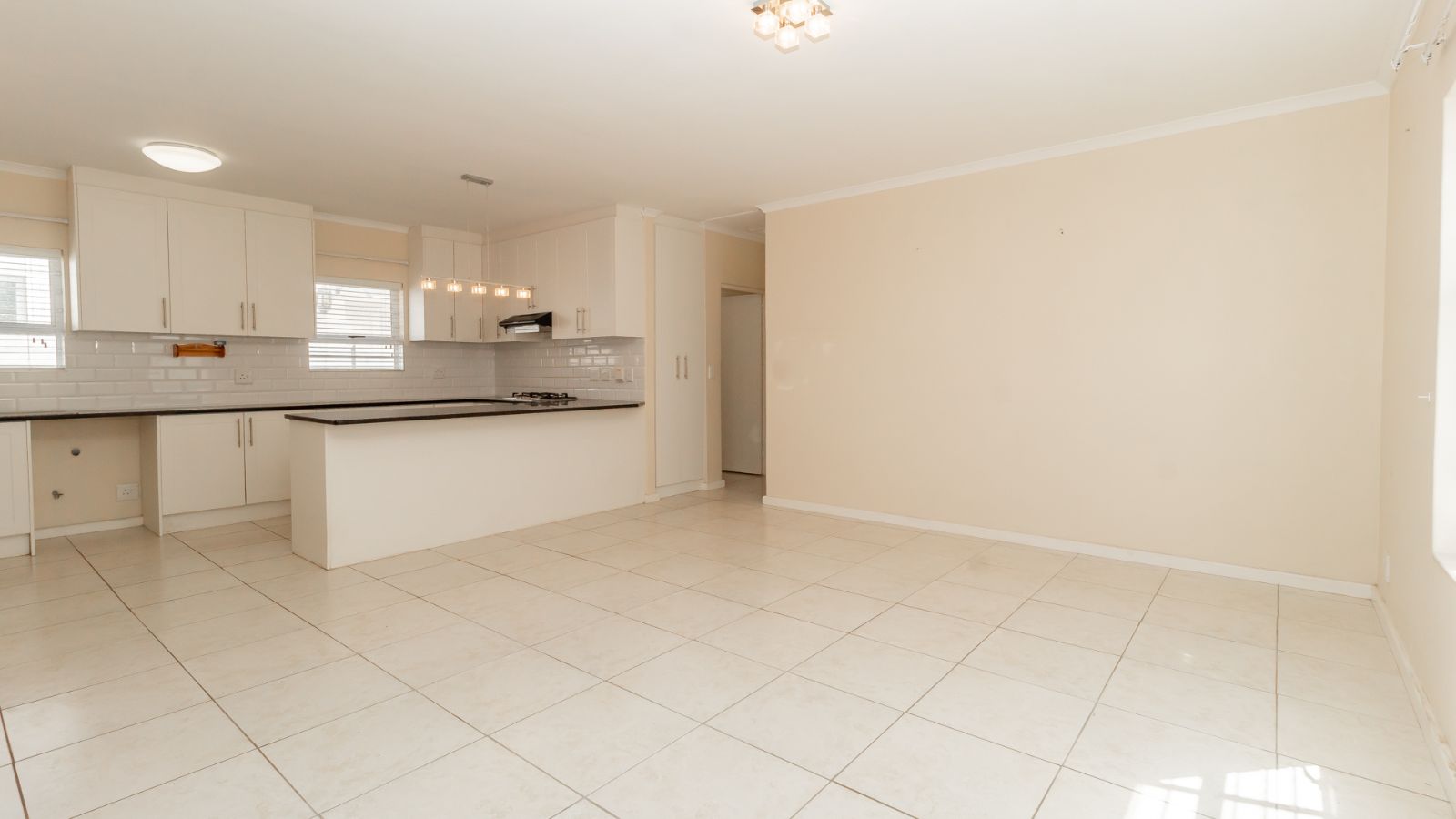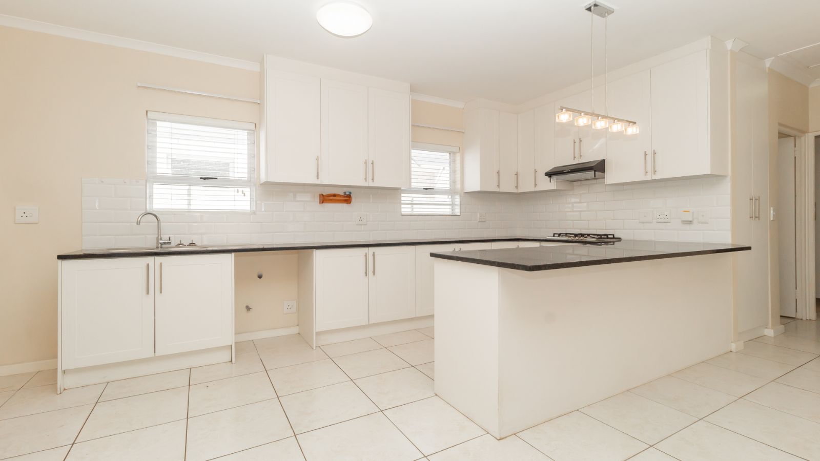 Step inside to a bright and airy open-plan living space, where the chef-inspired kitchen steals the show with sleek countertops, ample cupboard space, a gas hob, electric oven, and extractor fan. The subway-tiled backsplash adds a modern touch, making this the heart of the home.