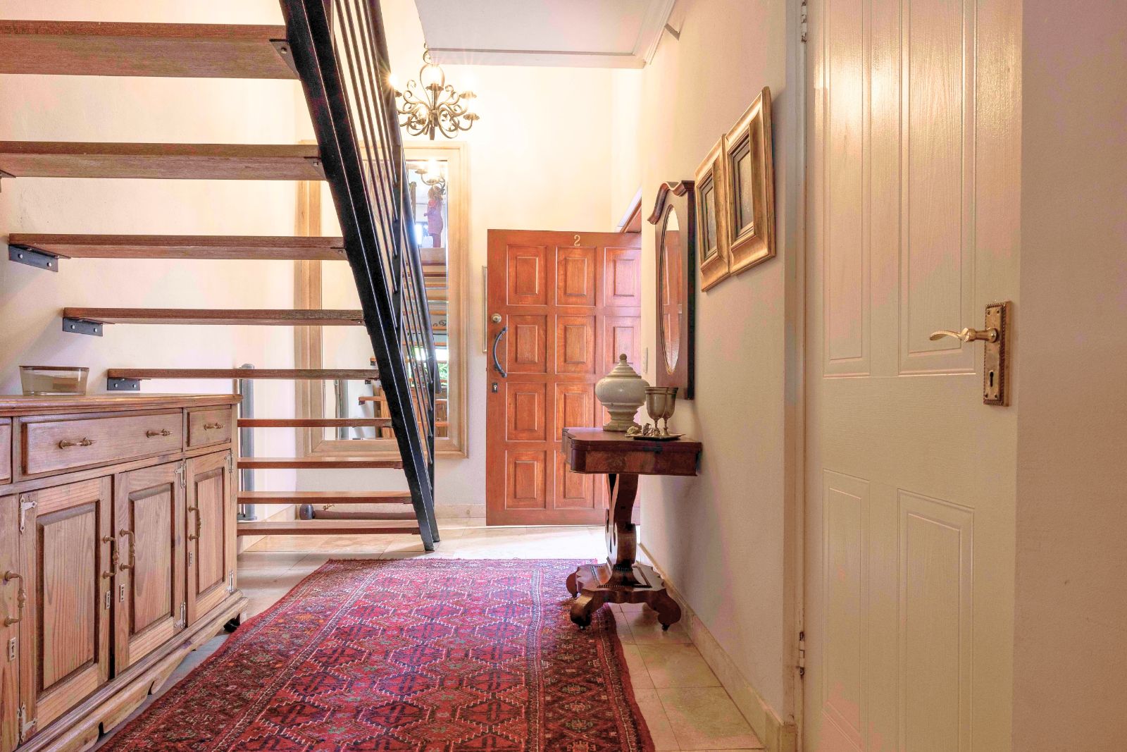 Double sliding doors opening up onto large covered patio and meticulously designed garden with a rich variety of trees and shrubs creating a lush and tranquil setting filled with color and fragrant flowers.