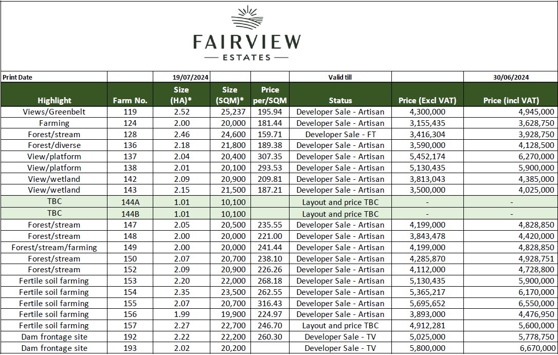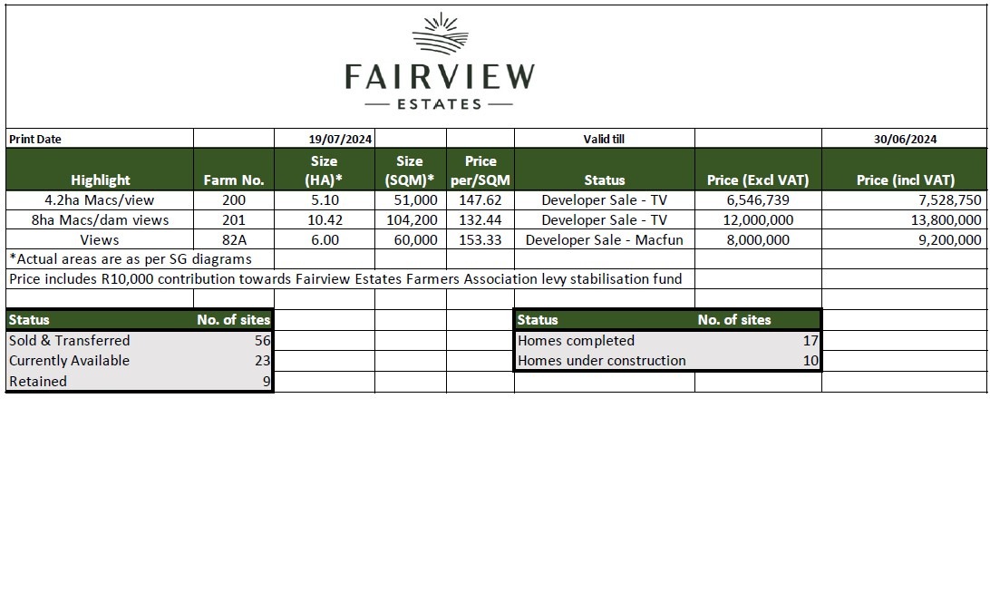 spectacular sunrises and sunsets from its elevated vantage point. The price includes a pre-prepared platform ready for your dream homestead. This site offers expansive views to the south over Ballito, while to the north, you’re treated to the sight of rolling farmlands and macadamia orchards. Nestled on the hill, this site boasts 360-degree views, truly offering it all for those looking to enjoy the natural beauty and tranquillity of Fairview Estates. Discover security, farming potential, and uninterrupted panoramic views away from urban disturbances.