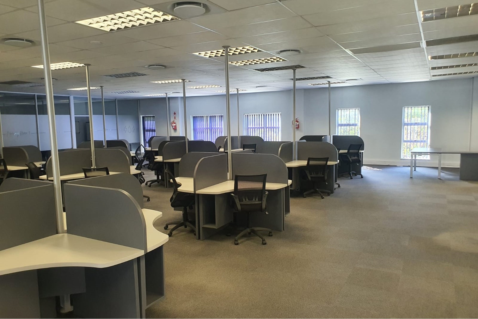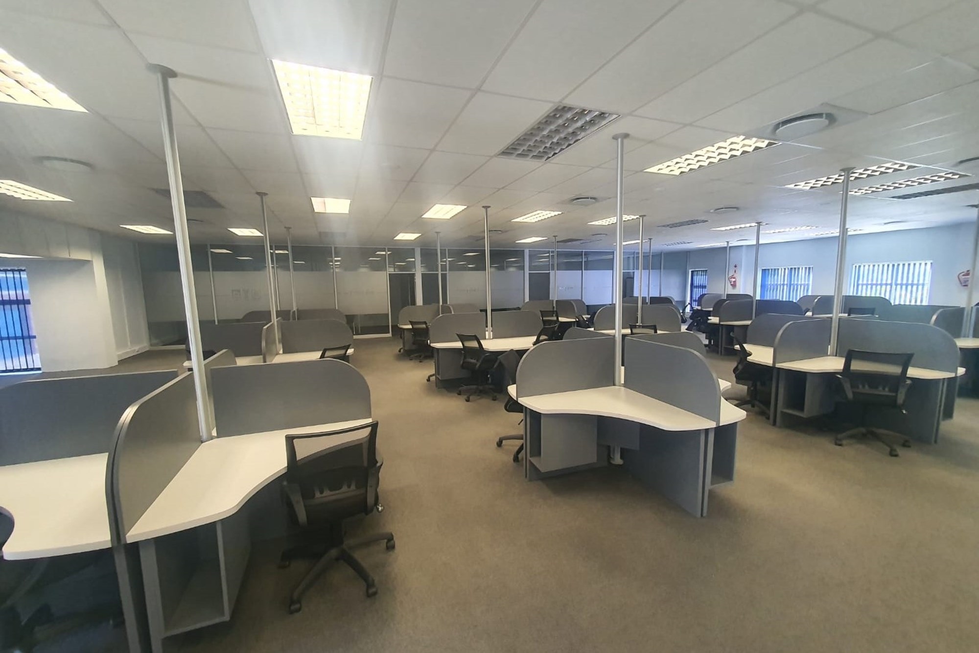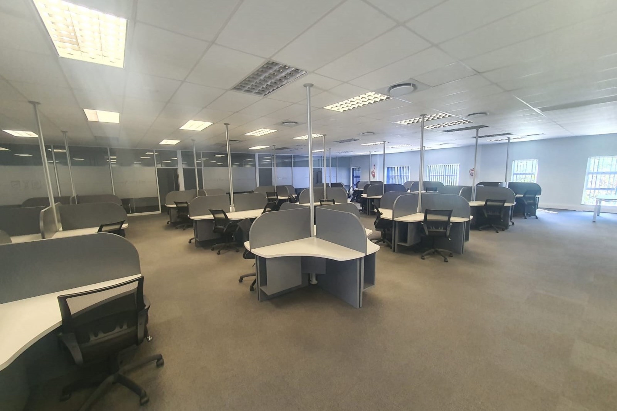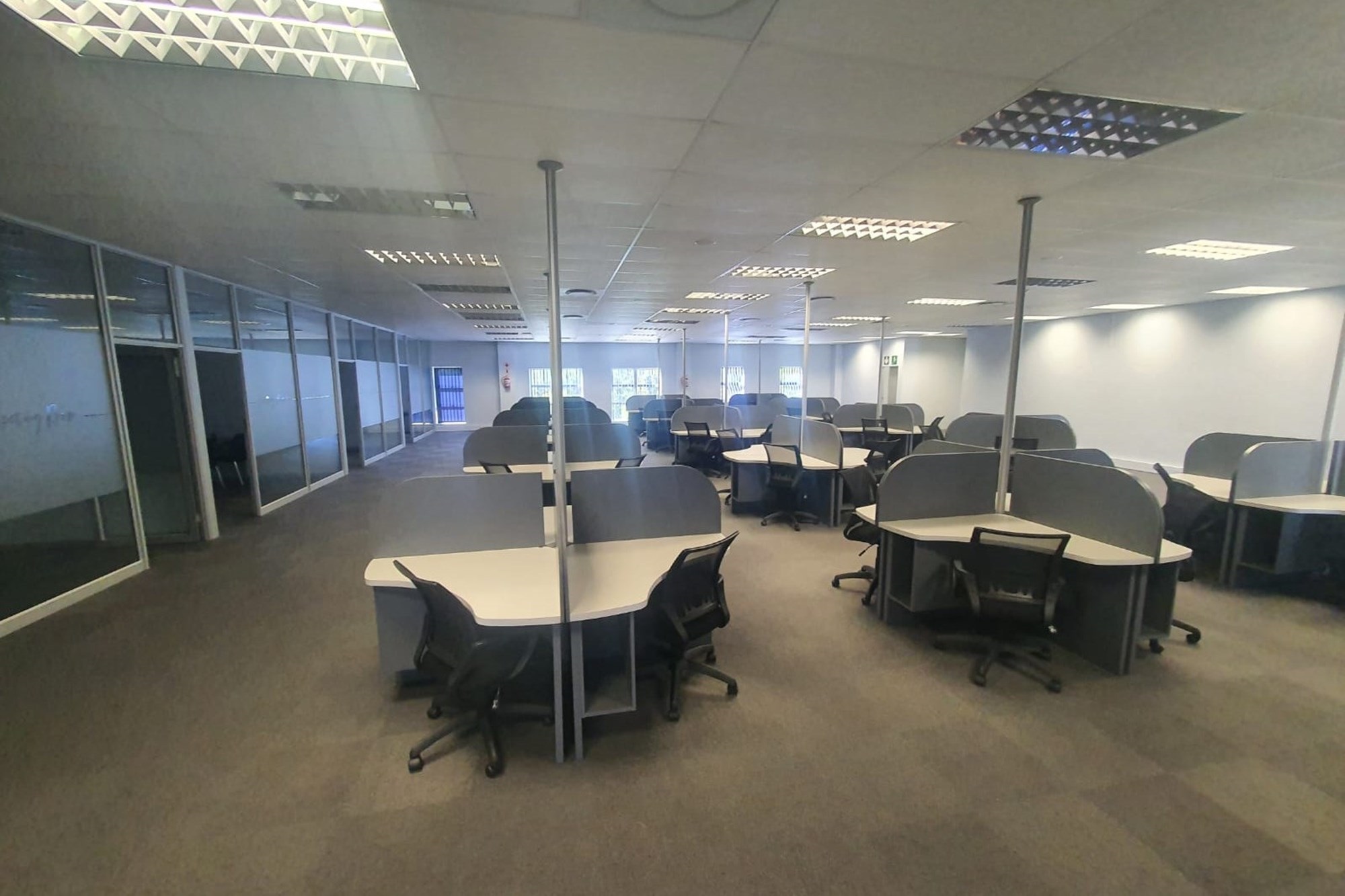 The layout comprises five individual air-conditioned offices, one extra-large air-conditioned open plan area, and two additional large air-conditioned open plan areas. The space also offers two sets of separate male and female ablutions and a kitchen.