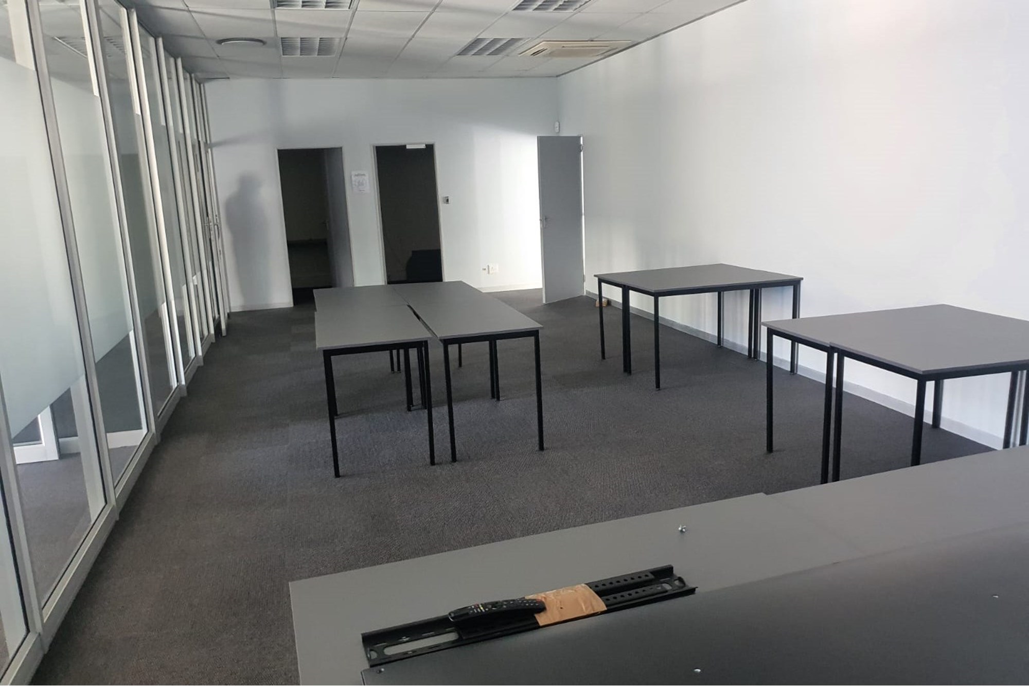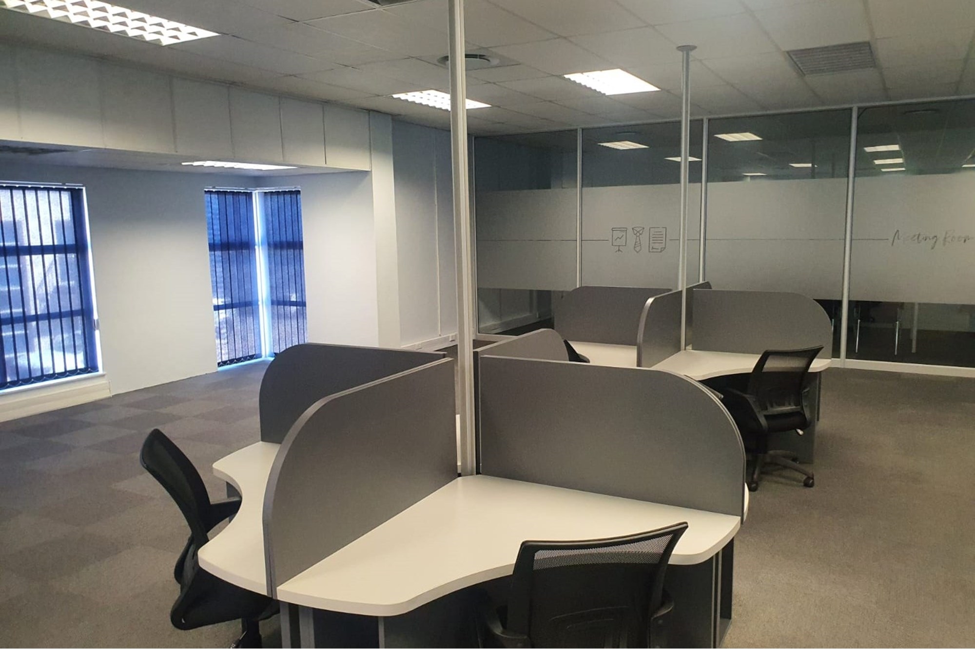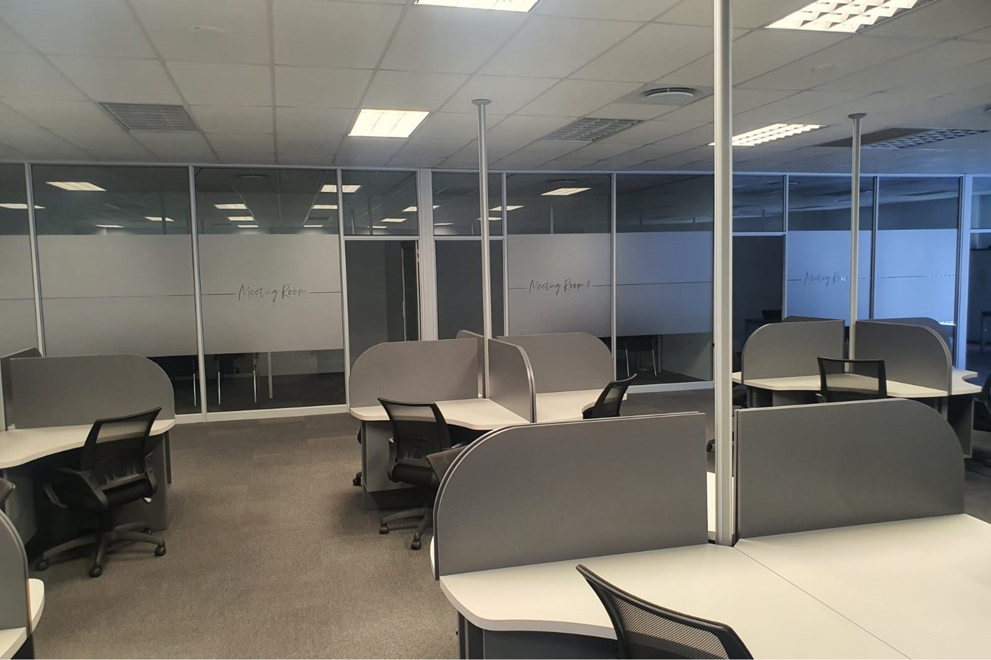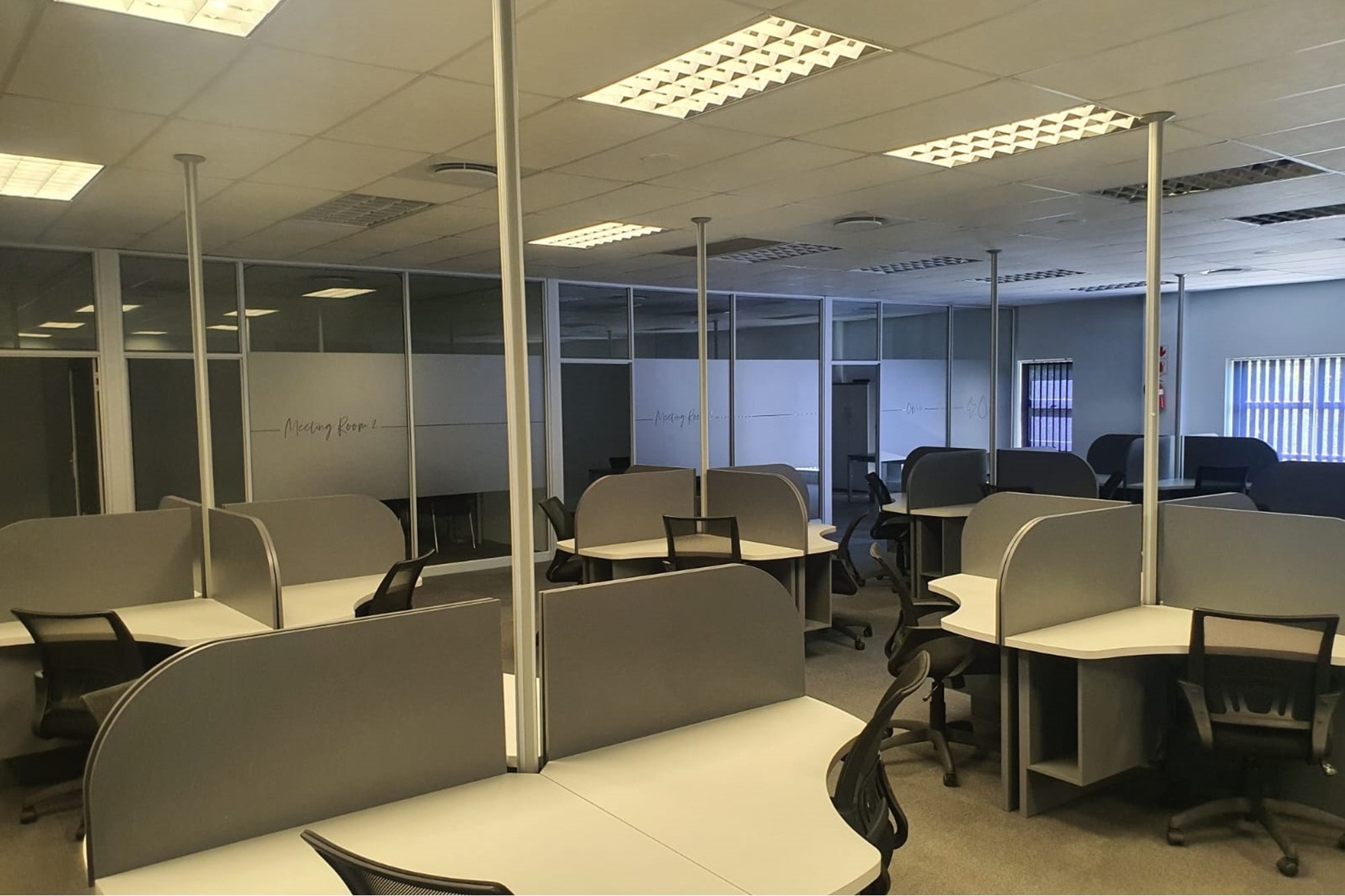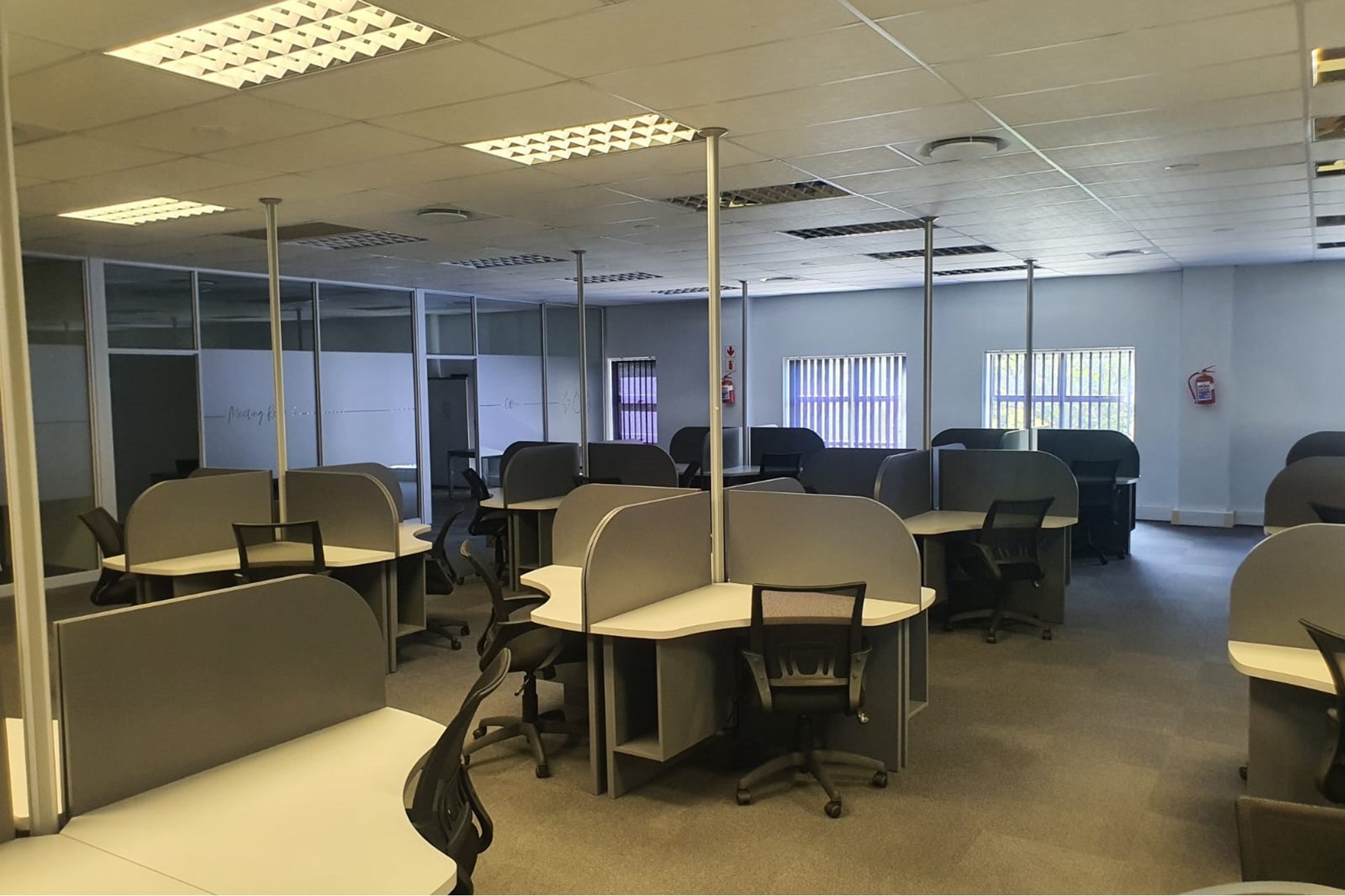 The layout comprises five individual air-conditioned offices, one extra-large air-conditioned open plan area, and two additional large air-conditioned open plan areas. The space also offers two sets of separate male and female ablutions and a kitchen.