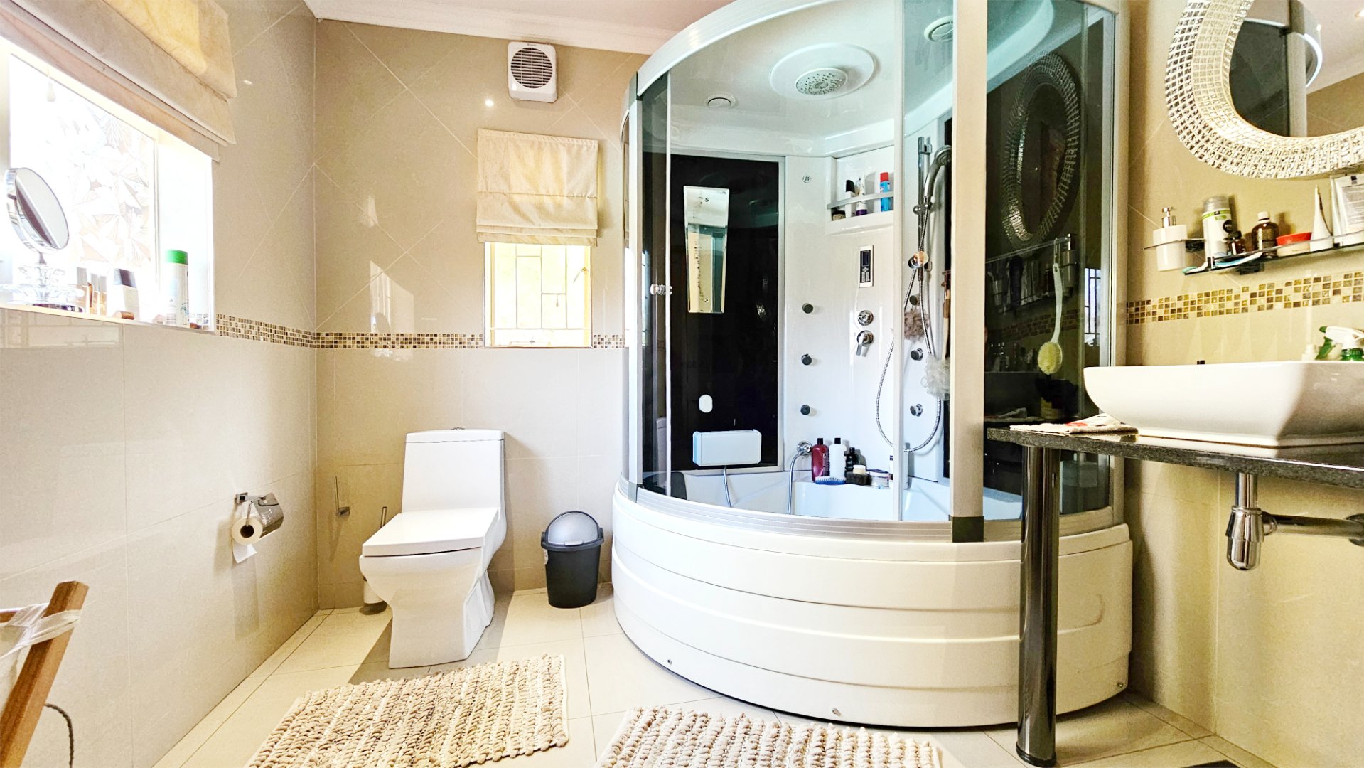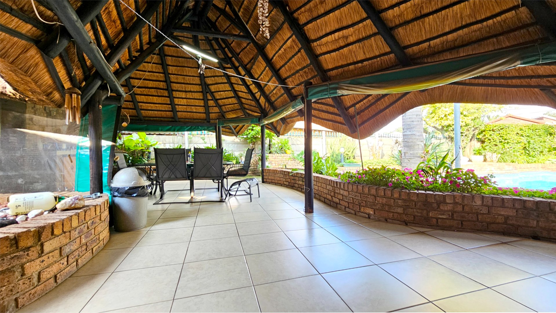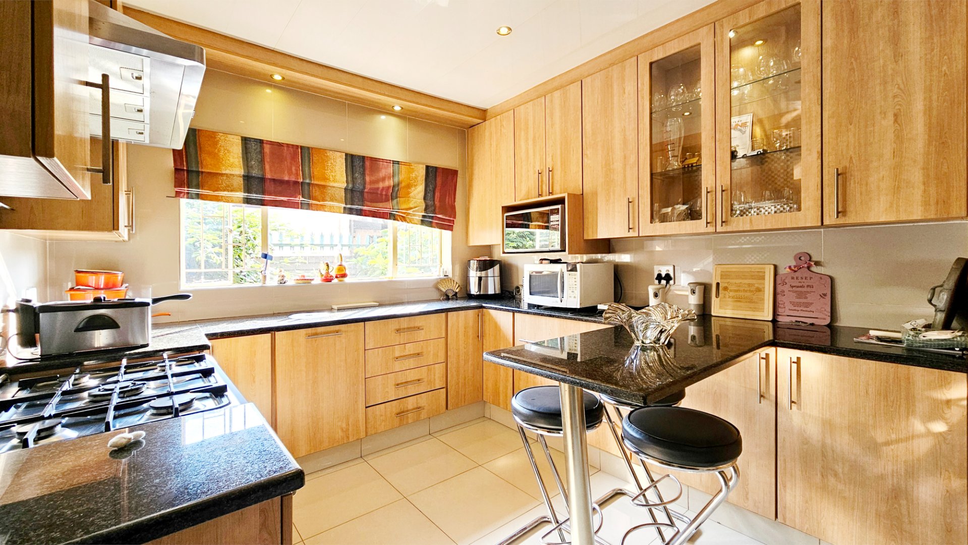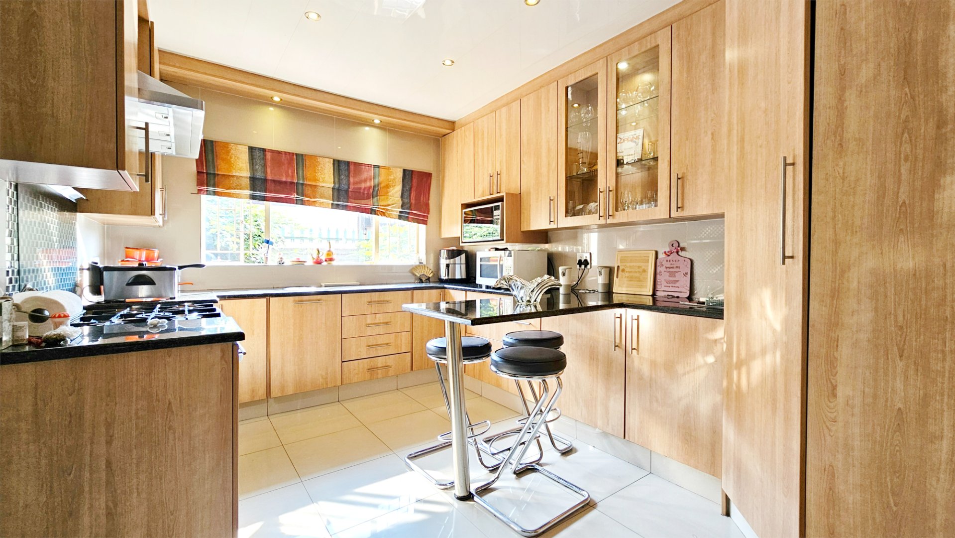 The property offers a solar powered automated gate, double automated garage, CCTV cameras and gas geysers.