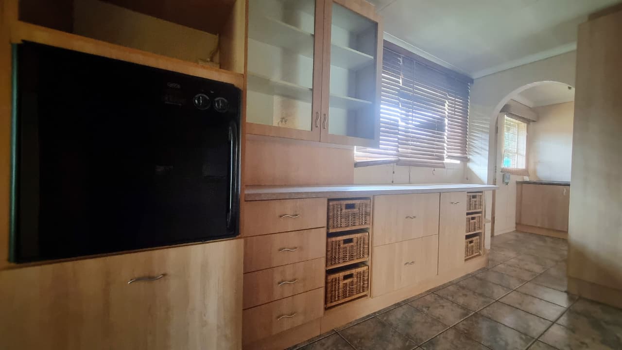 The kitchen has wooden, built-in cupboards, countertop stove with extractor fan and an eye-level oven. A large pantry adds ample storage space. There's a separate scullery/laundry room with built-in cupboard and dishwasher/washing machine connections.