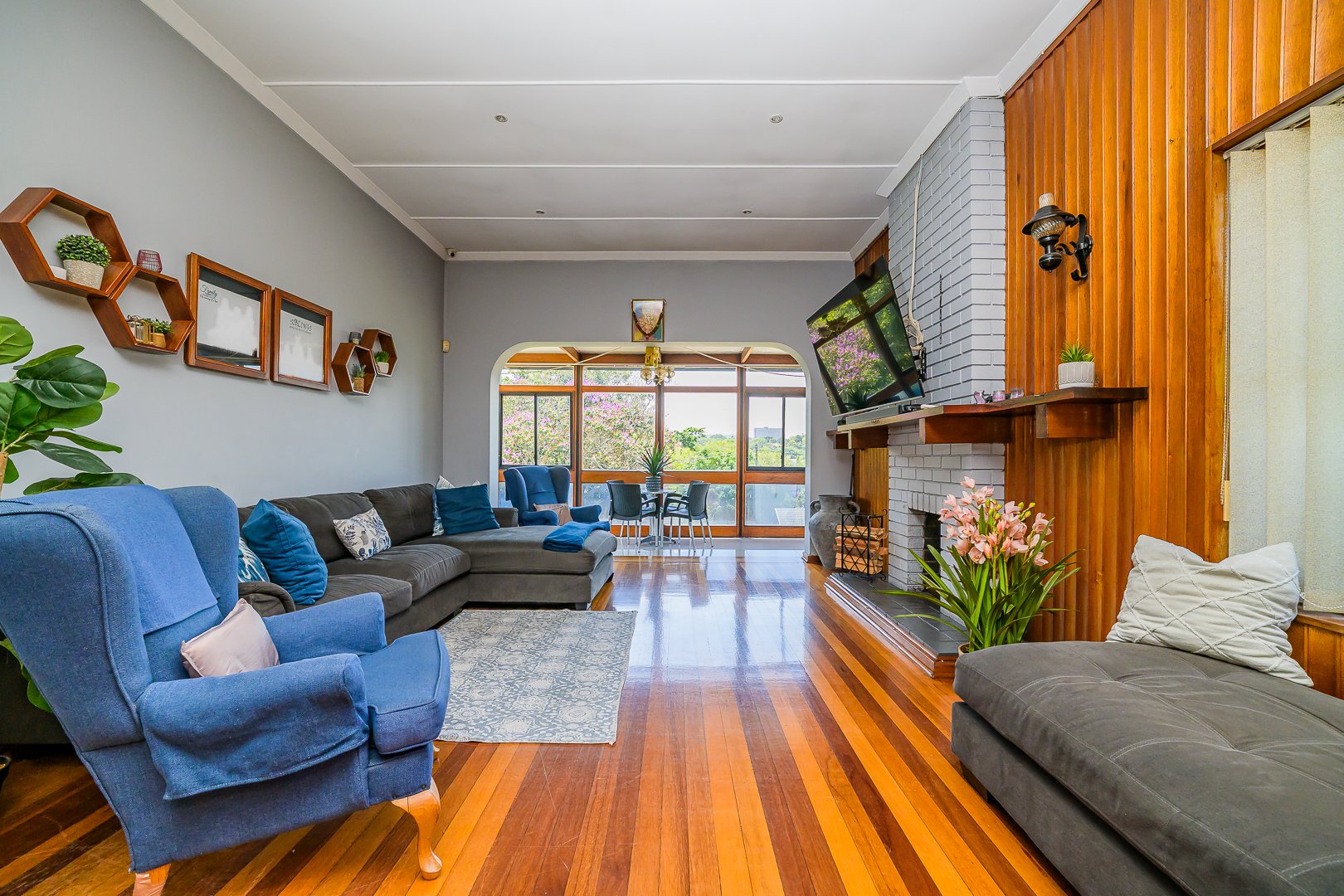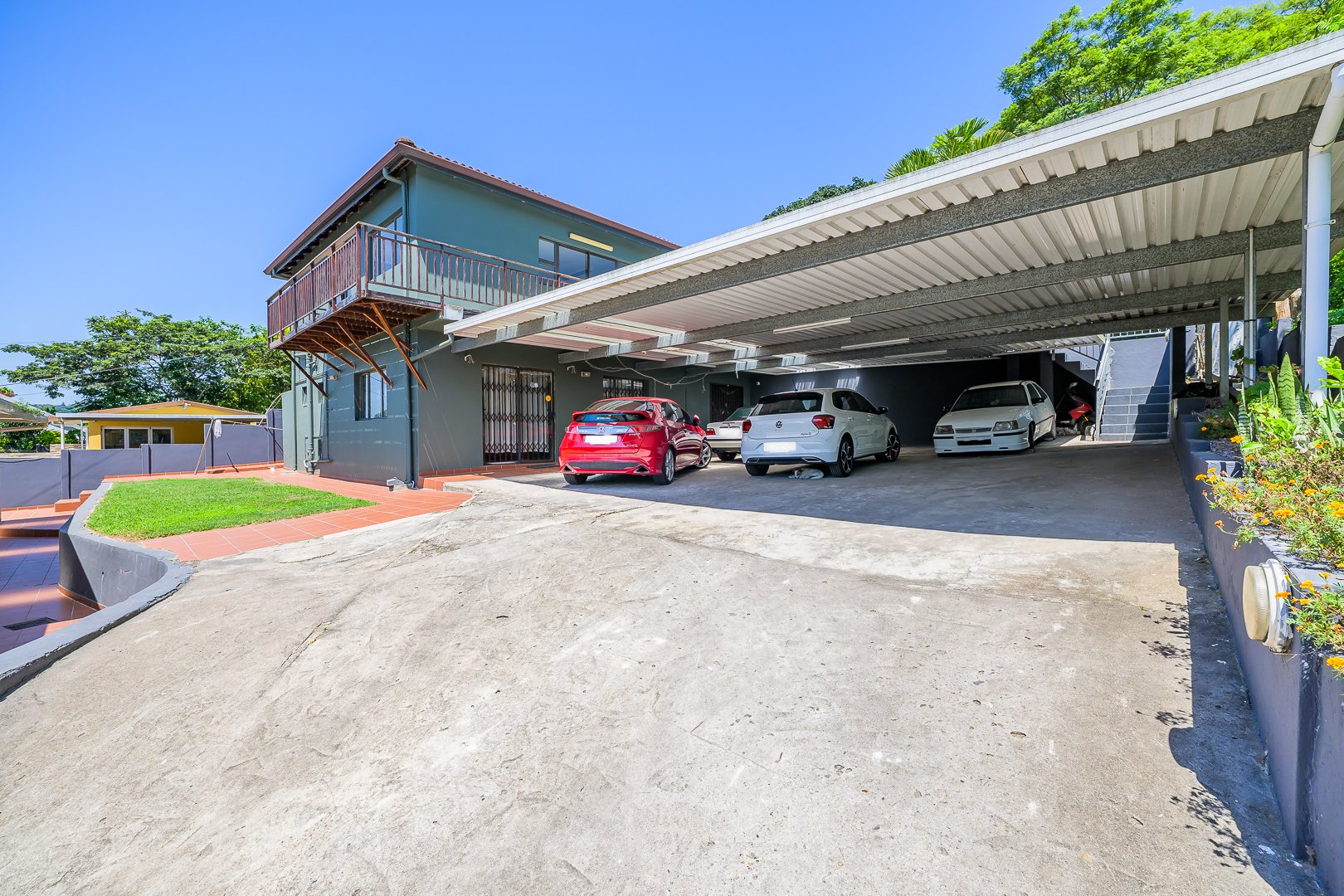 Parking is a breeze with a double garage, while two JoJo tanks ensure peace of mind and water efficiency. The property unfolds into a second section, featuring a well-appointed two-bedroom flat. The main bedroom is impressively spacious and includes its own en-suite bathroom, making it ideal for extended family, rental income, or guest accommodation. Step outside the flat and you’re met with a large carport that comfortably accommodates up to six vehicles — a rare and valuable feature.