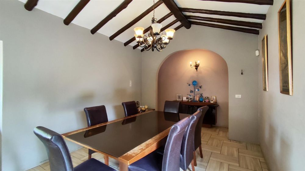 The open-plan dining area flows seamlessly from the kitchen, creating the perfect space for family meals. A short passage leads to the lounge, which opens onto the front garden and features a wood-burning fireplace (unused). Just off the entrance, a cosy entertainment room with high ceilings, a fitted solid-wood bar, and soft carpeting provides an ideal retreat for hosting guests or relaxing evenings.
