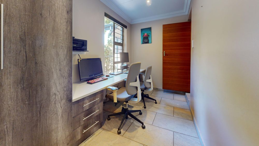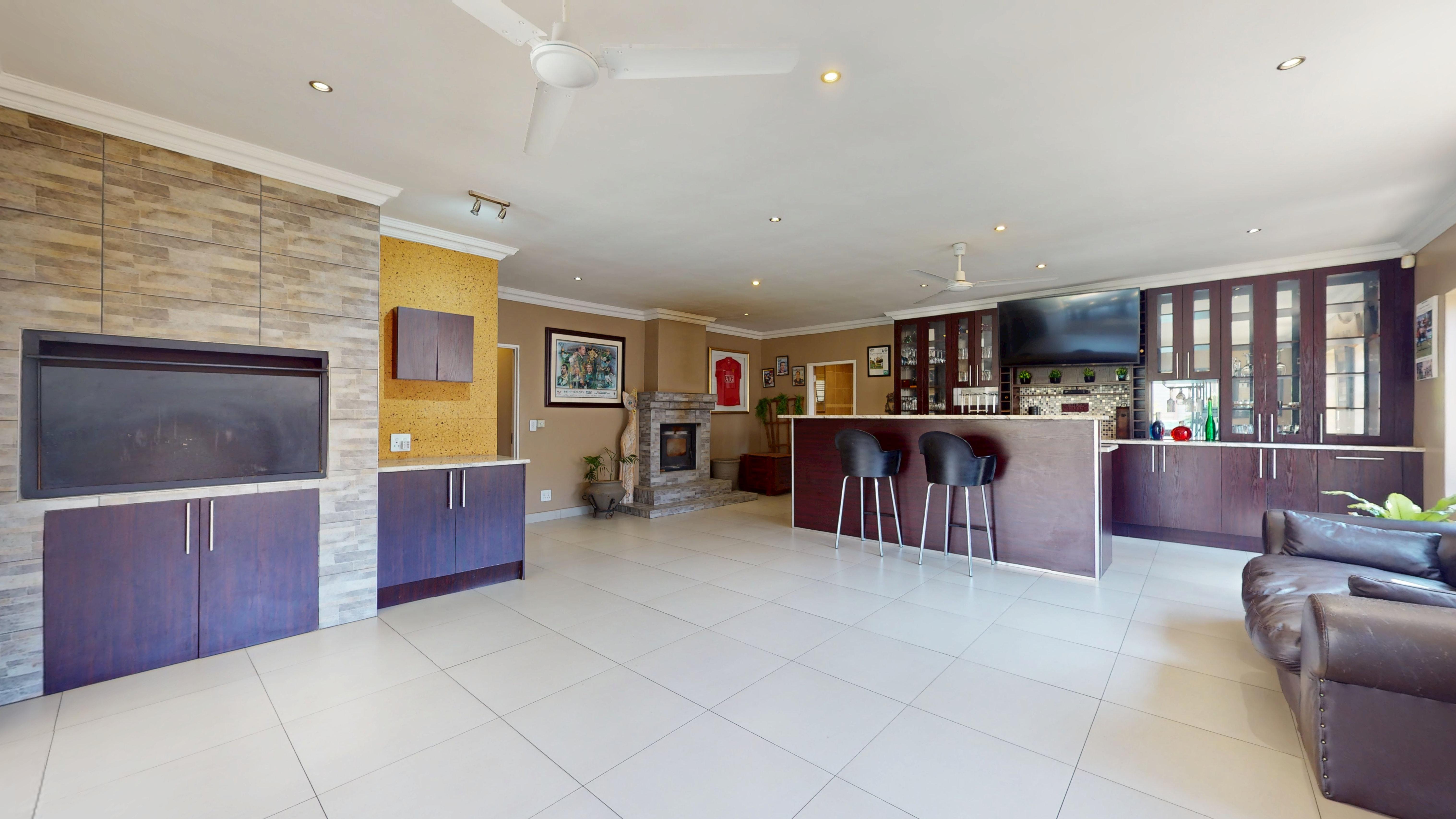 The home is beautifully maintained and offers a variety of living and entertainment spaces. A large lounge with a wood burning fireplace provides a welcoming family hub, while the separate entertainment area is fitted with a generous bar counter and sleek aluminium stacking doors that open directly to a covered patio and garden. Here, you find a neat outdoor space with a heated swimming pool, perfect for year-round use. The property’s aluminium window frames ensure both low maintenance and modern appeal.