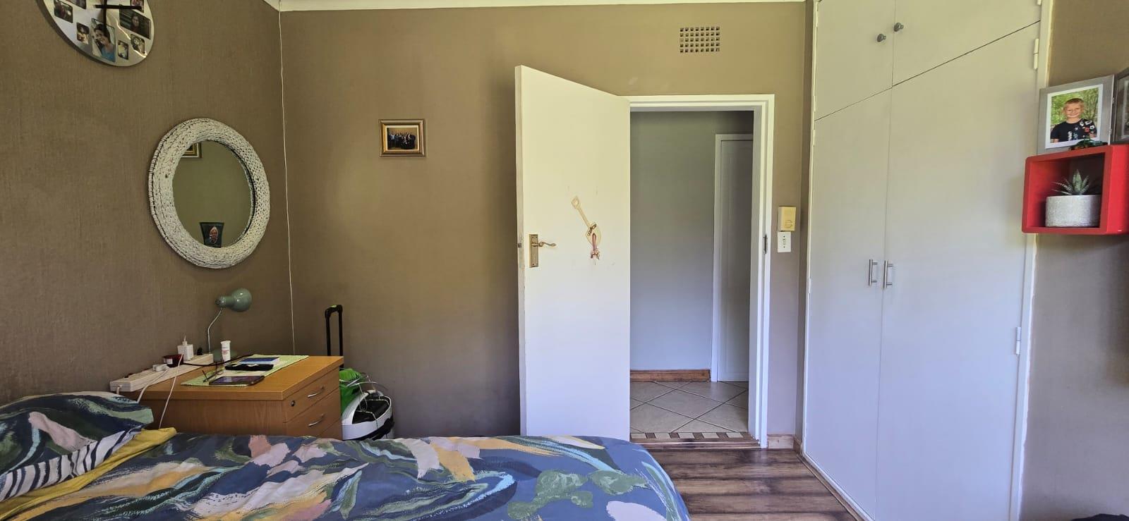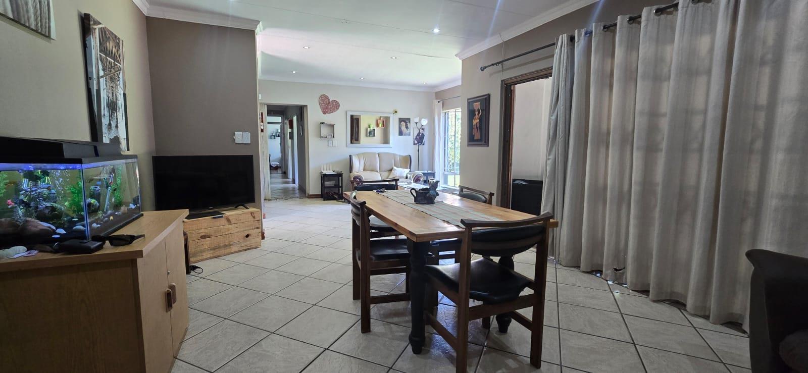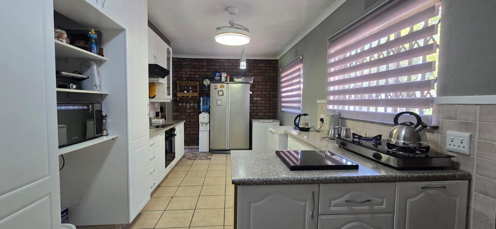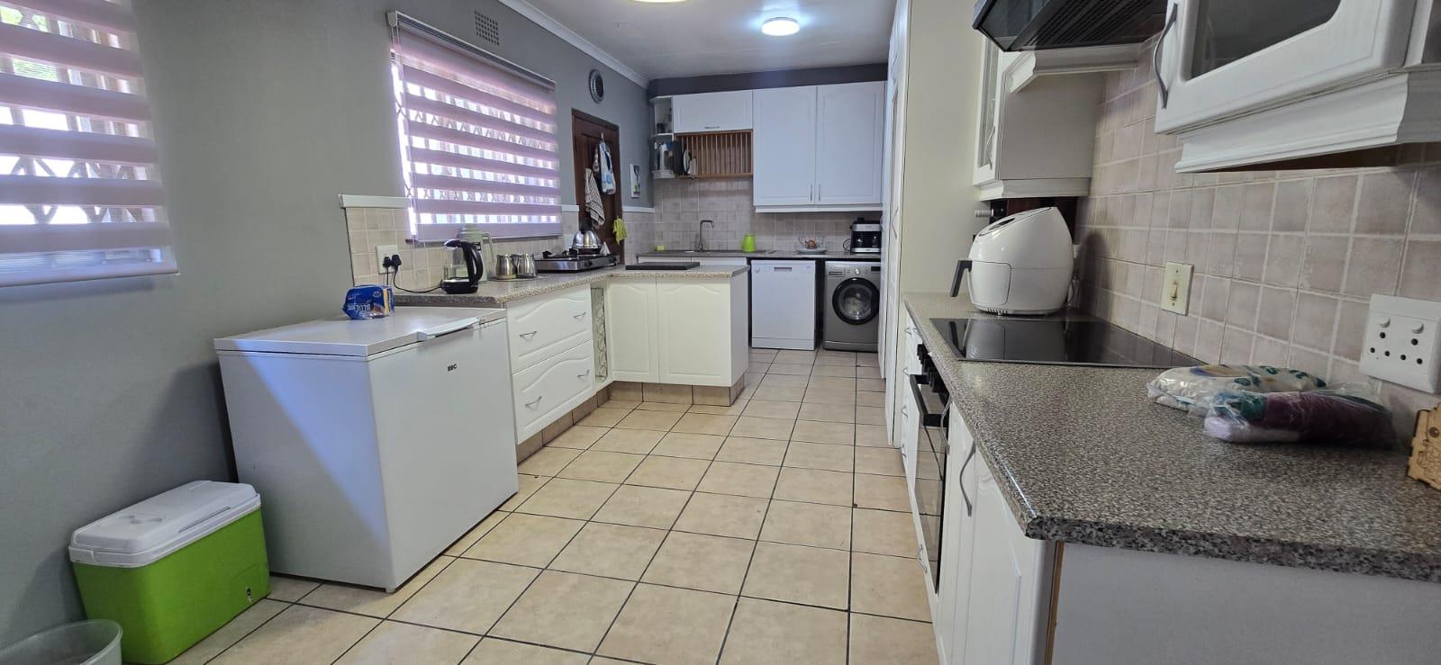 The property features 3 bedrooms with built-in cupboards and 2 bathrooms, making it ideal for family living. The kitchen is well laid out with ample cupboard space, accommodating appliances and fitted with an electric oven and stove.