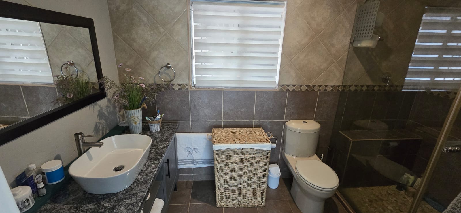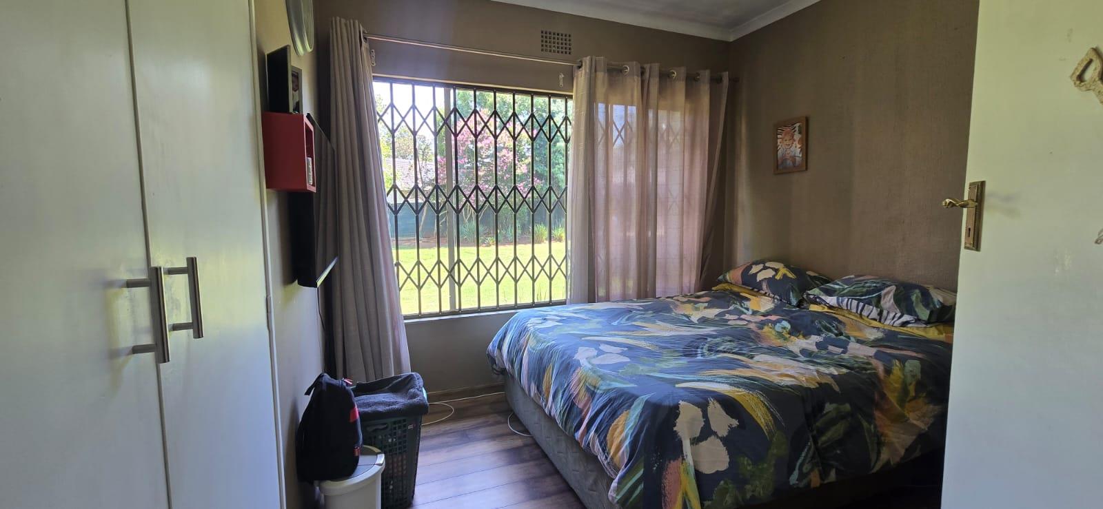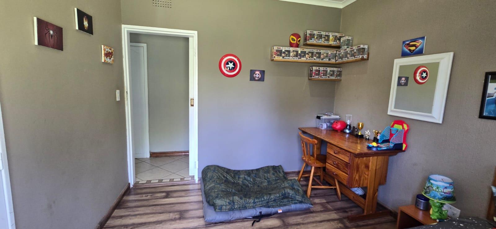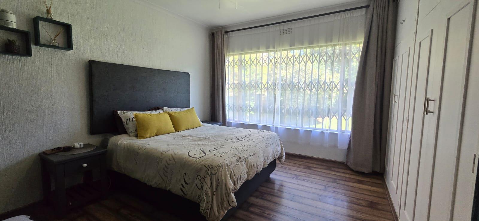 The property features 3 bedrooms with built-in cupboards and 2 bathrooms, making it ideal for family living. The kitchen is well laid out with ample cupboard space, accommodating appliances and fitted with an electric oven and stove.