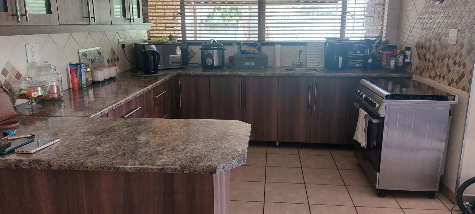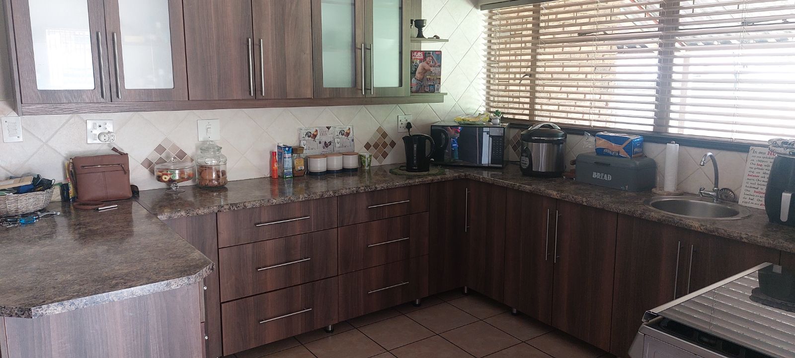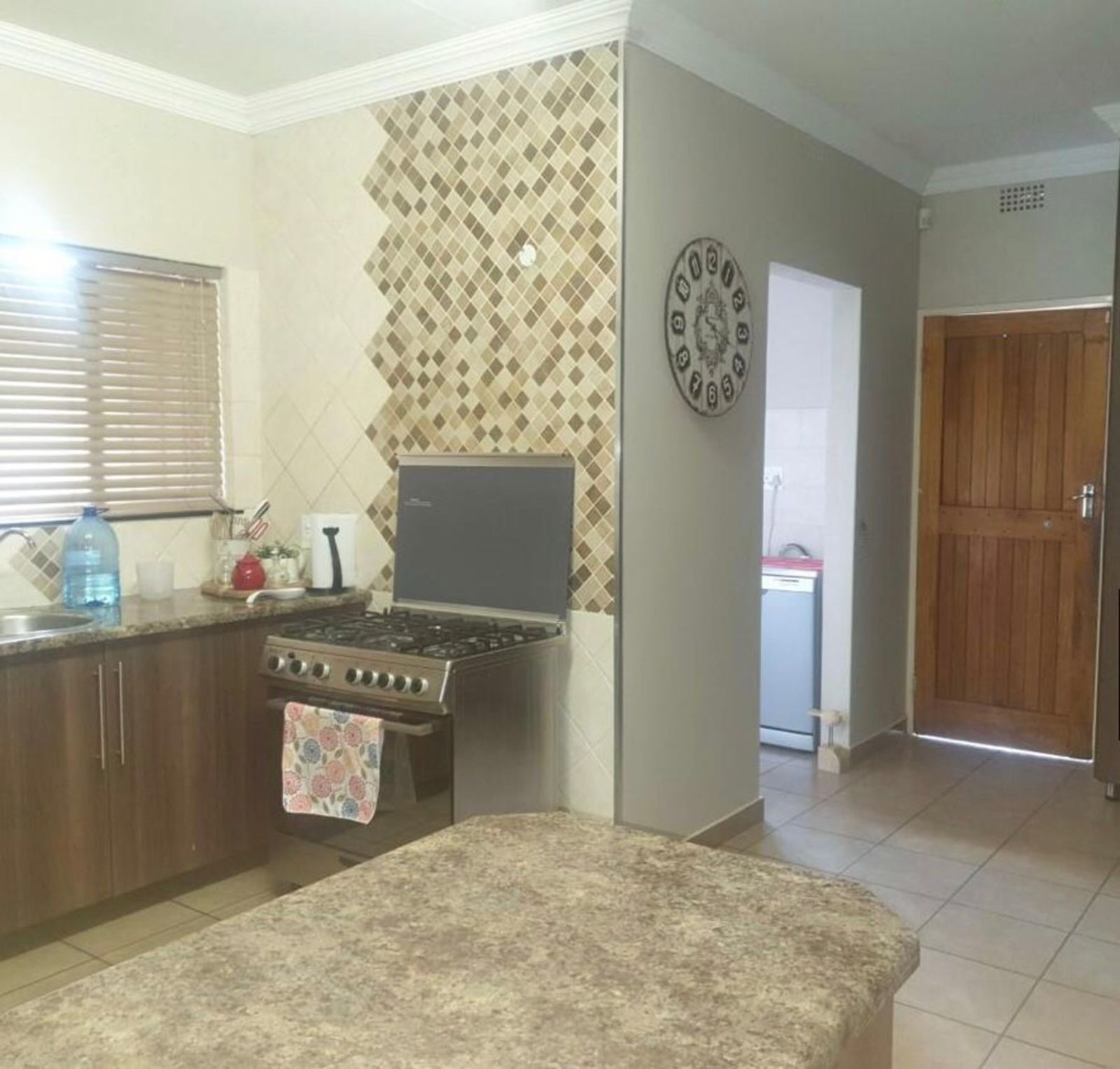 The heart of the home is the spacious modern kitchen, fitted with granite countertops, ample cupboard space, and complemented by a separate laundry/scullery for added convenience.