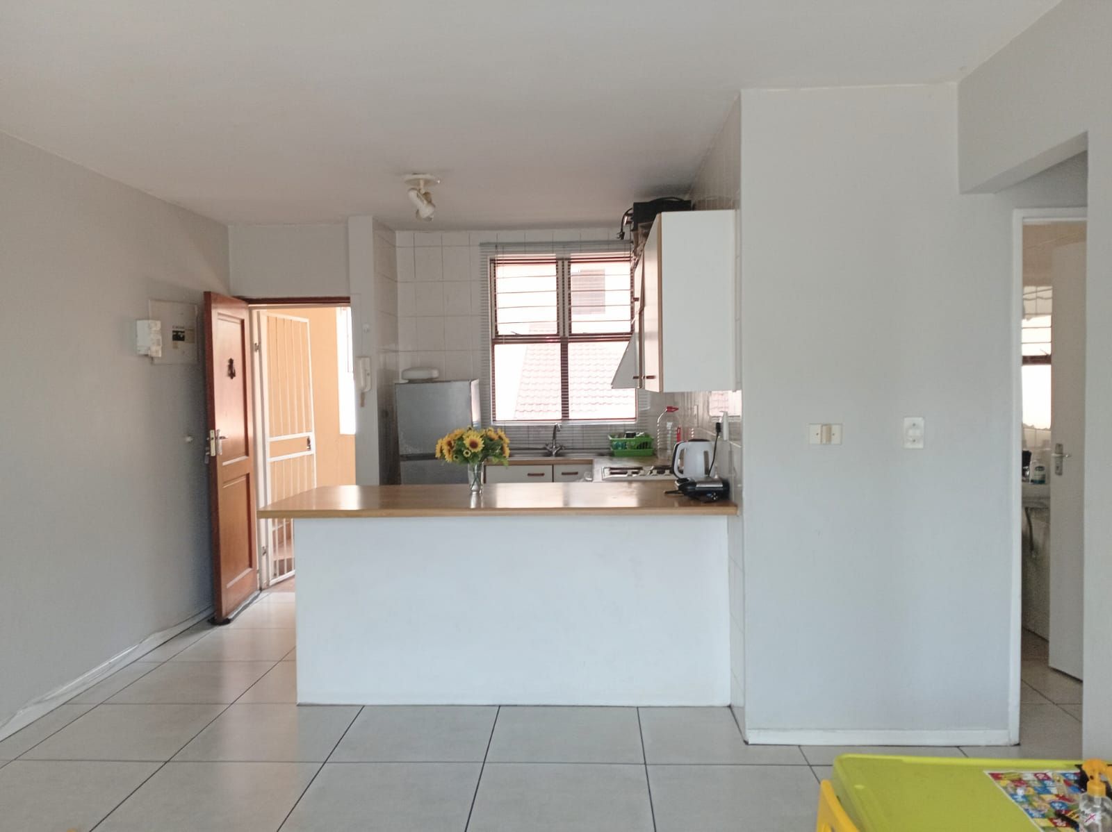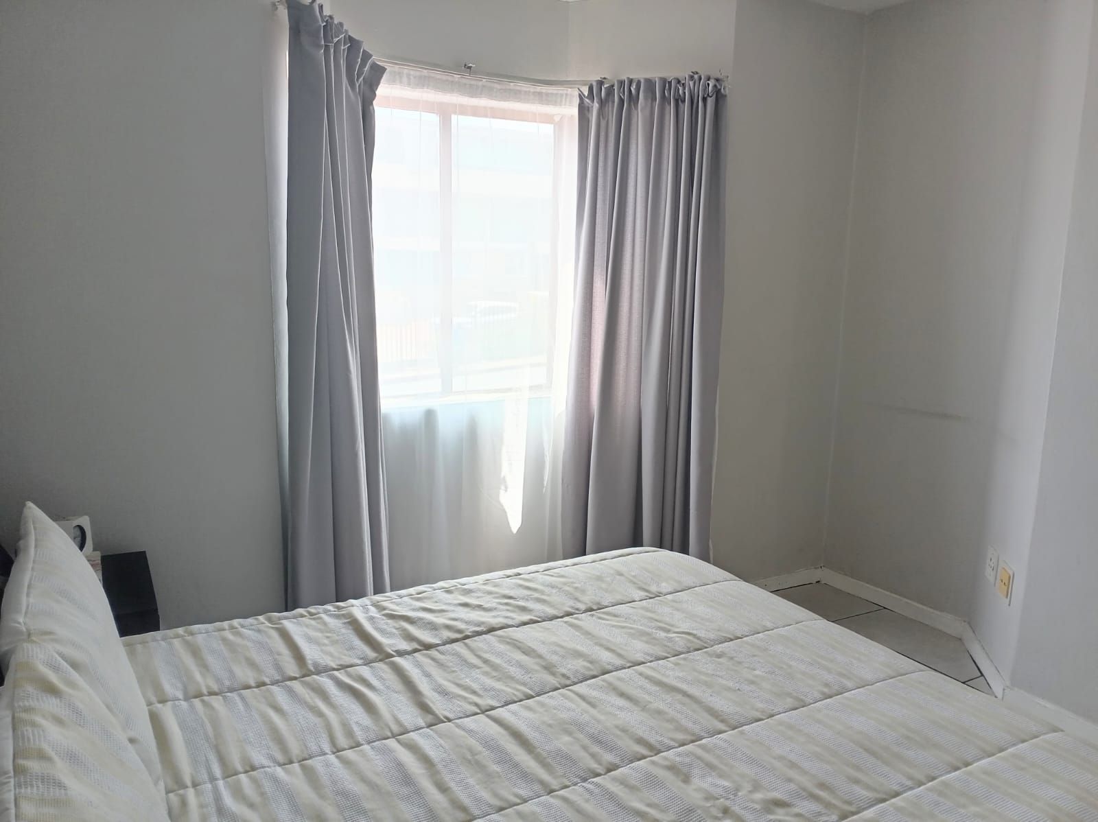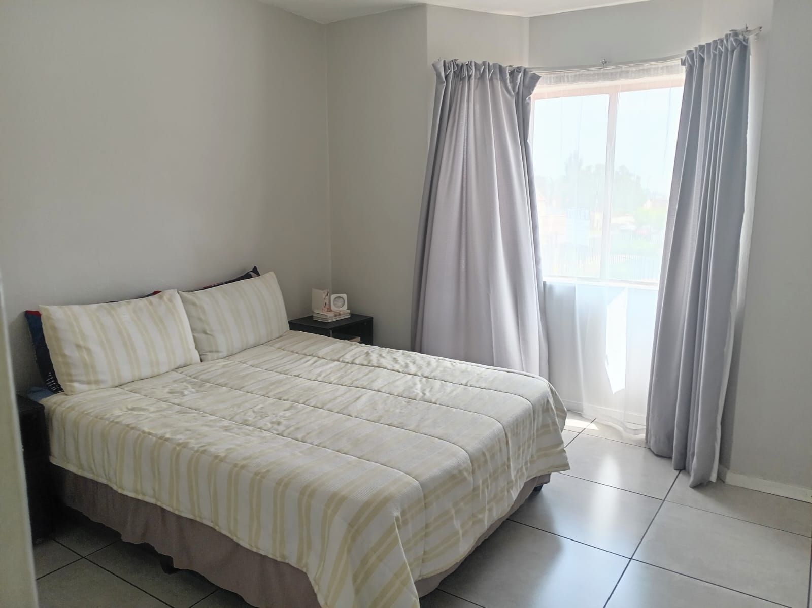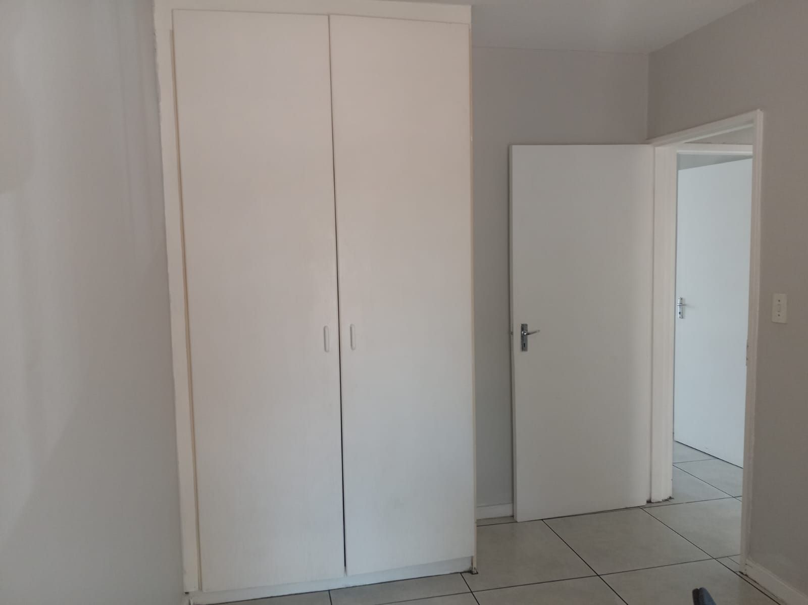 This unit offers two well-sized bedrooms, both fitted with built-in cupboards. The main bedroom faces the main road, allowing plenty of natural light to flood the space, creating a bright and airy atmosphere. The entire apartment is beautifully tiled, adding a clean, modern finish throughout.